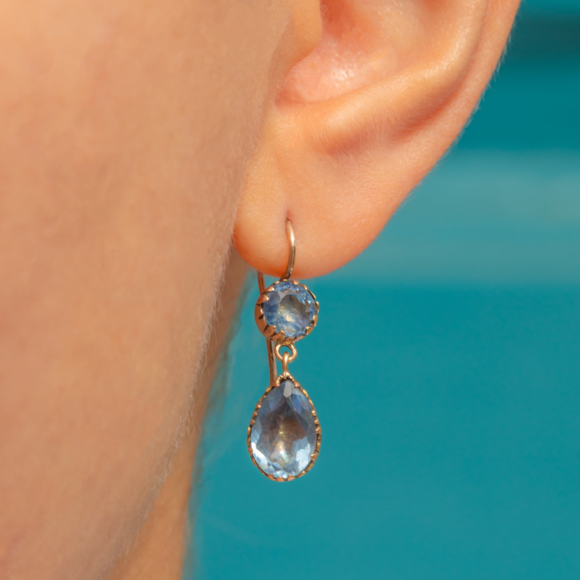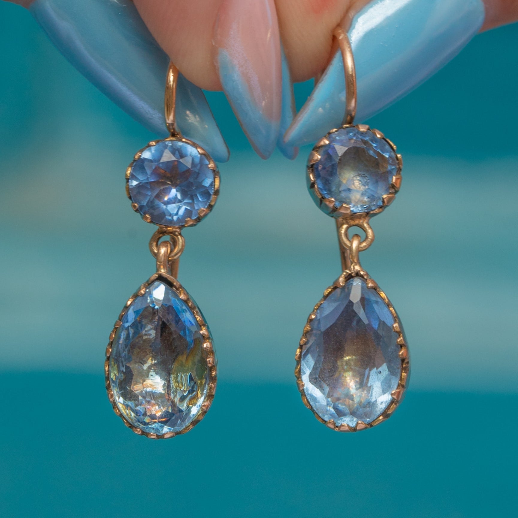 With closed backs, the stones are set in glossy 9ct Gold; the warmth of the Gold effortlessly complements the cool tones of the aqua blue Paste. Dancing with movement as they suspend from elongated hooks, these Georgian earrings are a resplendent antique pair to add to your collection.