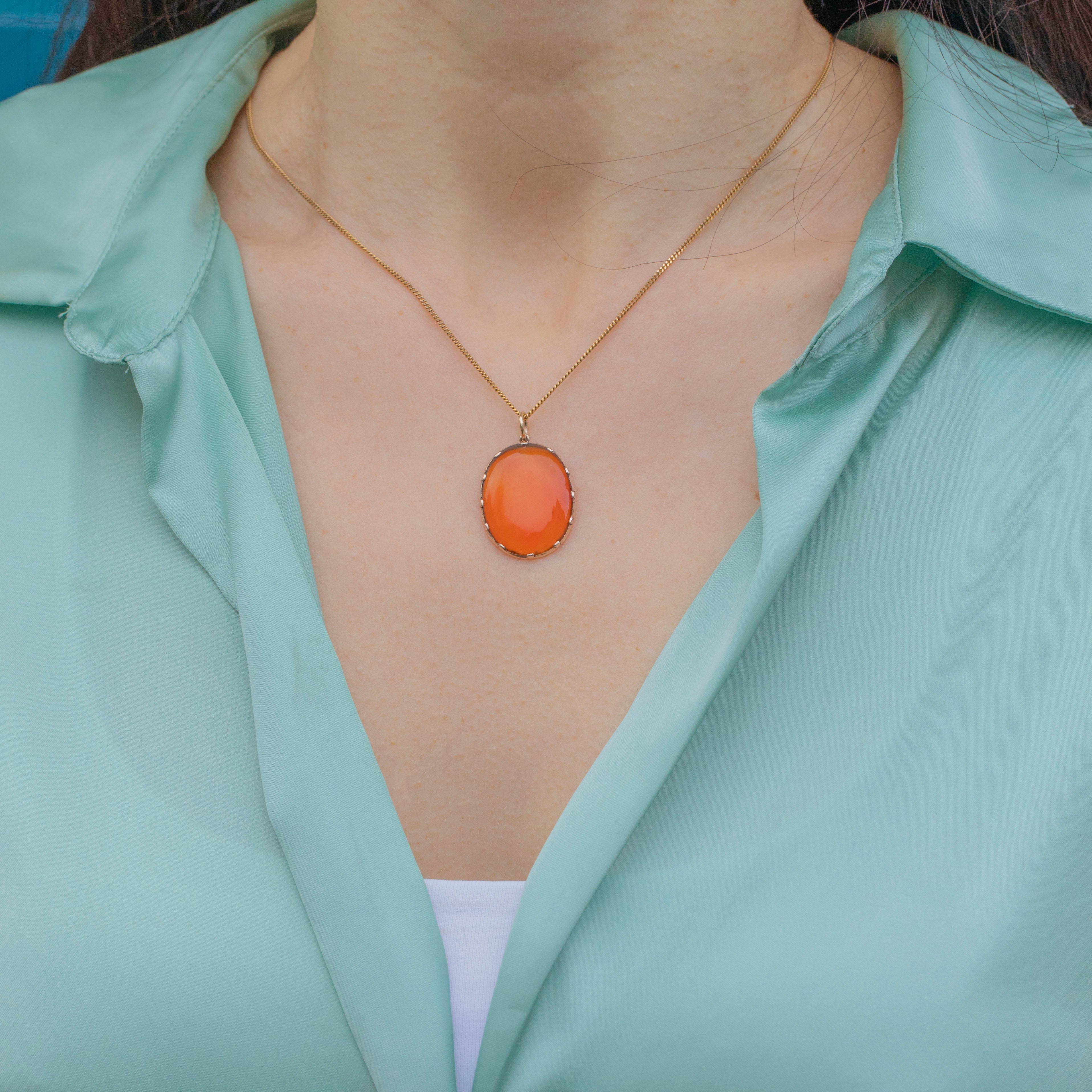 EXCELLENT. This Georgian 9ct Gold Carnelian pendant is in incredible condition. The hue of the Carnelian is exquisite, with a rich and delectable tone of orange that will turn every head! There are no chips or scratches to the surface of the Carnelian which is securely set, promising many more years of enjoyable wear.