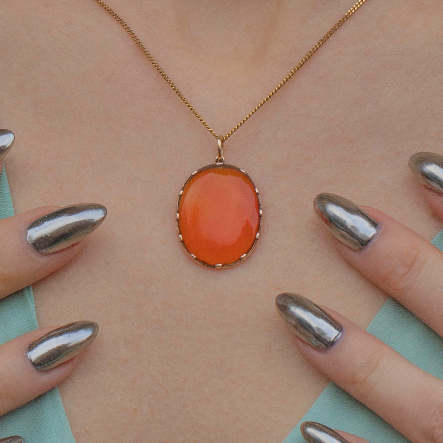 Add a touch of antique charm to any outfit with this captivating Georgian 9ct Gold Carnelian pendant! Securely displayed within classically Georgian pie crust settings sits a smooth Carnelian cabochon, with warm orange tones that beautifully complement the rich hue of the 9ct Gold.