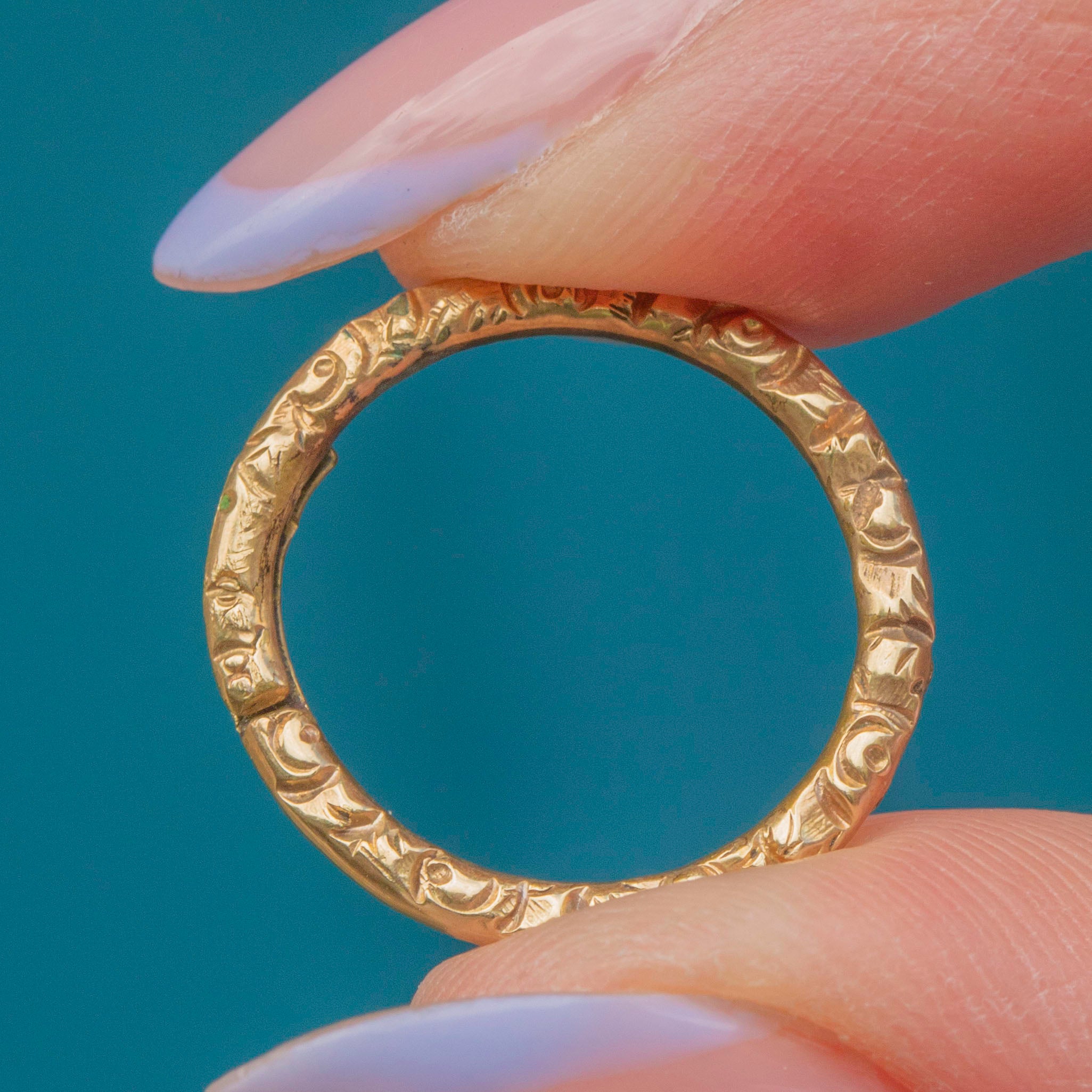 This is a lovely Georgian 9ct Gold chased split ring! Featuring stunning chased detailing adorning the entire circumference, this solid Gold split ring is the perfect antique piece for your collection.