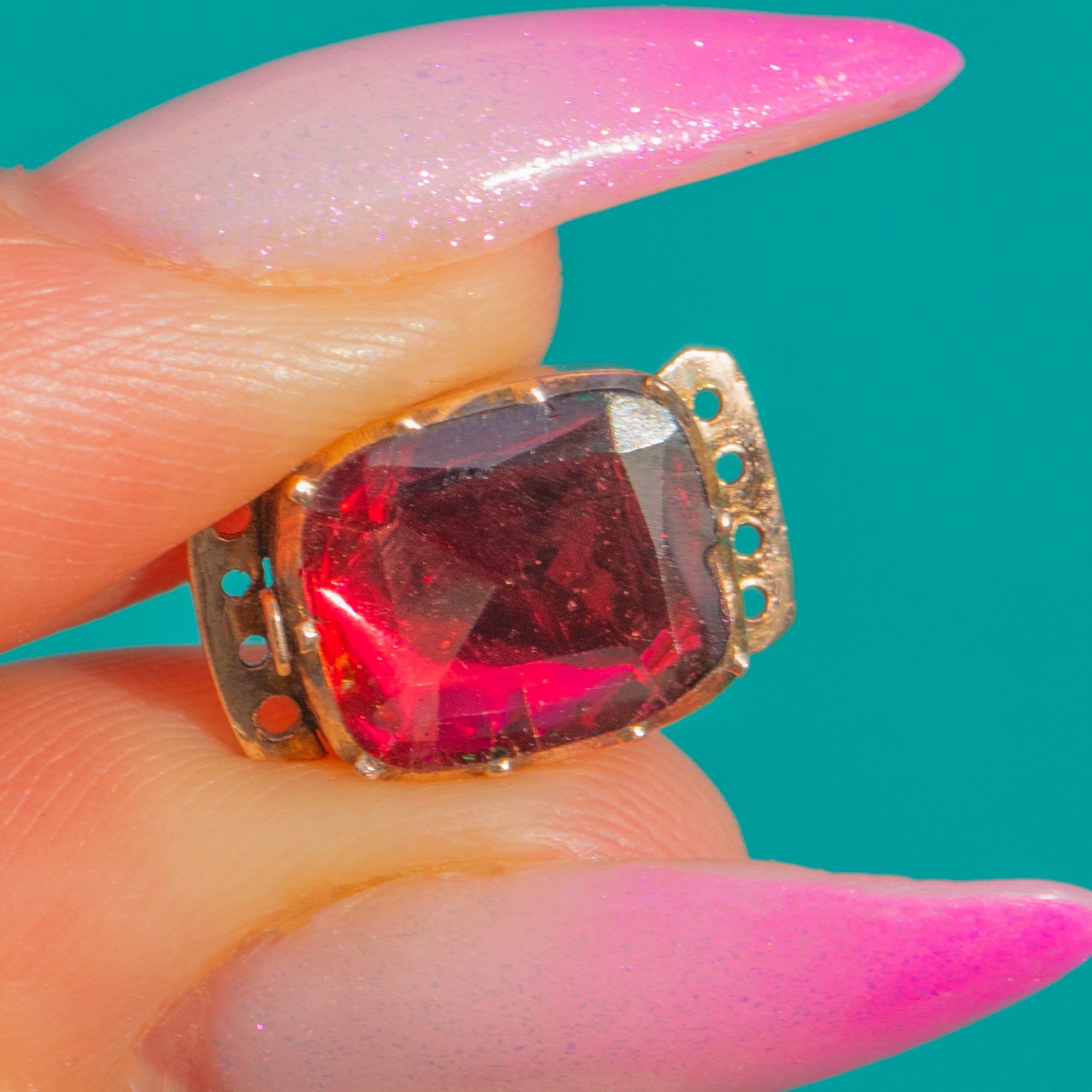 EXCELLENT: The flat cut Garnet presents with a rich colour and only minor age-consistent surface wear visible under magnification. The 9ct Gold setting is secure and well preserved with light, sympathetic wear. No evidence of later restoration.