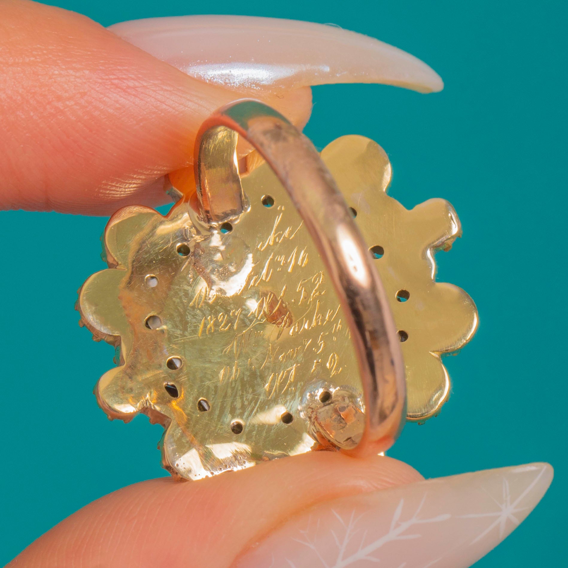Generous proportions give this piece a refined statement presence, with artisanal nuances that celebrate its hand-made origin. Thoughtfully converted from a brooch for modern wear, it also bears the inscription “July 16th 1827, W Parker”, adding a touch of heartfelt provenance to its romantic allure.
