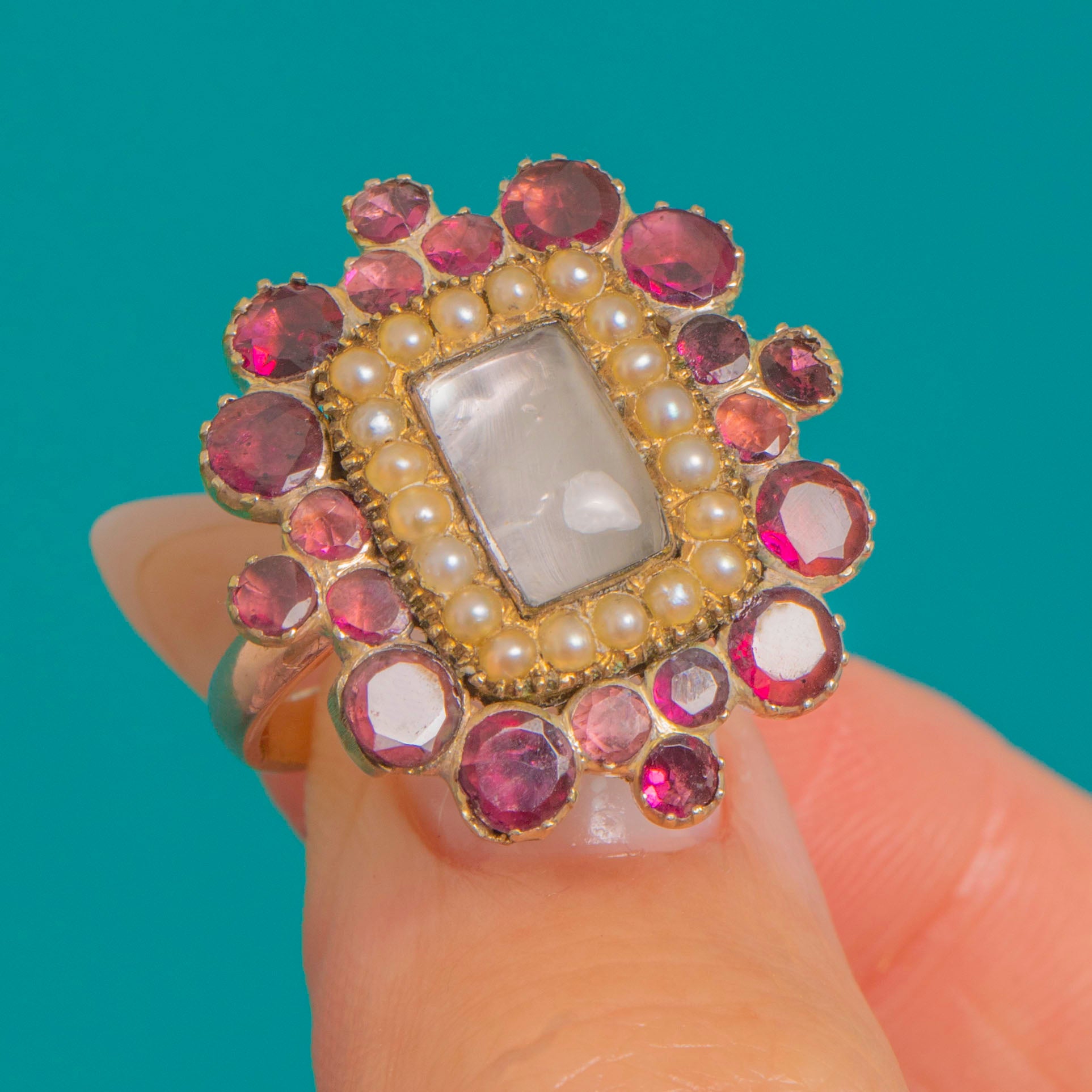 A sumptuous Georgian cluster ring, c.1827, showcasing a luminous rectangular Moonstone at the heart, encircled by a delicate garland of Natural Pearls and finished with a bold scalloped halo of foiled, flat-cut Garnets glowing in rich raspberry hues. The crimped, cut-down collets and closed backs create that unmistakable early 19th-century sparkle, all hand-crafted in 9ct Gold.