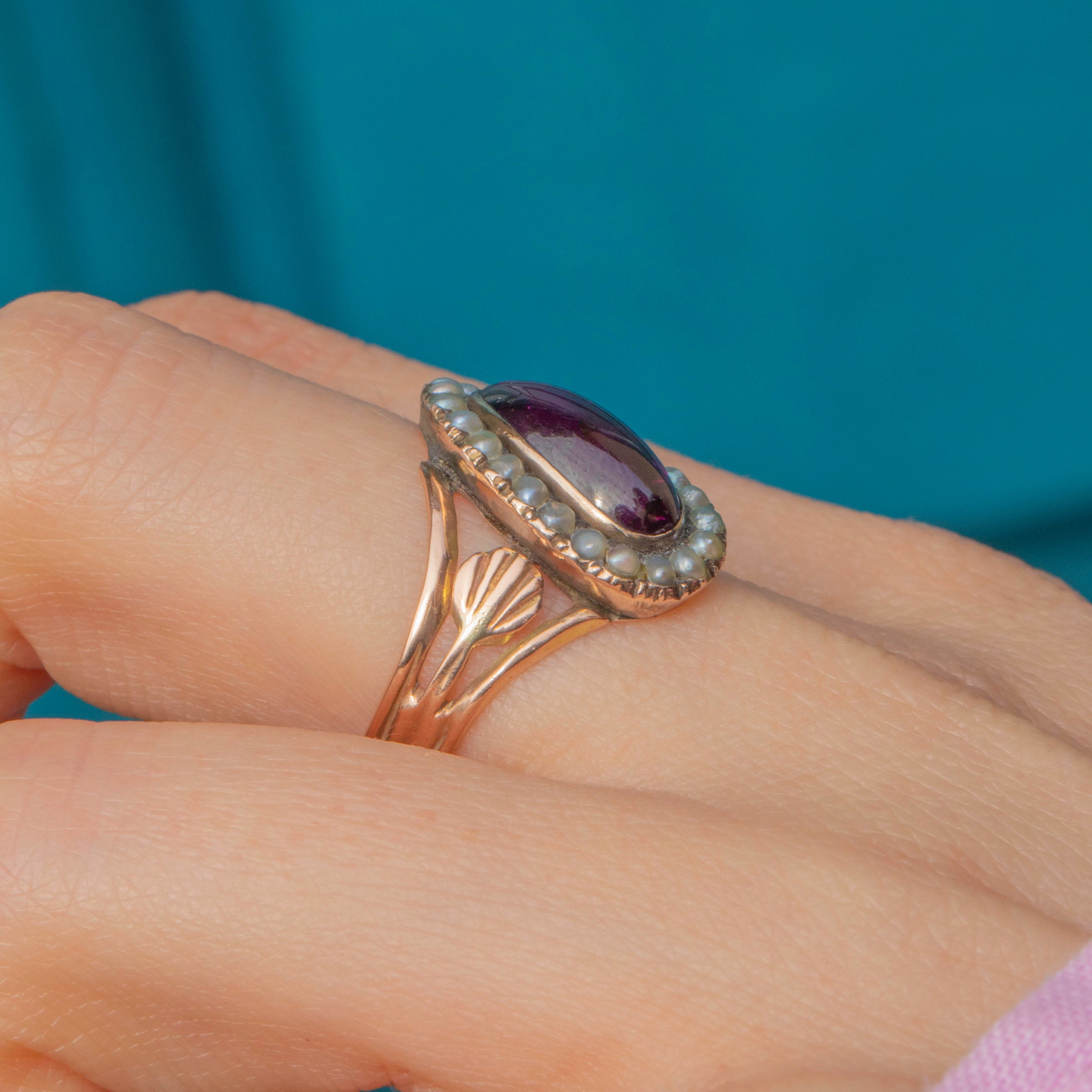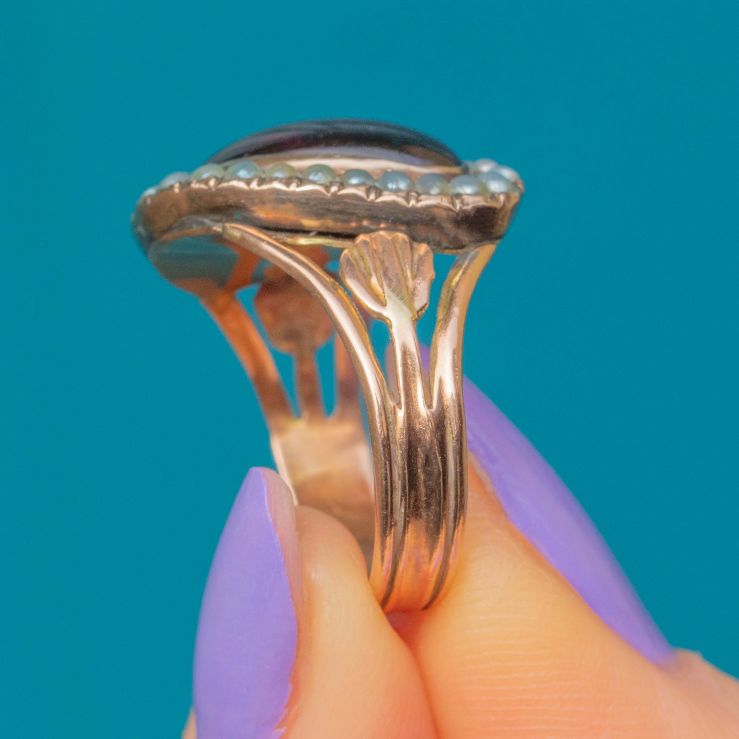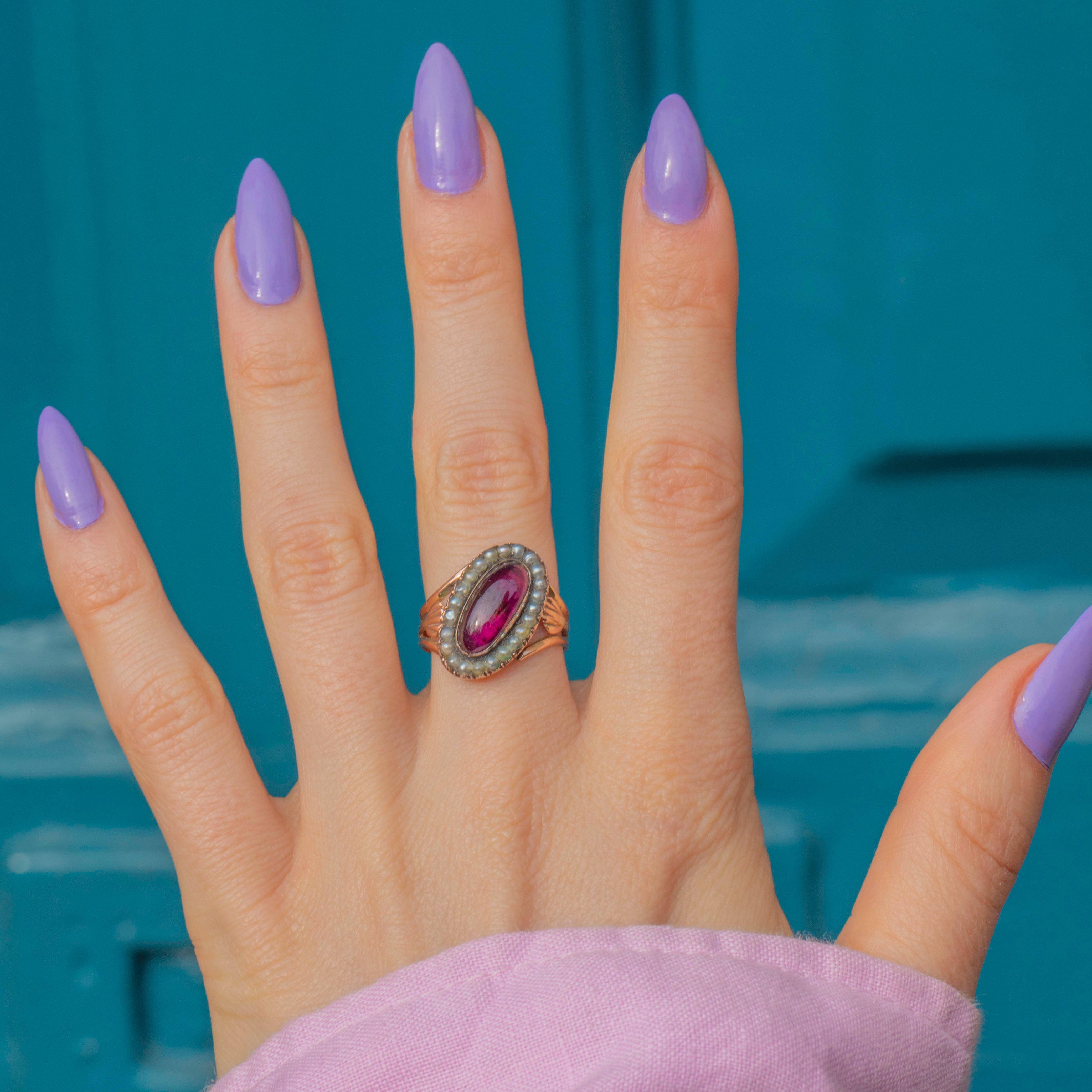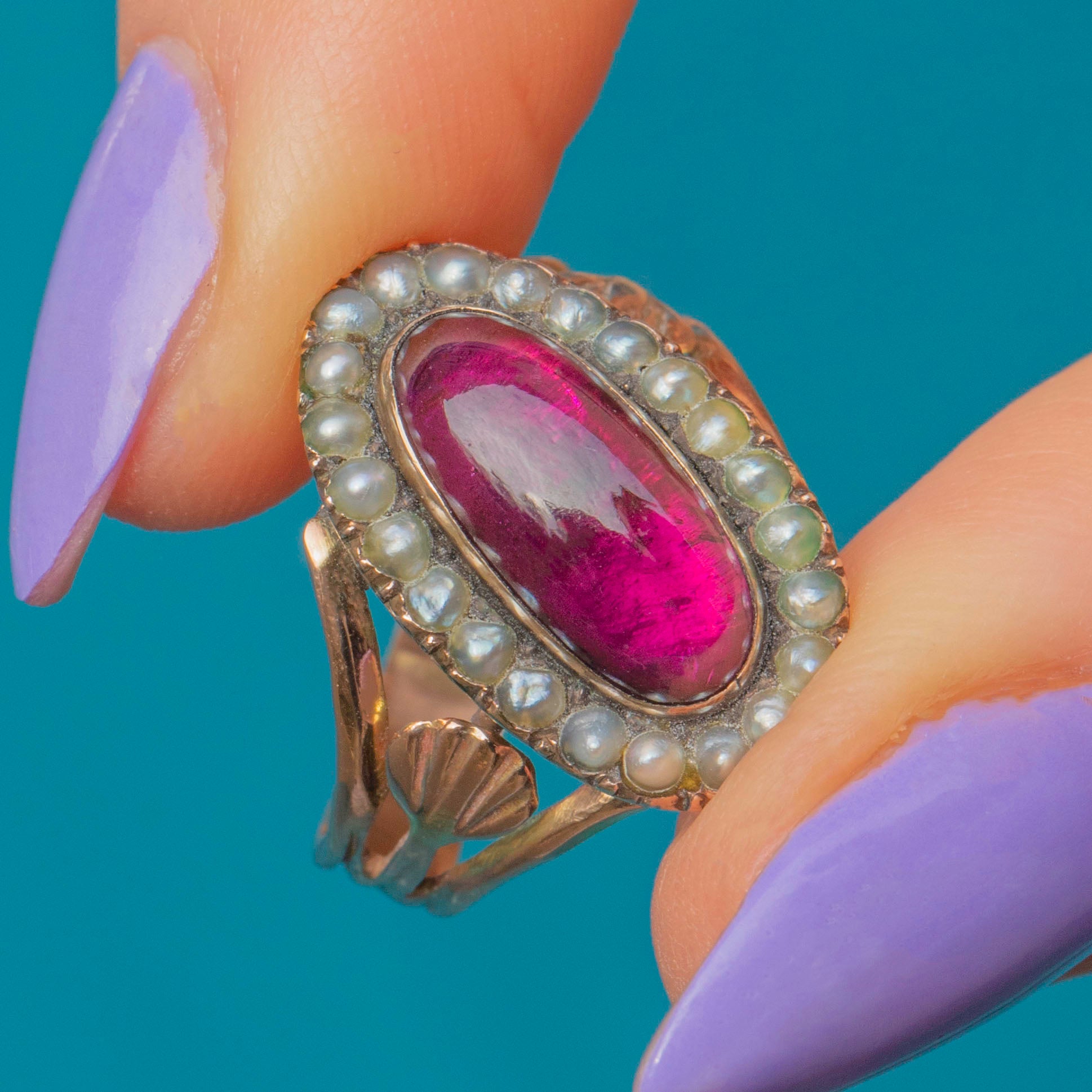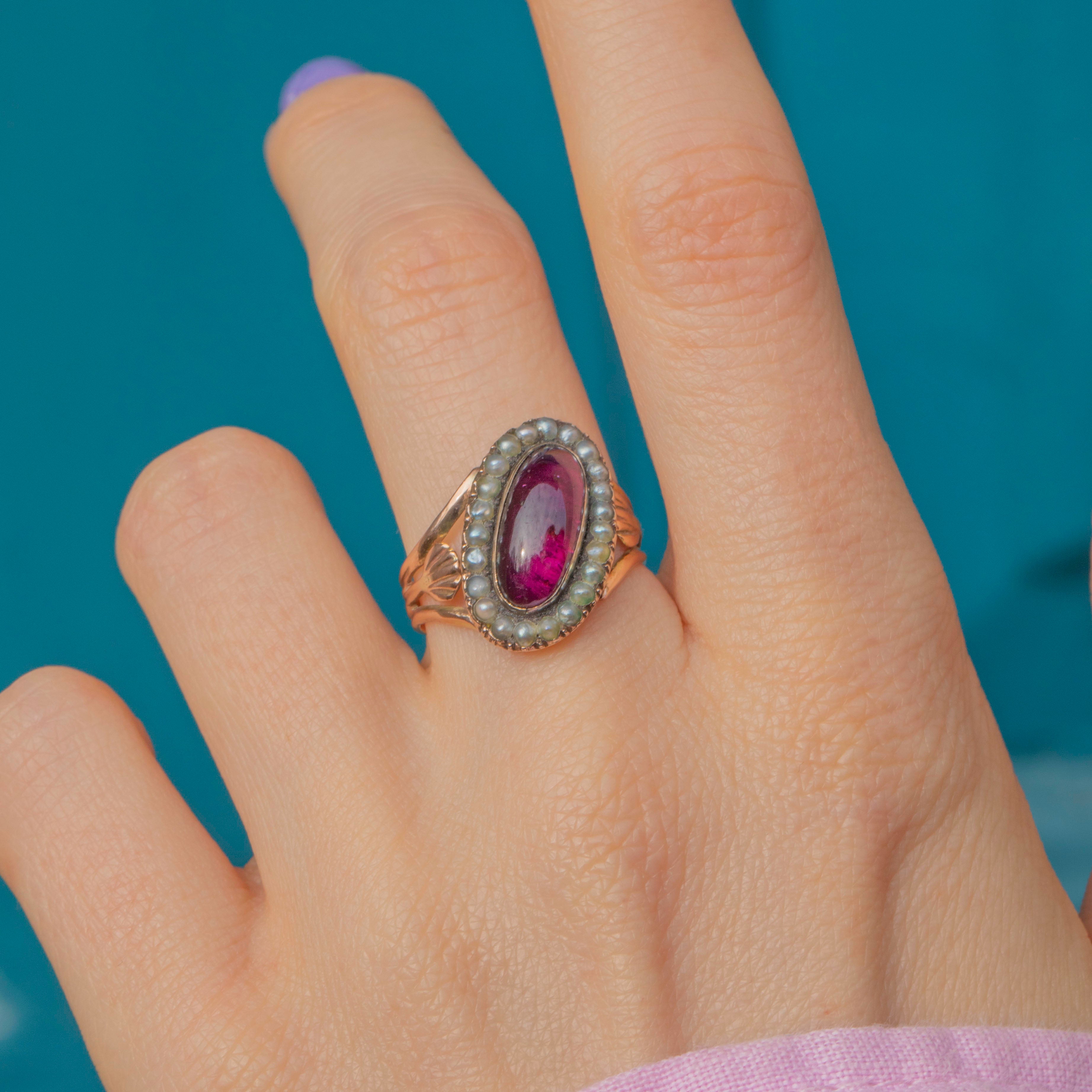 This striking Georgian 9ct Gold Garnet Seed Pearl twist ring will make a bold impact adorning your hand! The smoothly cut 2.95ct Garnet cabochon has been foiled, shimmering with bright fuschia hues as it moves in the light. A halo of silvery Seed Pearls wrap elegantly around the Garnet, creating a stand-out cluster and providing exceptional finger coverage.