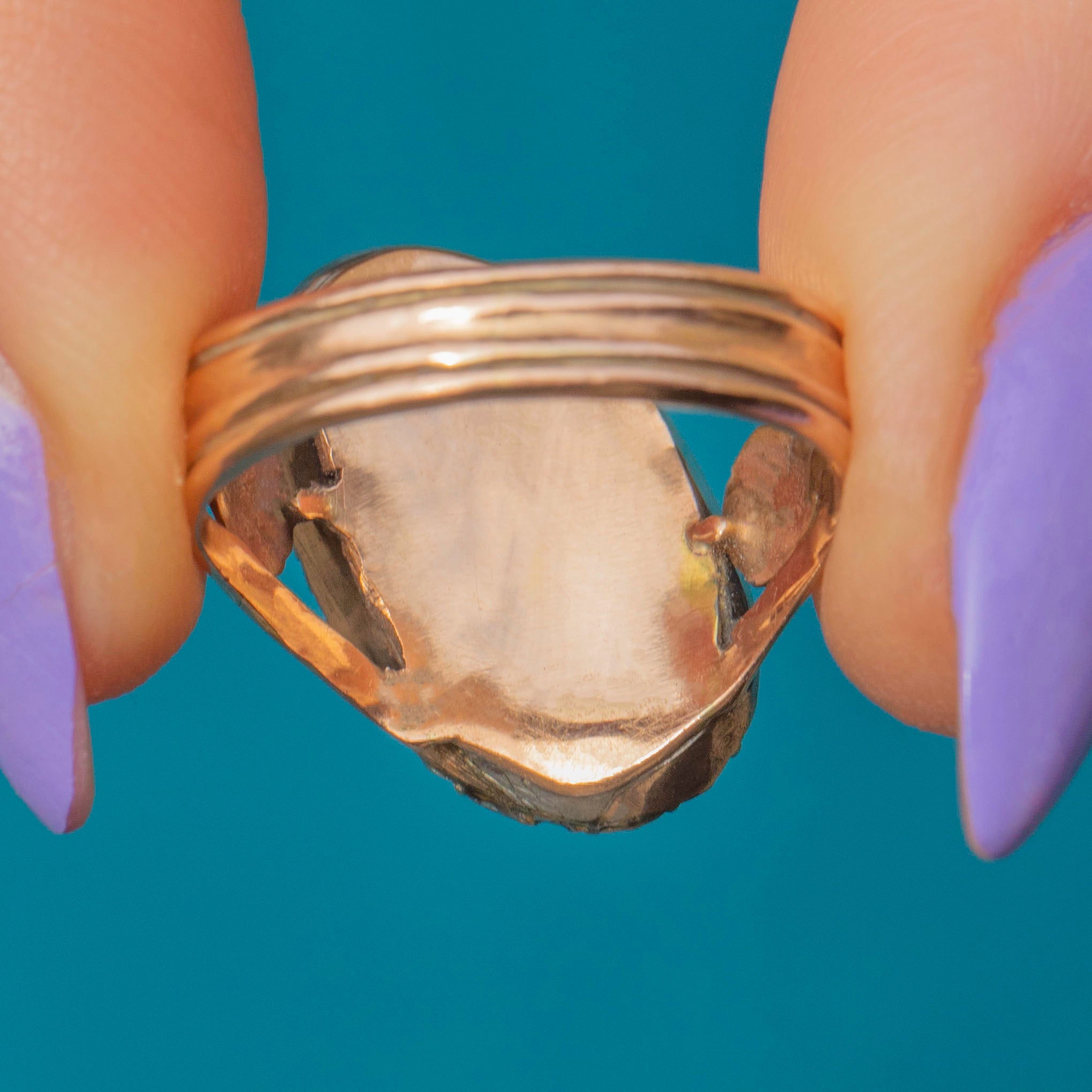 The off-centre placement of the gemstone cluster creates a visually intriguing piece, held in place by a wide band that feels comfortable and robust, with ornate leaf details adding a decorative finish to the shoulders. This is a unique and remarkably preserved piece of Georgian jewellery, guaranteed to be admired for generations to come!