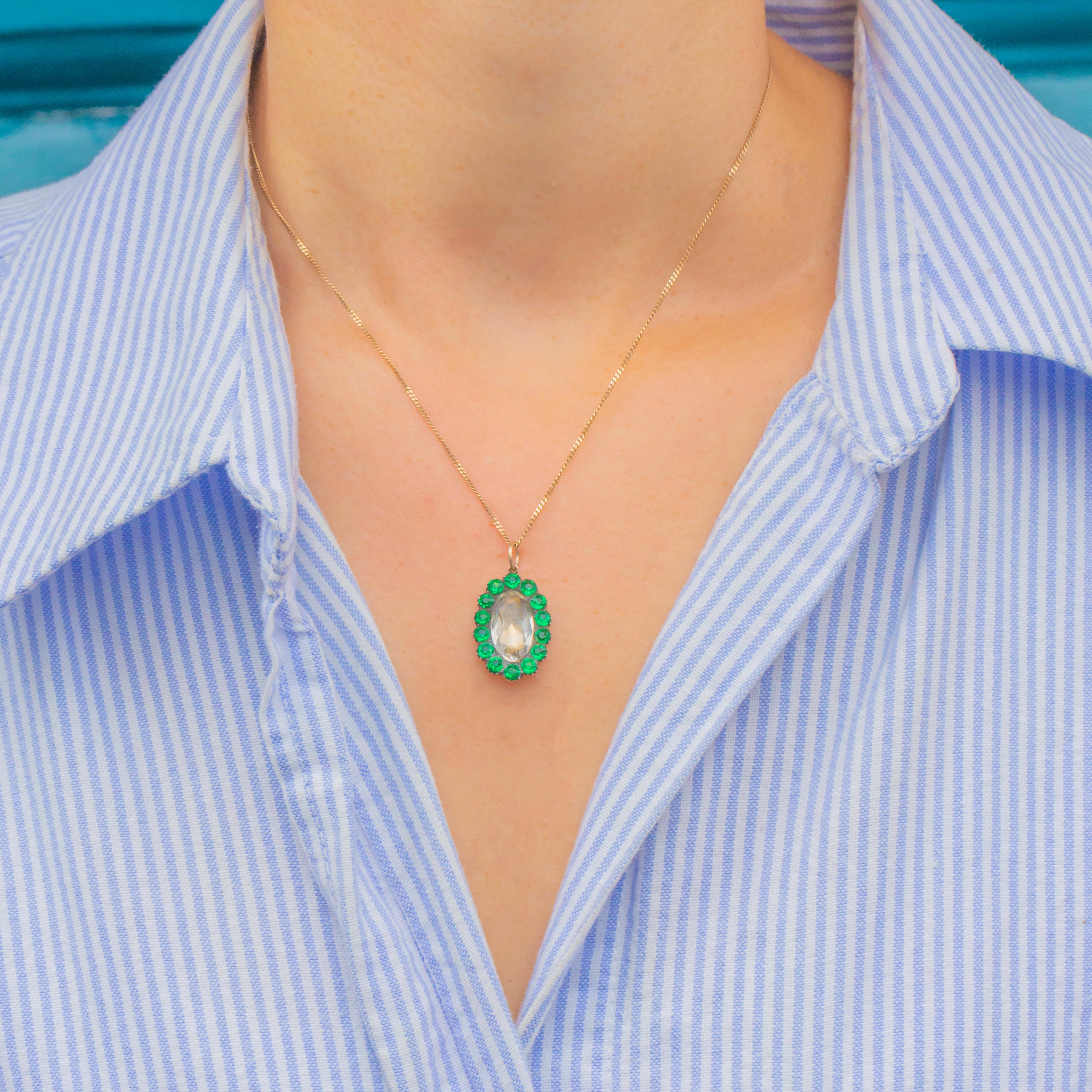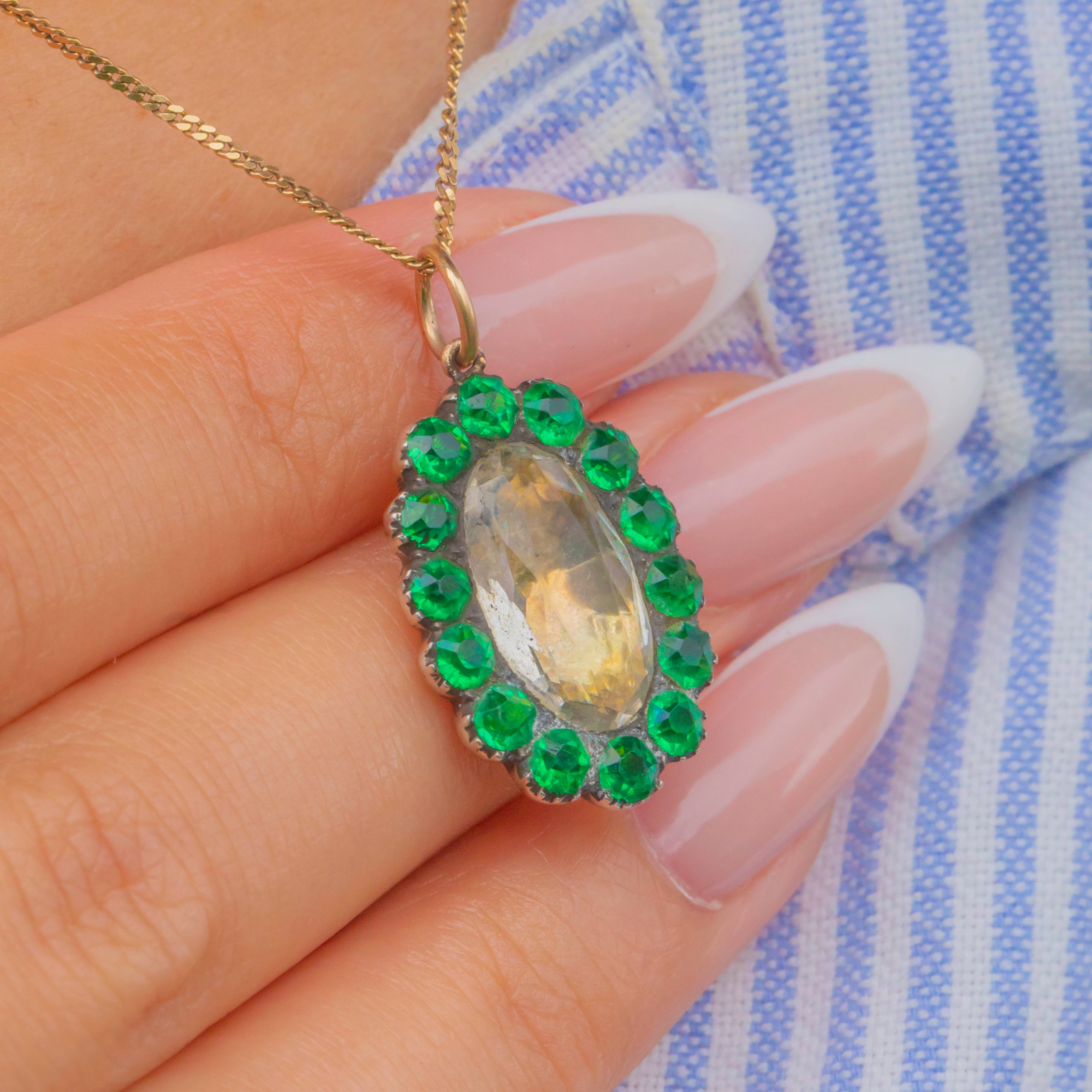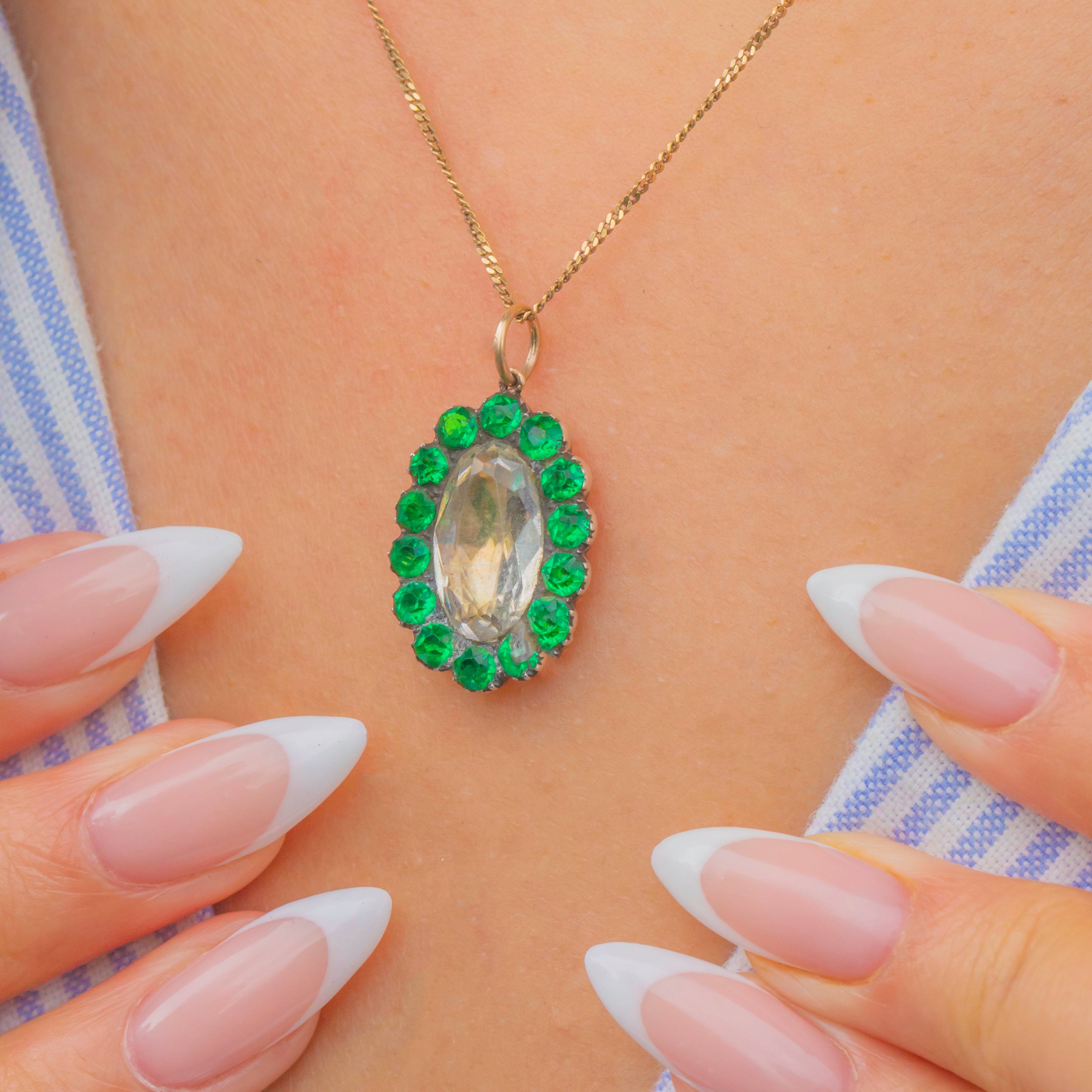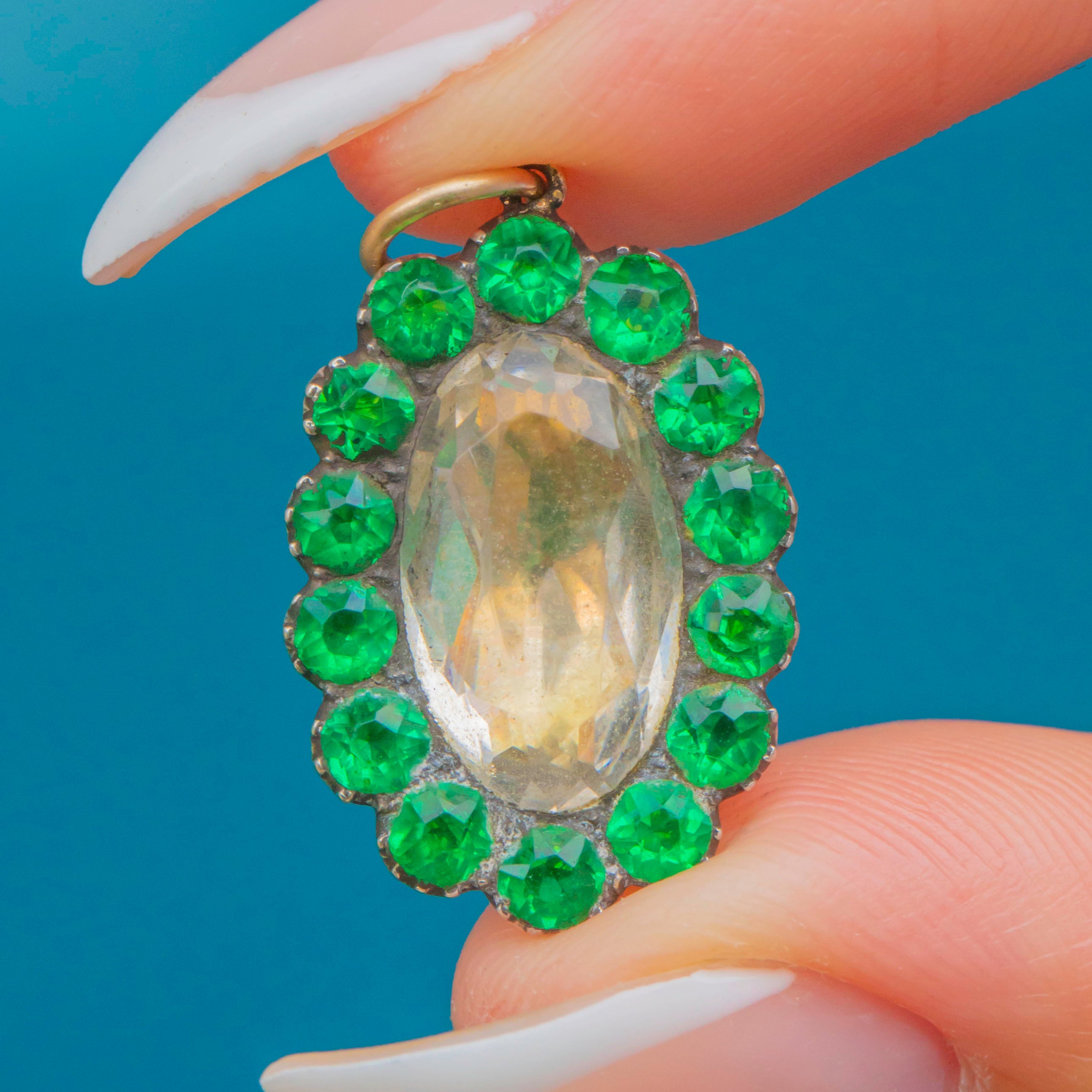 A charming Georgian cluster set with vivid Green Paste surrounding a luminous White Paste centre. Crafted in 9ct Gold with traditional crimped Silver collet settings, the contrast of warm metal and bright stones gives this petite treasure wonderful sparkle and period character.