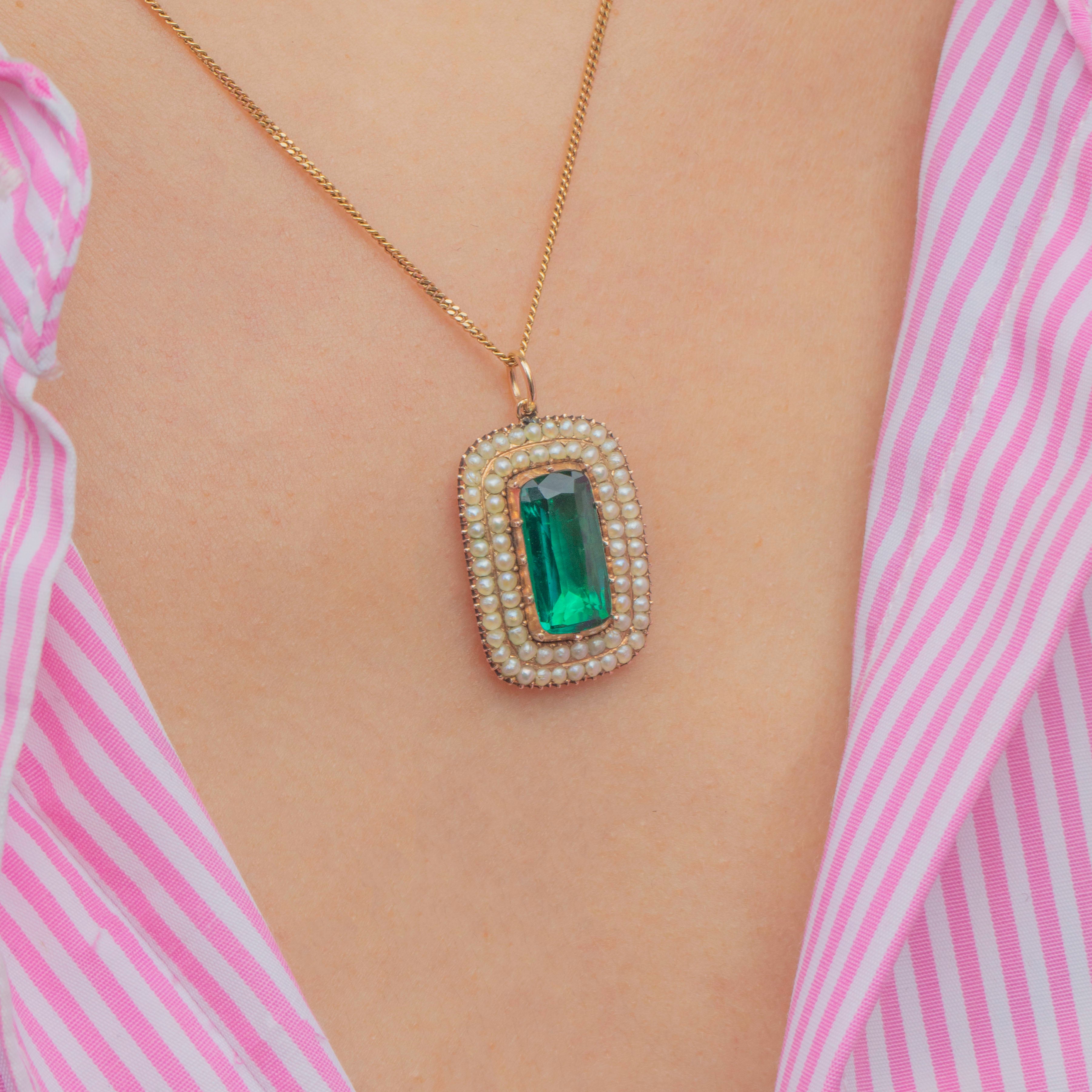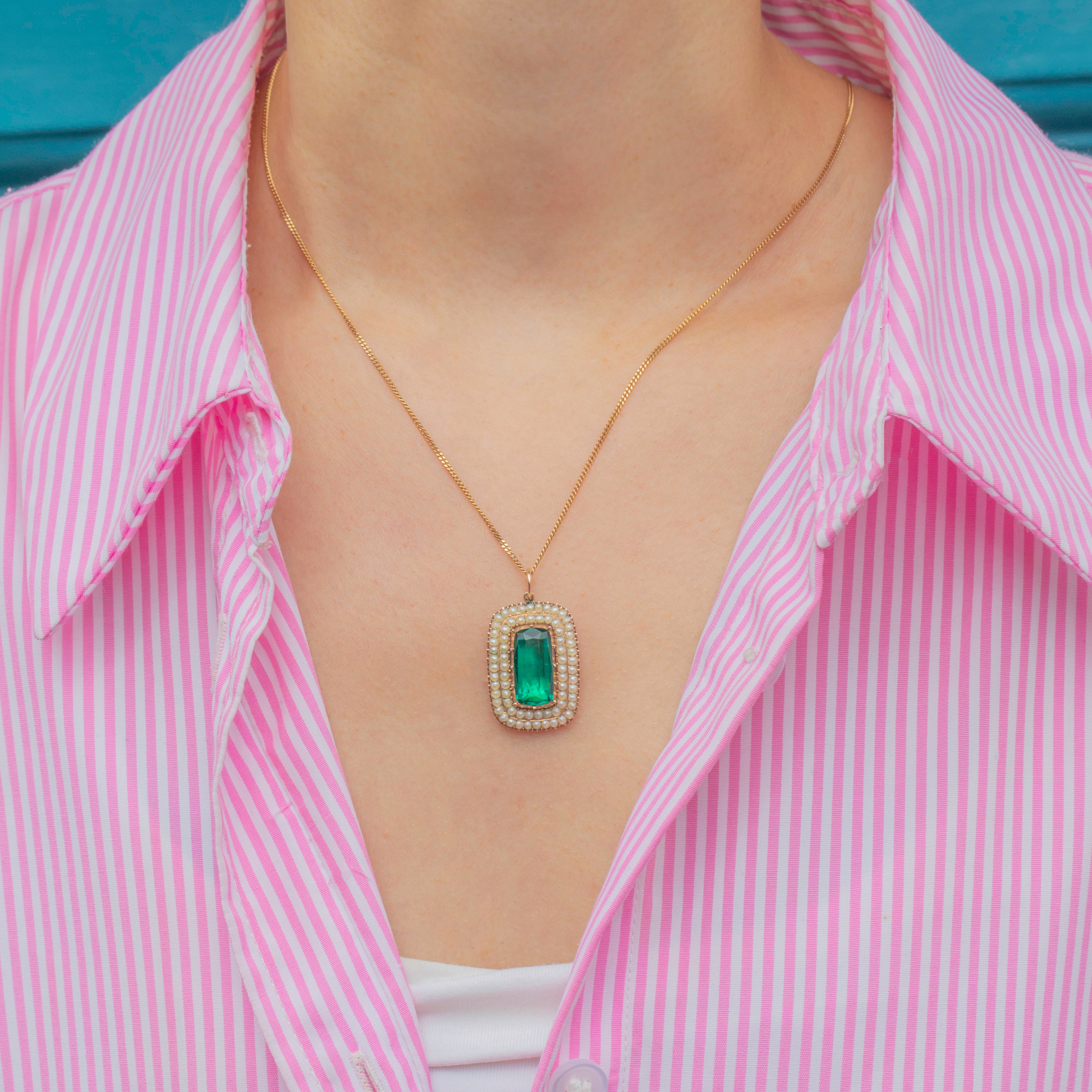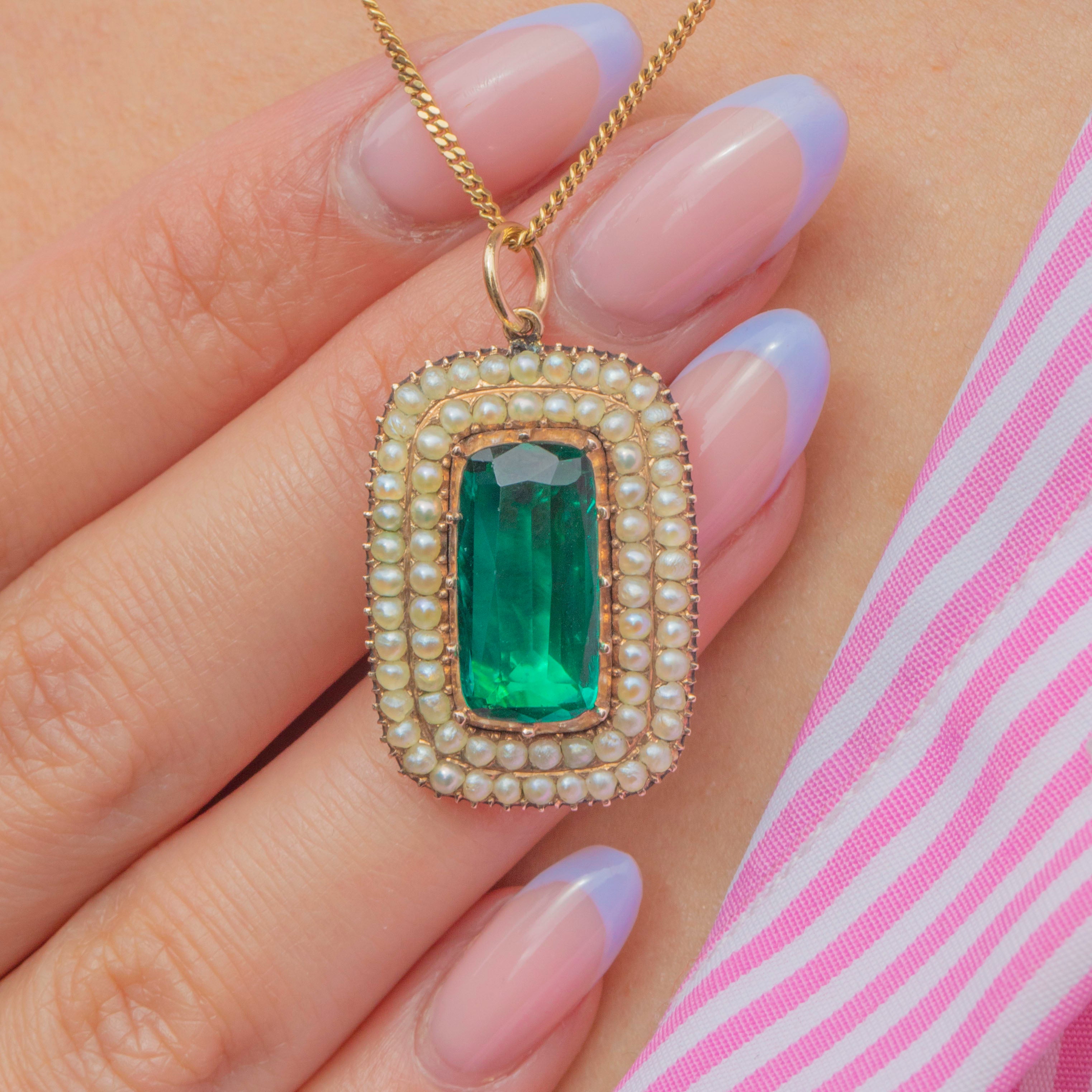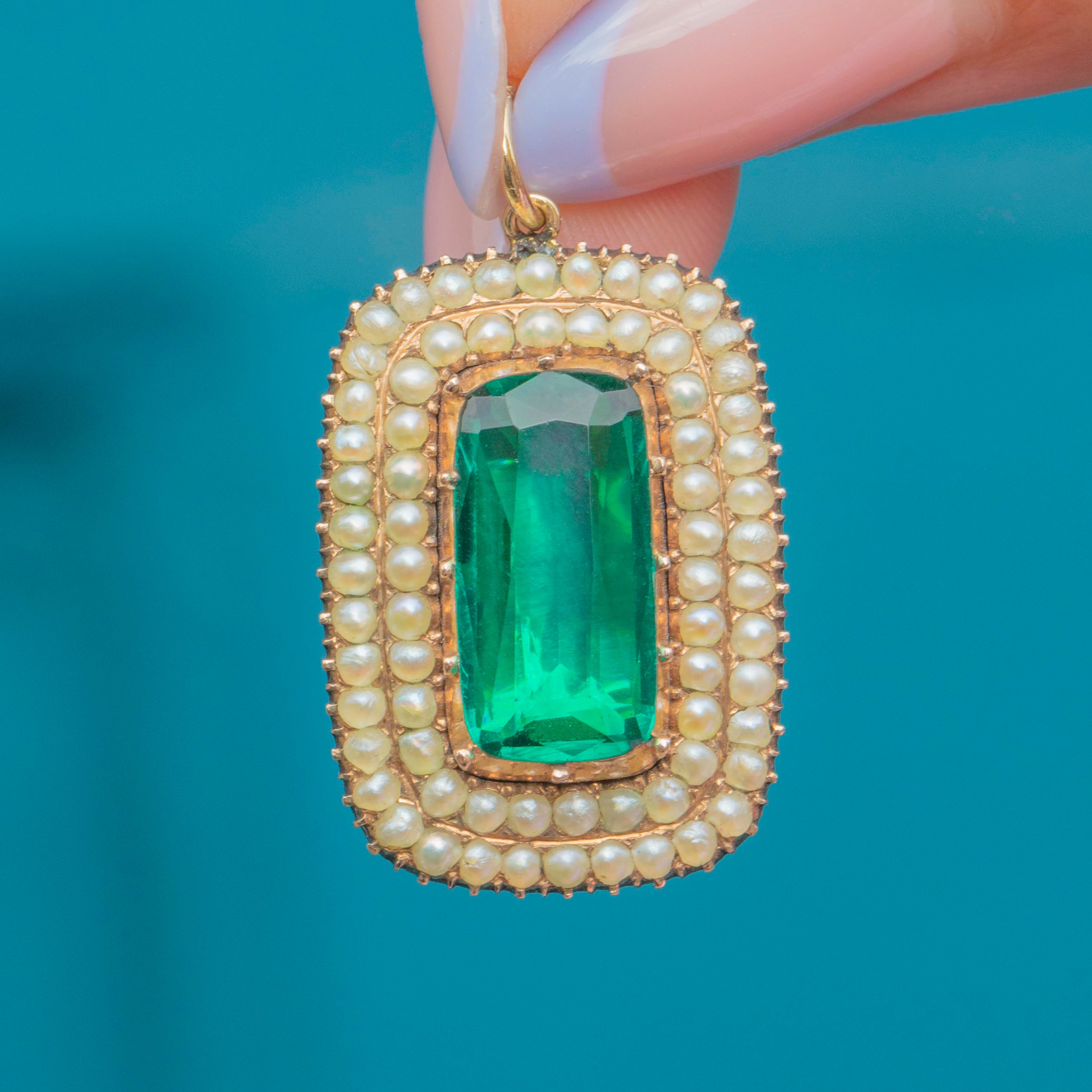 This Georgian 9ct Gold Green Paste Pearl cluster pendant will inject some elegance into your collection! The Paste has a lovely dark verdant hue with crisp facets, haloed by two row of creamy Pearls creating an eye-catching design.