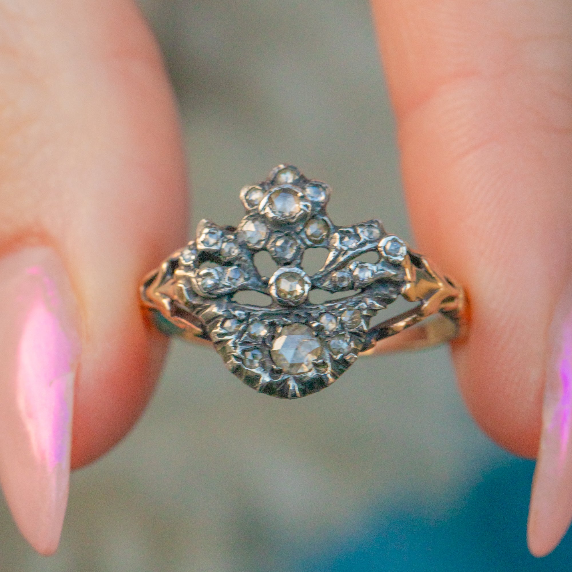 An exquisite and quintessentially Georgian 15ct Gold rose-cut Diamond Grandinetti ring! Translating to 'small garden', the gorgeous ring face appears exactly that, peppered with sparkly rose-cut Diamonds set into Silver.