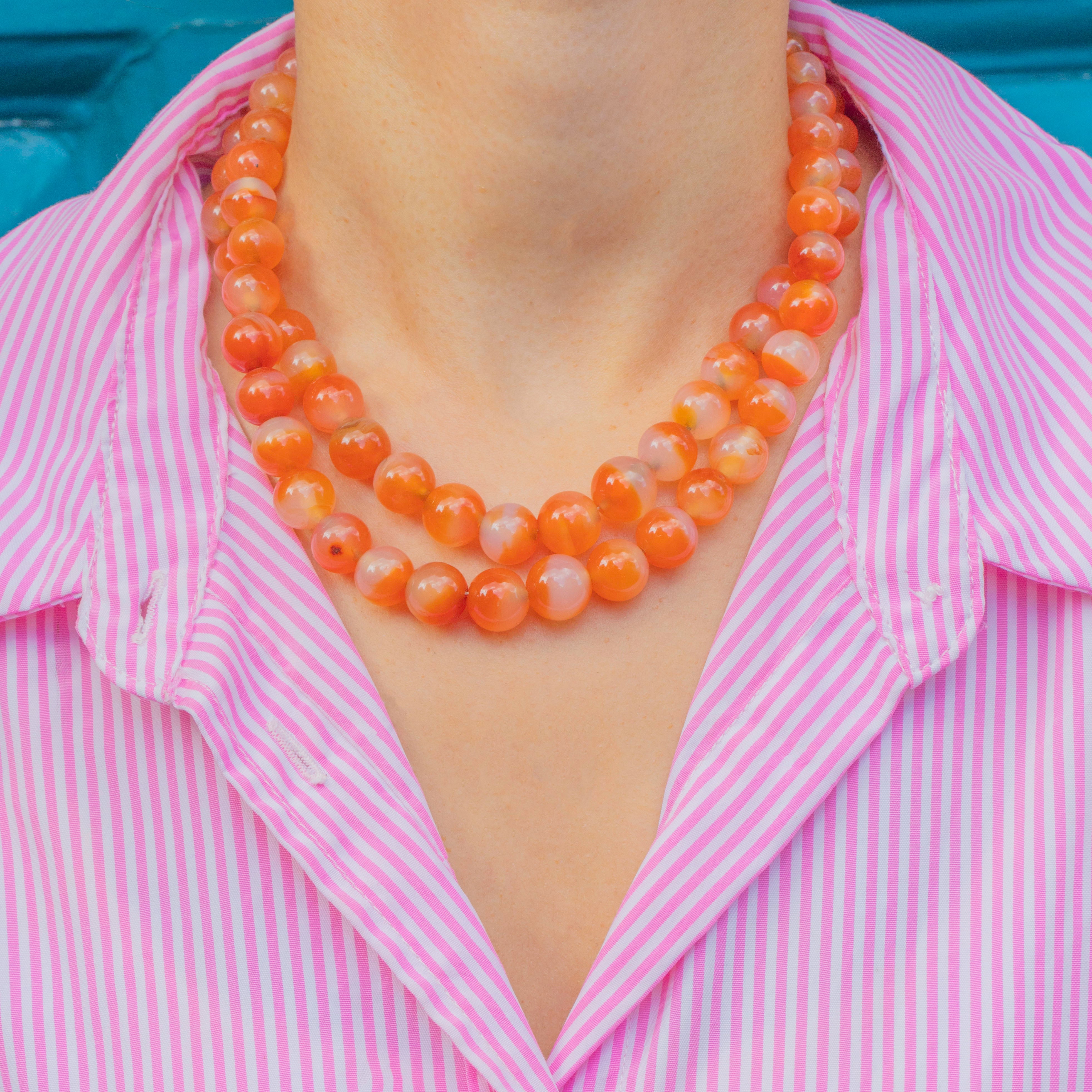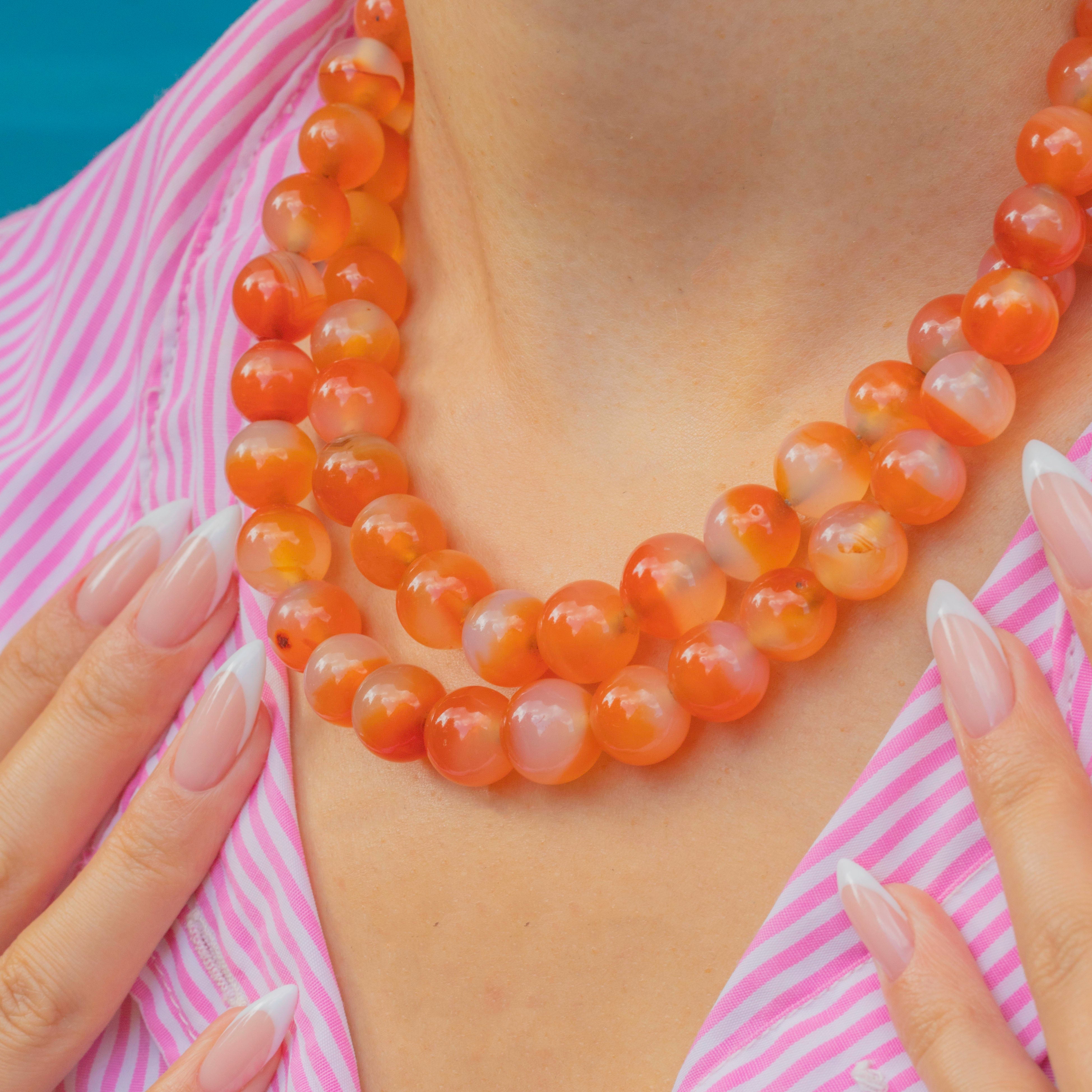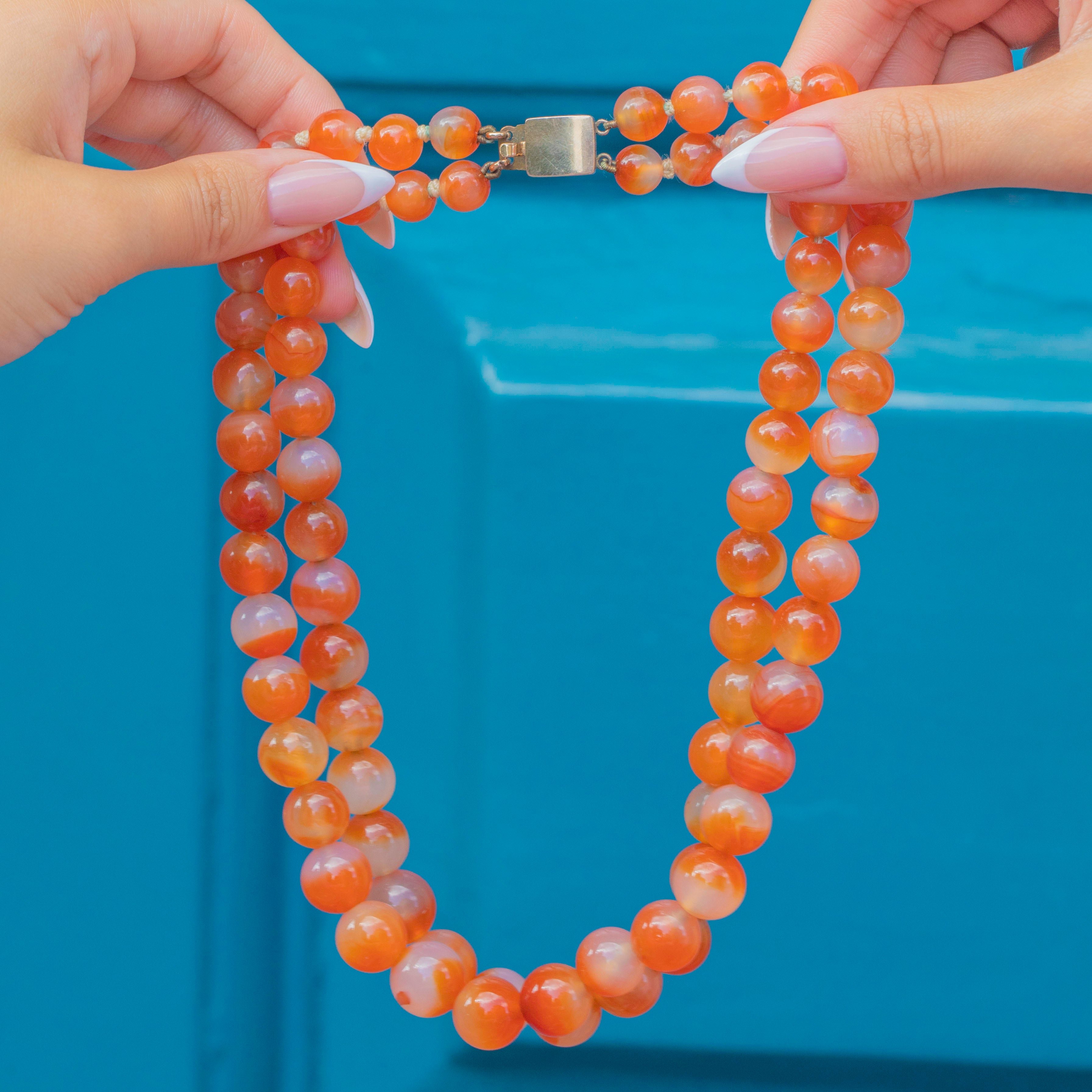 EXCELLENT: This necklace is in remarkable condition for its age. The Carnelian beads are smooth and free from chips, maintaining a vivid and consistent colour. The clasp is secure and in full working order, making the necklace ready to wear and enjoy.