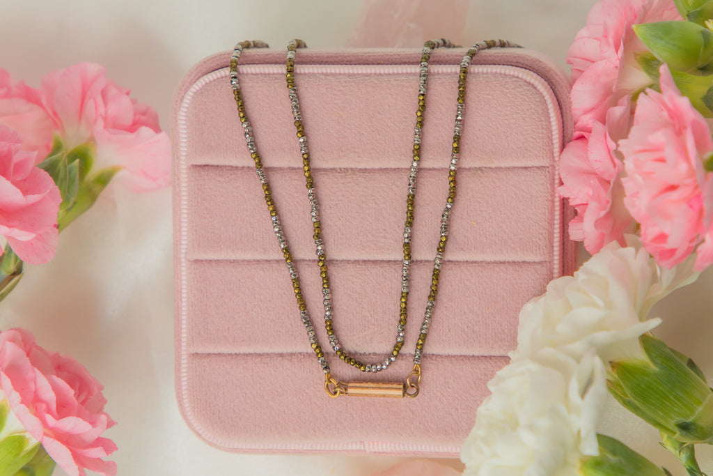 Let this rare, long Georgian Cut Steel beaded necklace do all the talking! With alternating glistening silver and olive-green Cut Steel beads, every inch of this piece exudes Georgian glamour.