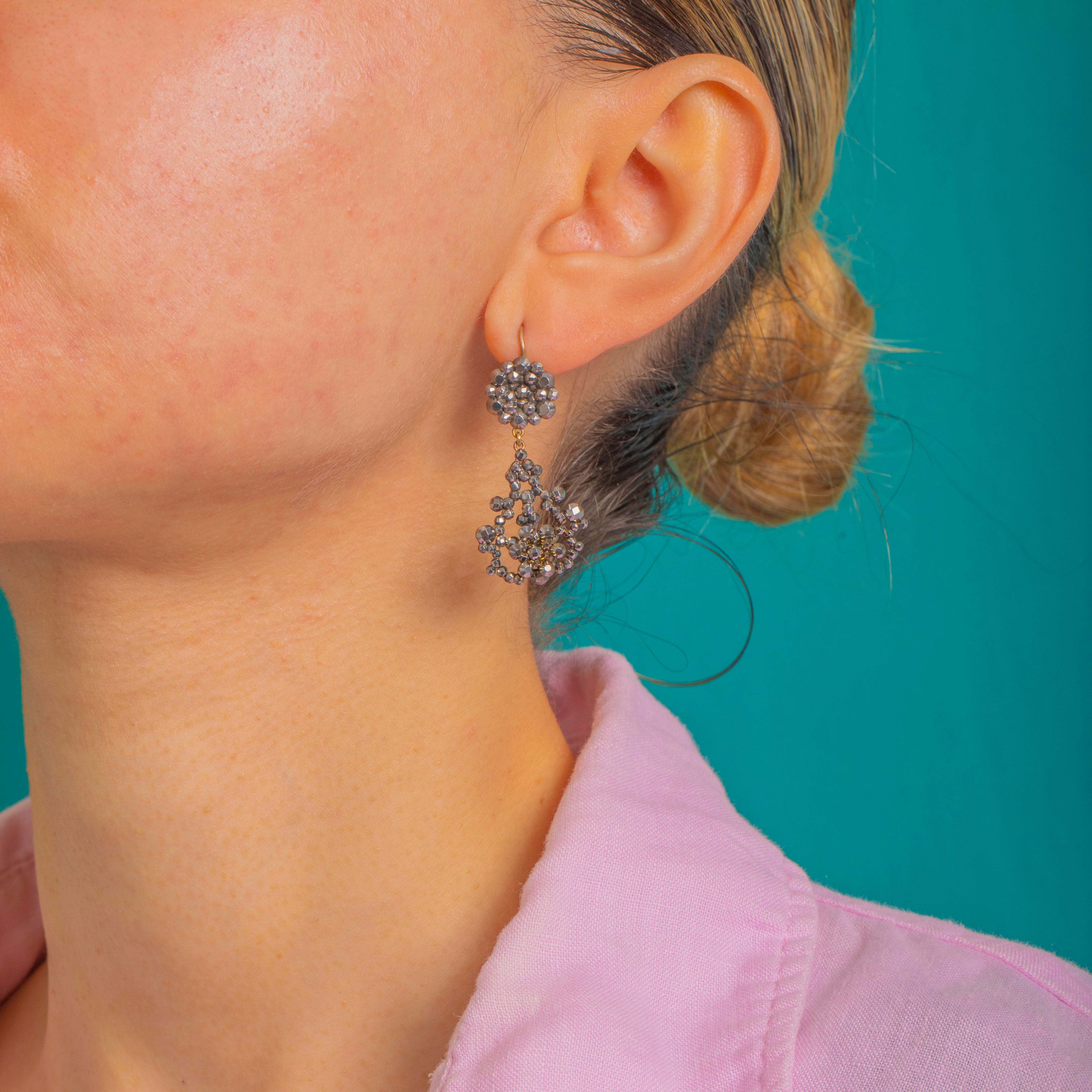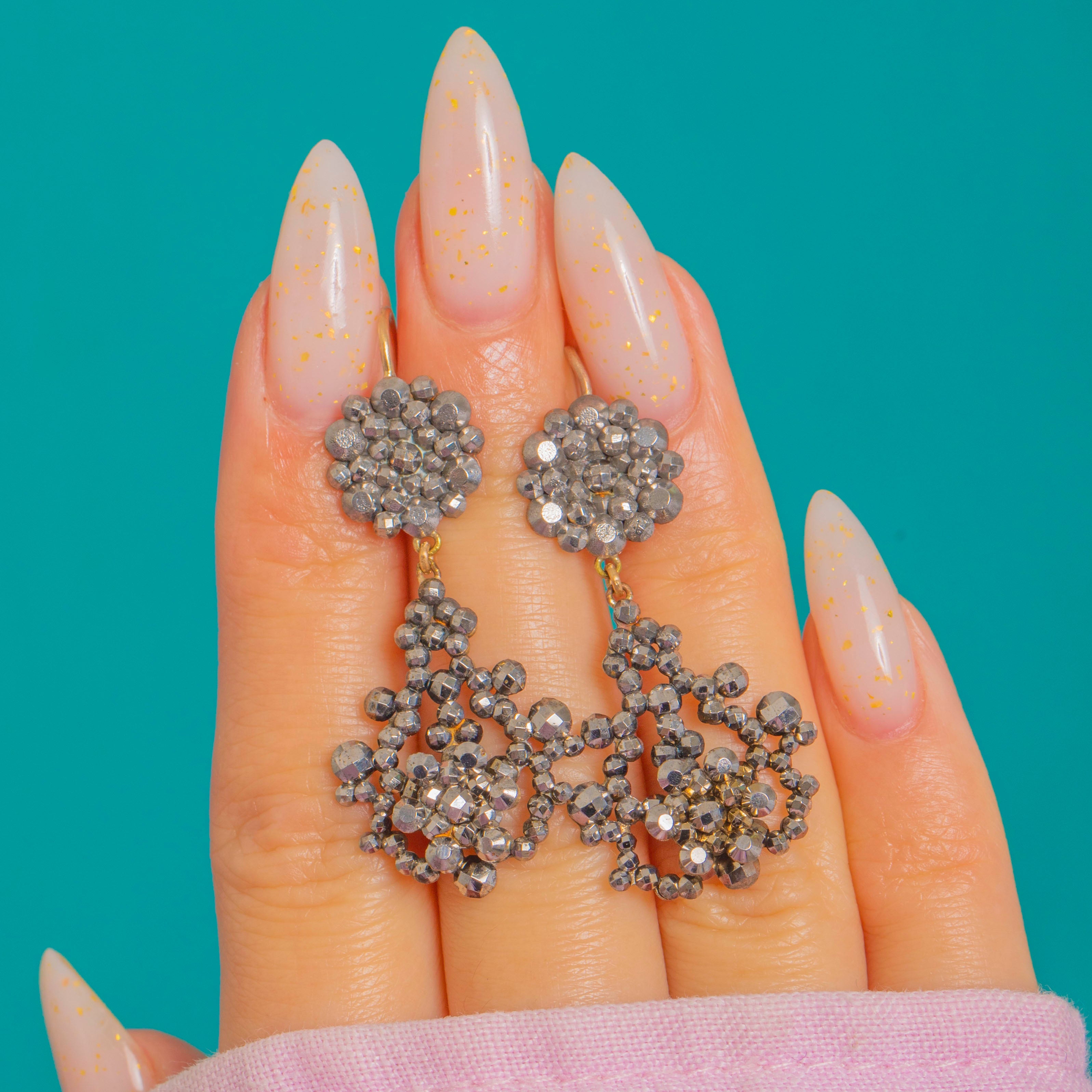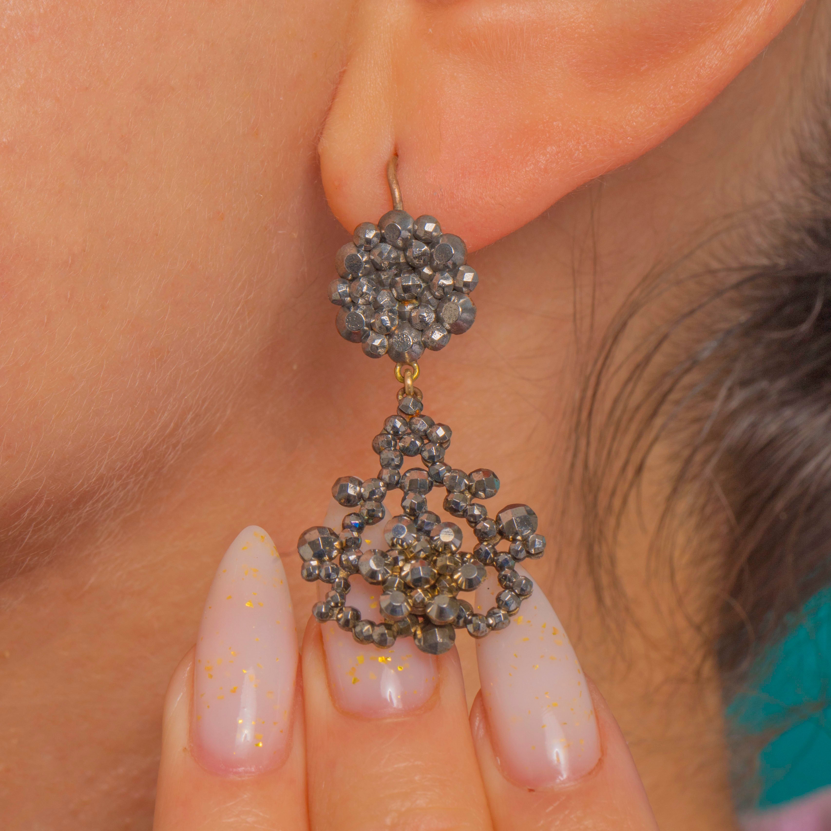 Beautifully articulated for fluid movement, these earrings catch the light at every turn. The contrast of dark, silvery-grey steel with gleaming 9ct Gold shepherd hooks feels both luxurious and authentically antique. A gentle, even patina enhances their character while the facets remain crisp and full of life—Georgian glamour at its most wearable.