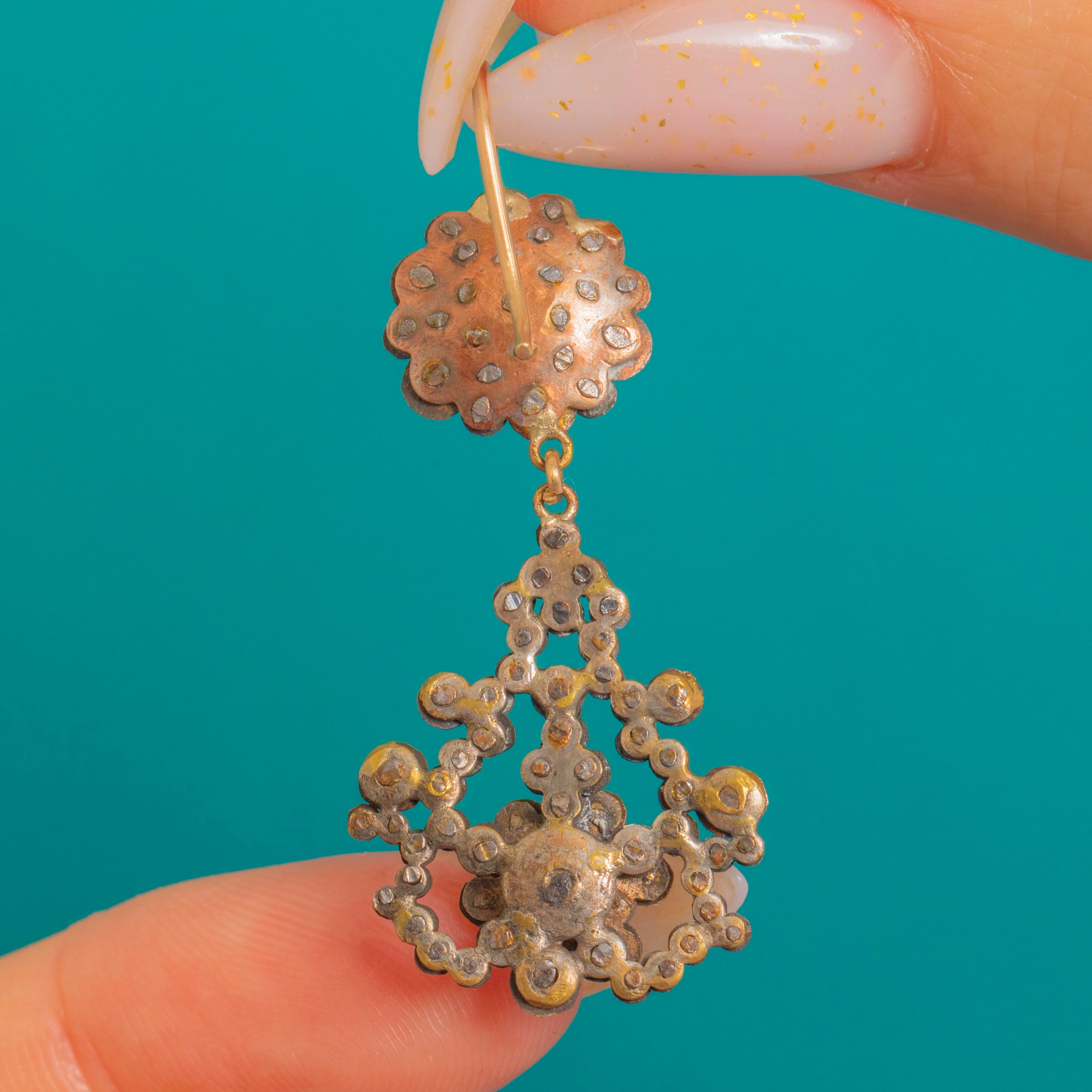 A dazzling pair of Georgian Cut Steel earrings, alive with that coveted steel-bright sparkle. Each earring features a domed rosette surmount suspending an ornate openwork drop, the fronts densely set with individually faceted Steel studs for a scintillating, jewel-like glow. The scrolling, arabesque silhouette nods to girandole elegance, balancing delicacy with drama.