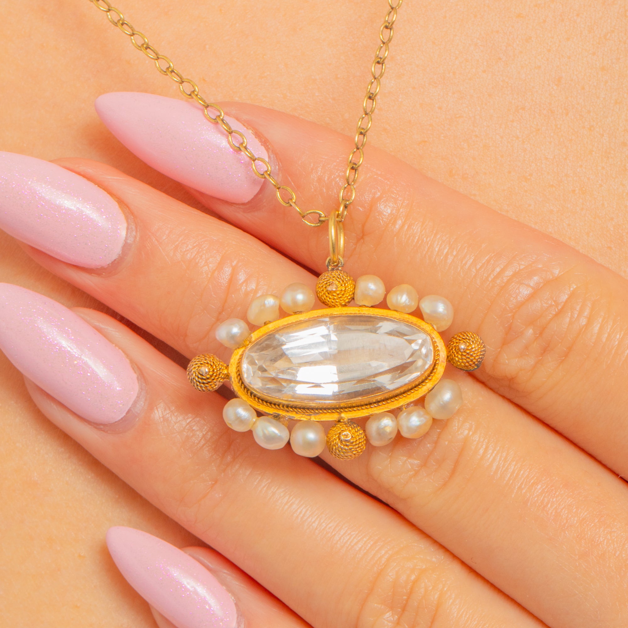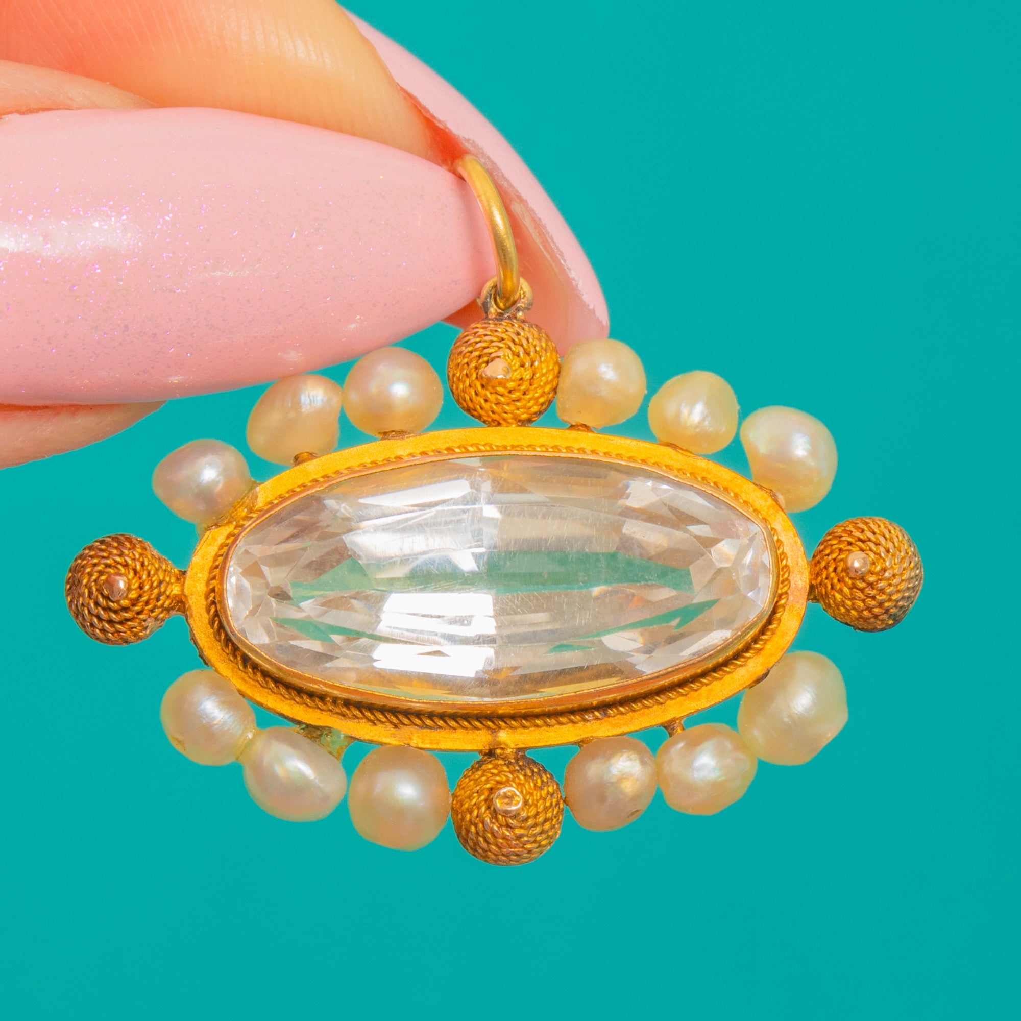 VERY GOOD: The Rock Crystal is bright with light surface scuffs visible under close inspection; the natural Pearls are intact with gentle nacre wear commensurate with age. The 18ct Gold cannetille and rope‑twist work remains crisp with a pleasing antique patina and minor surface wear. There is evidence of a conversion from a brooch on the back, which has been carried out to a high standard and is not visible from the front.