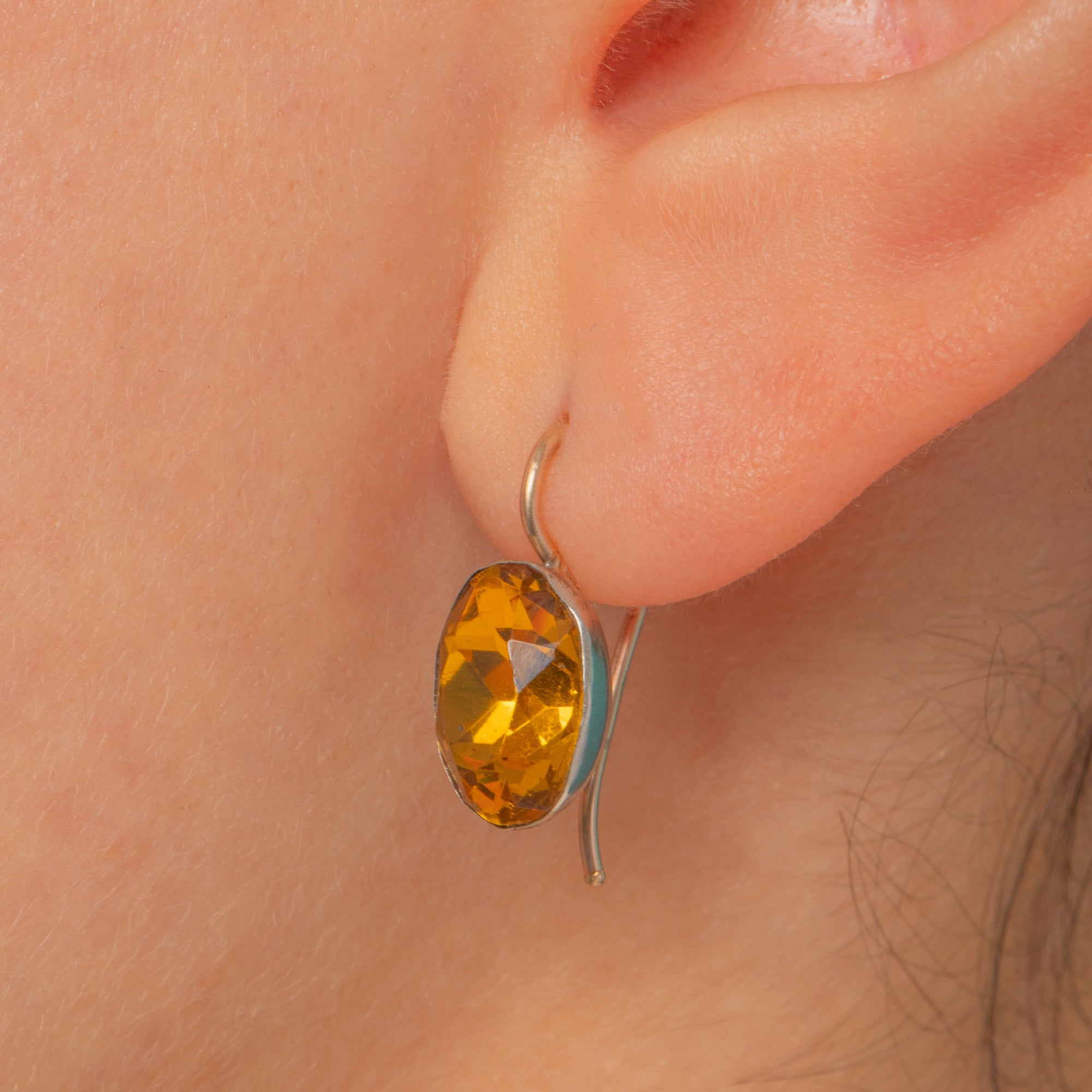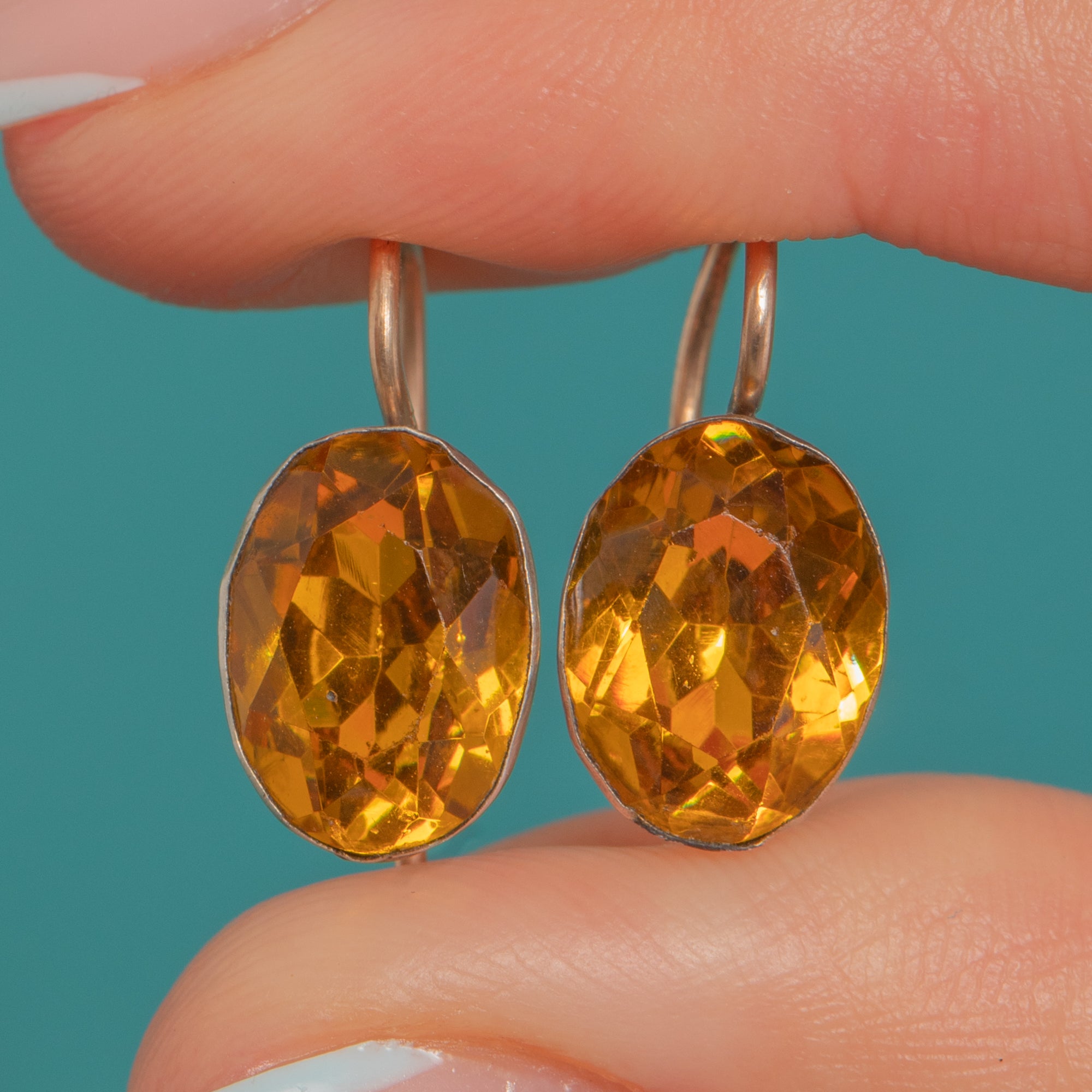 A sweet Georgian treasure, these petite drop earrings glow with foiled Yellow Paste in refined bezel settings. The oval stones radiate warm, Citrine-esque hues, their colour deepened by the traditional foil backing and framed by smooth rubover bezels for a refined, gem-forward look.