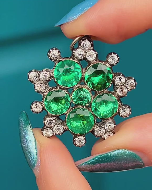 This Georgian green & black dot Paste cluster pendant will add a vibrant flourish to your décolletage! Finely crafted from solid Silver and backed with 9ct Gold, this Georgian pendant boasts a floral cluster of Emerald Paste in the centre bordered by bright Diamond Paste, all foiled crisply faceted to catch the light magnificently.