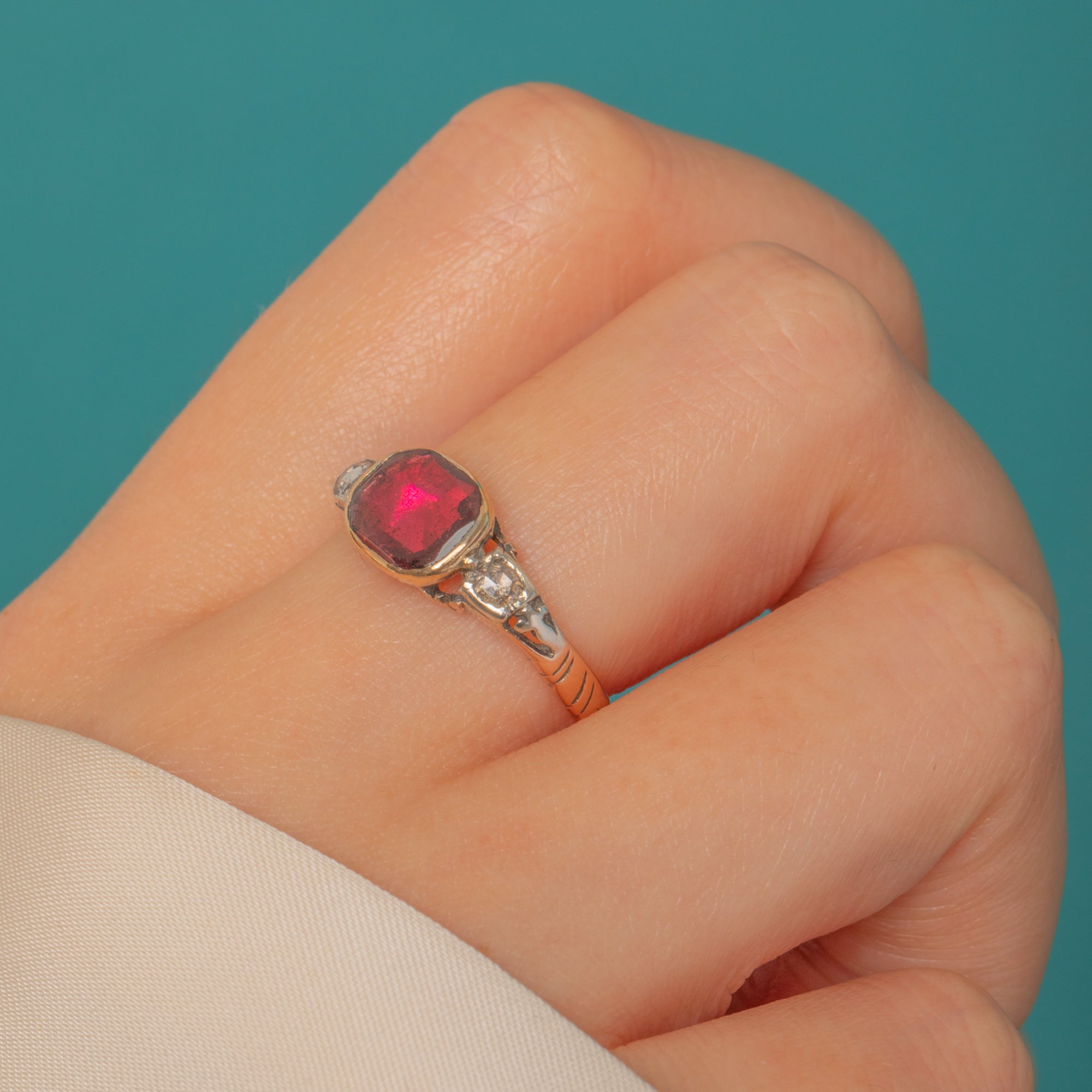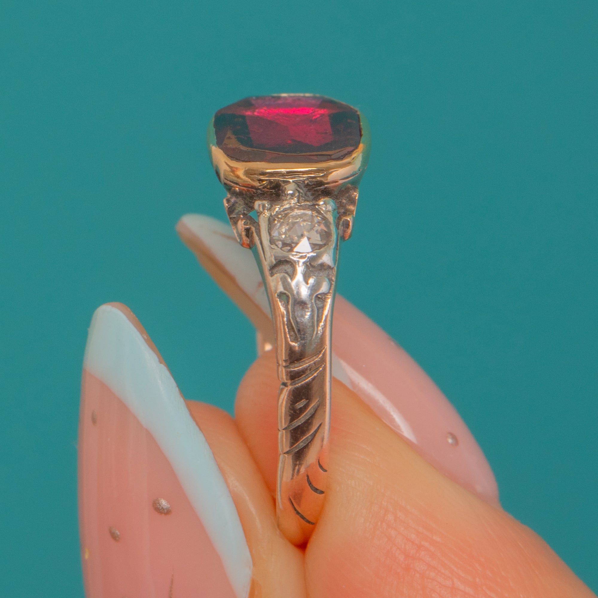 A captivating Georgian half-hoop ring set with a luscious flat-cut Garnet in a low bezel, flanked by two twinkling rose-cut Diamonds. The hand-worked shoulders show delicate foliate engravings and subtle stepped details set with tiny Diamond accents.