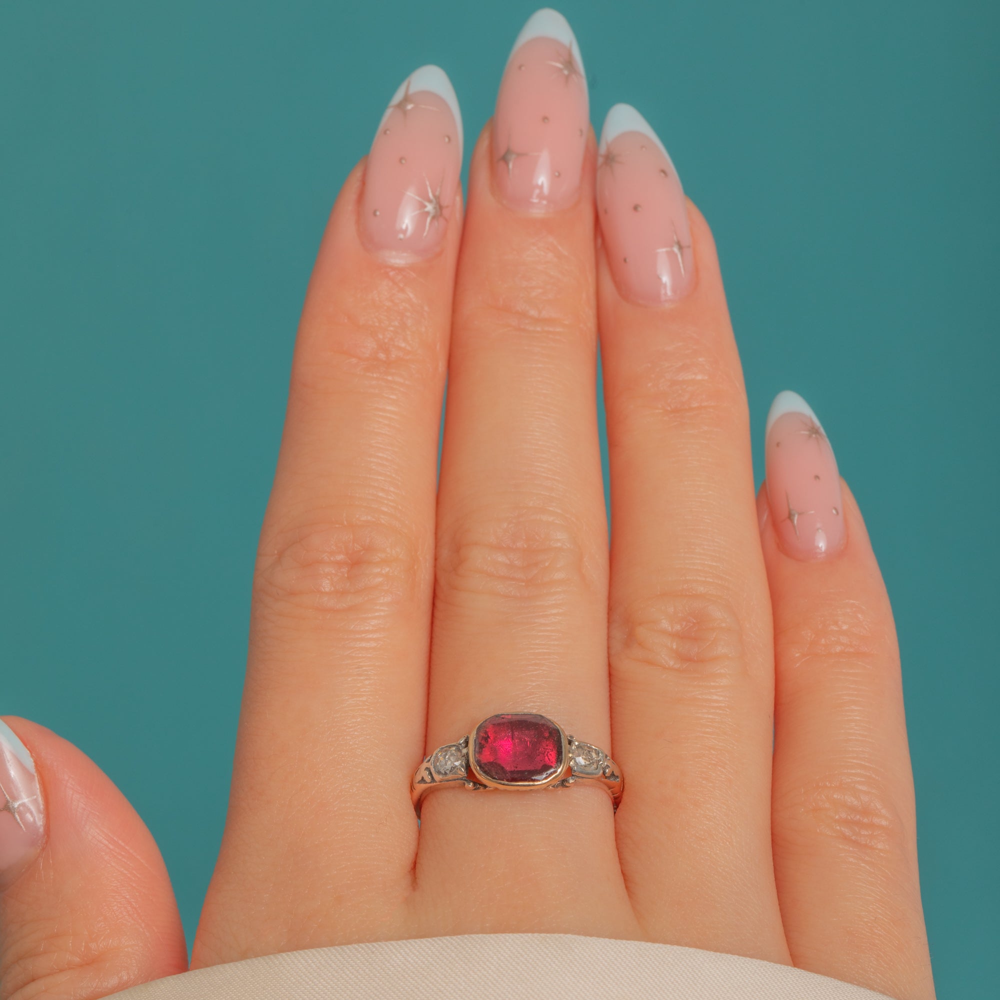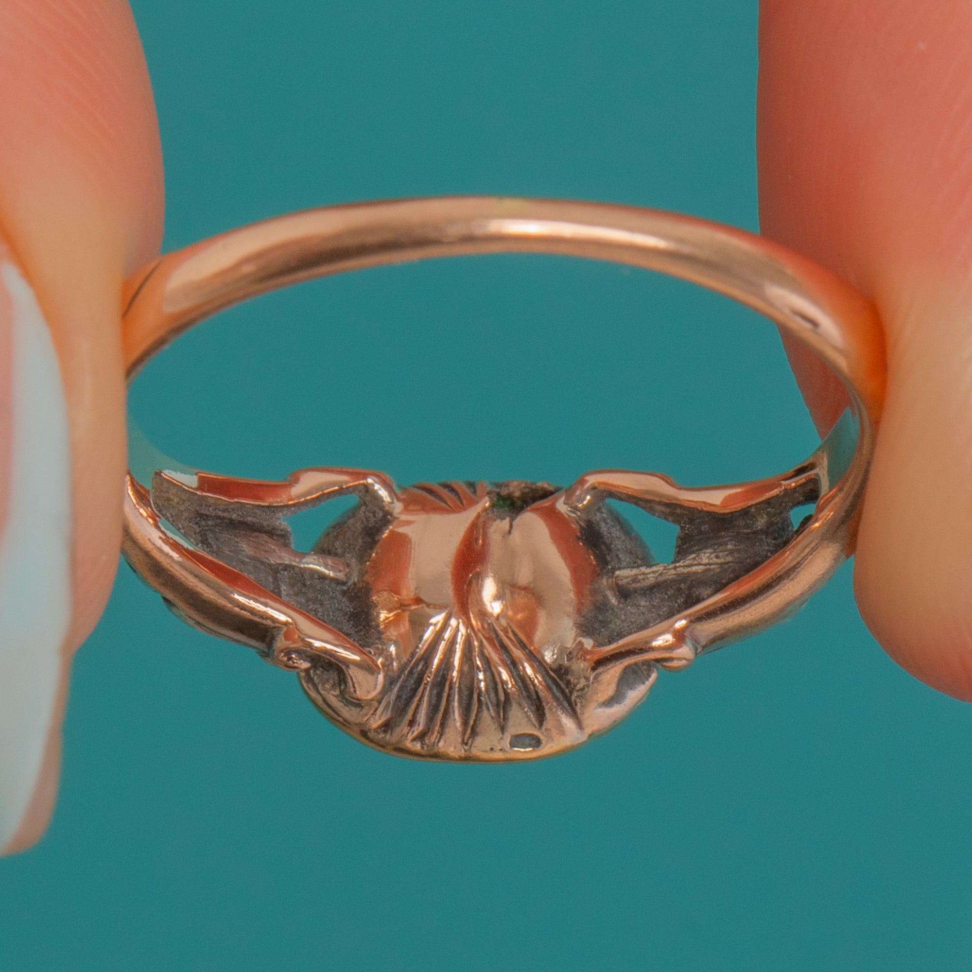 Romantic and refined, this low-profile ring has all the magic of the late 18th century: a softly scalloped open under-gallery, a partially closed back, and that gentle antique patina we adore. Elegant on the hand and rich in colour, it’s a timeless treasure of the Rococo era.