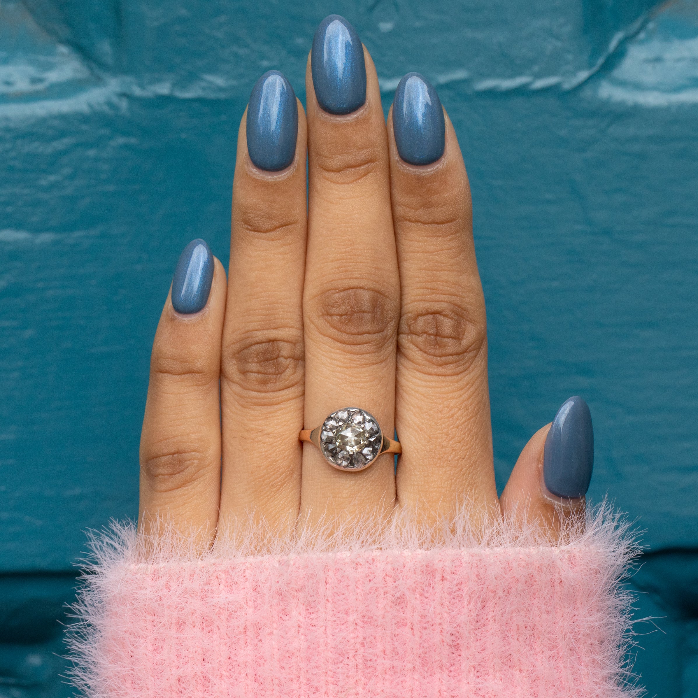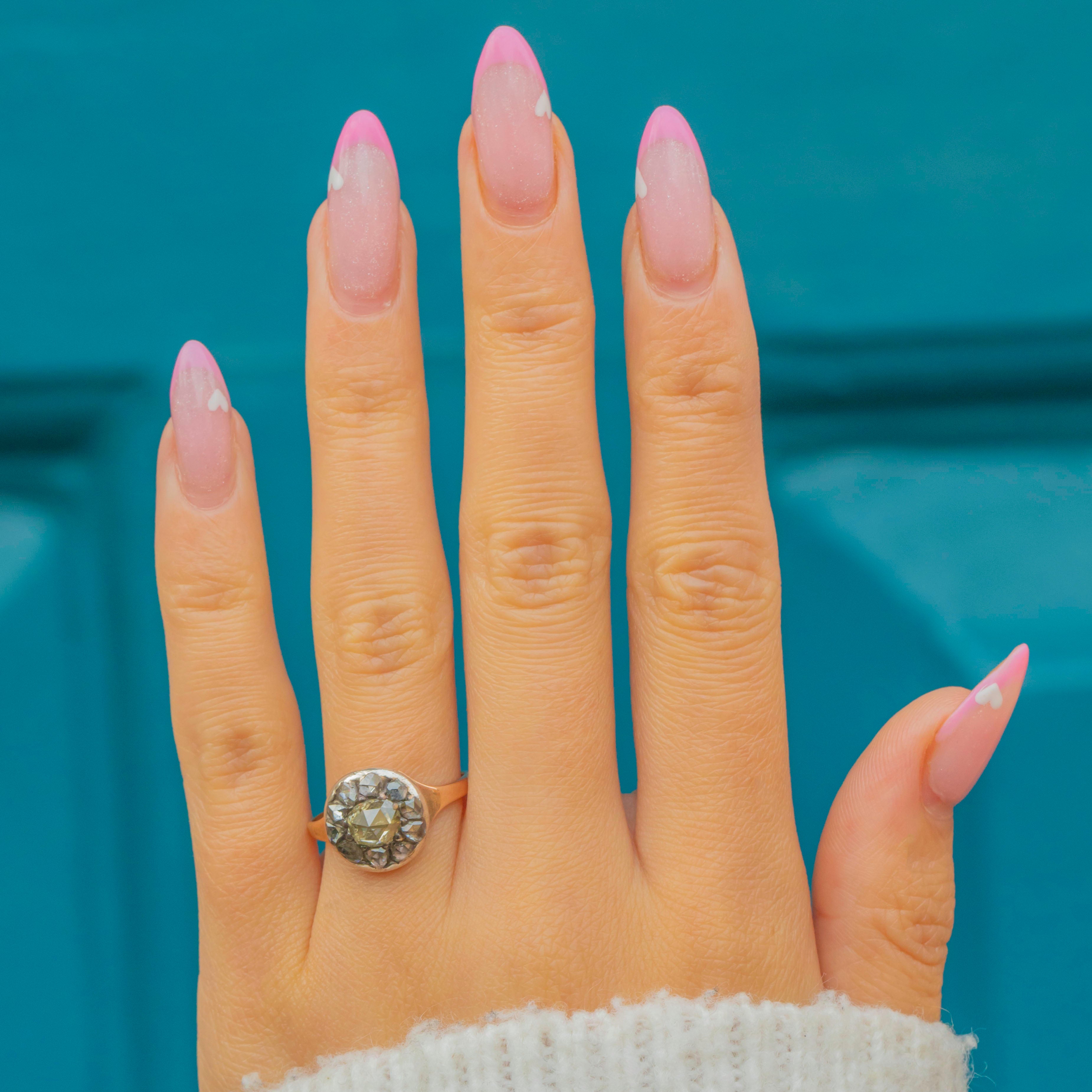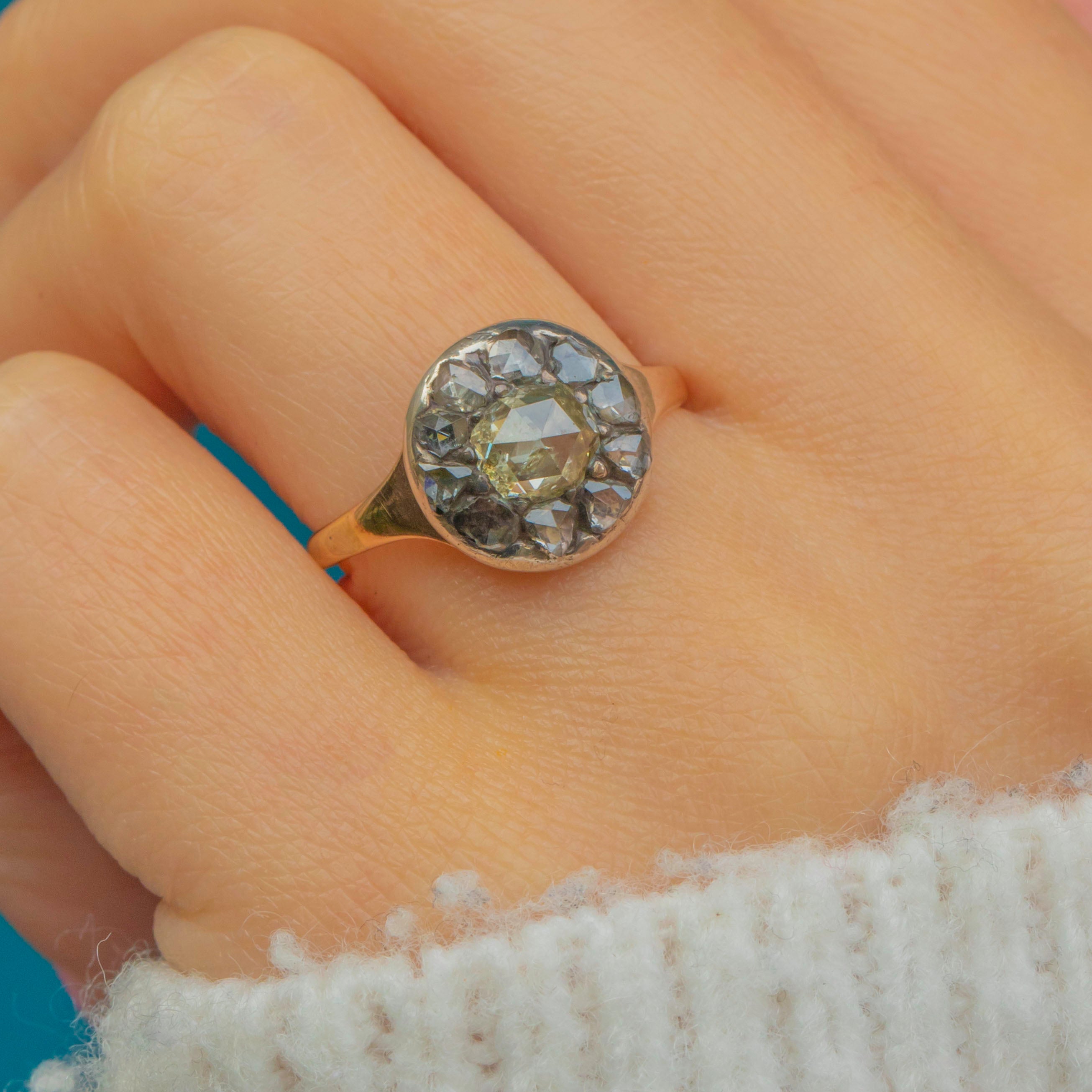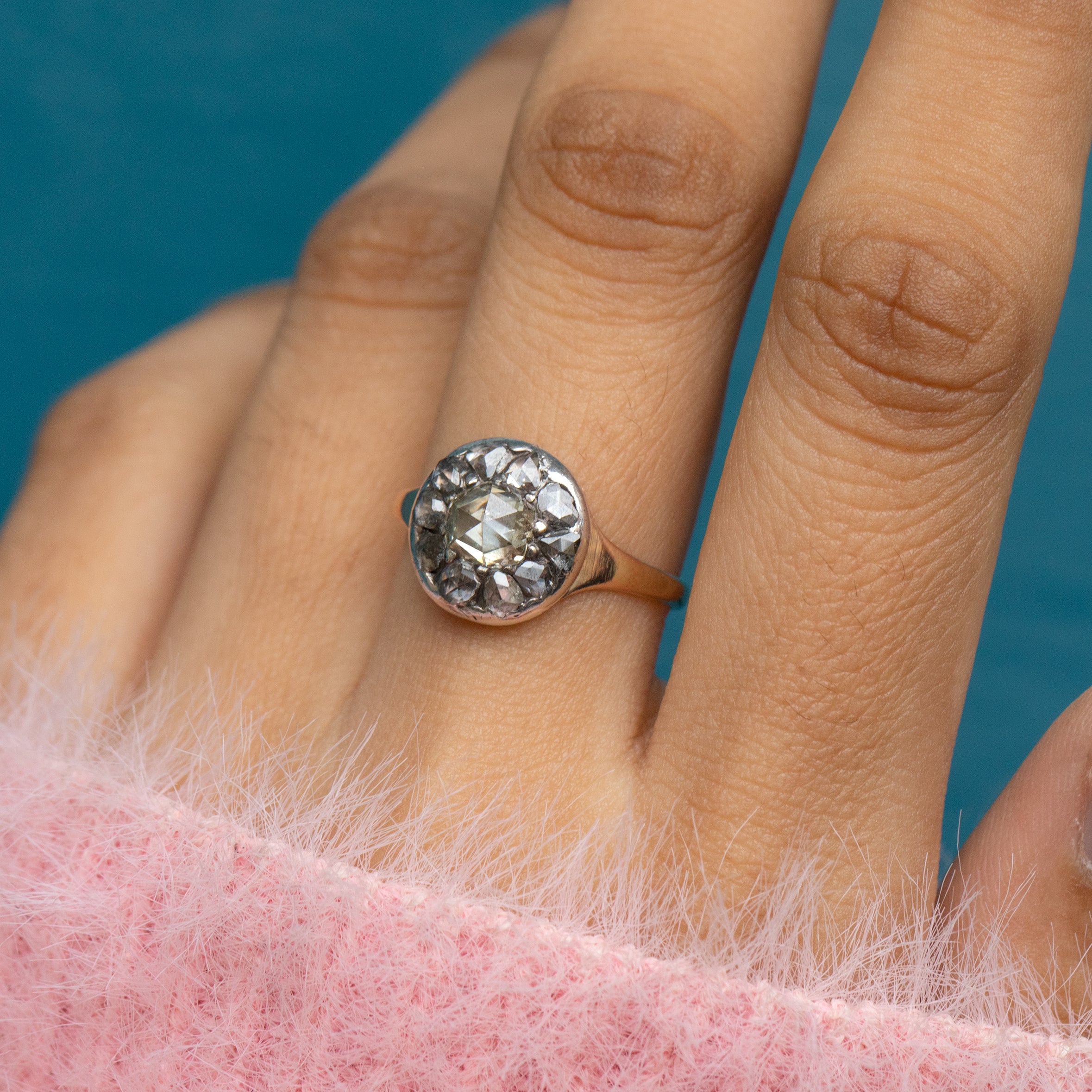 Behold the mesmerising beauty of this Georgian Rose-Cut Diamond cluster ring! Crafted with exquisite artistry, this ring exudes an aura of sophistication and grace. Each Rose-cut Diamond, meticulously arranged in a captivating cluster, radiates a luminous brilliance, captivating the beholder with its enchanting sparkle. The intricate settings delicately cradle the Diamonds, enhancing their natural allure.
