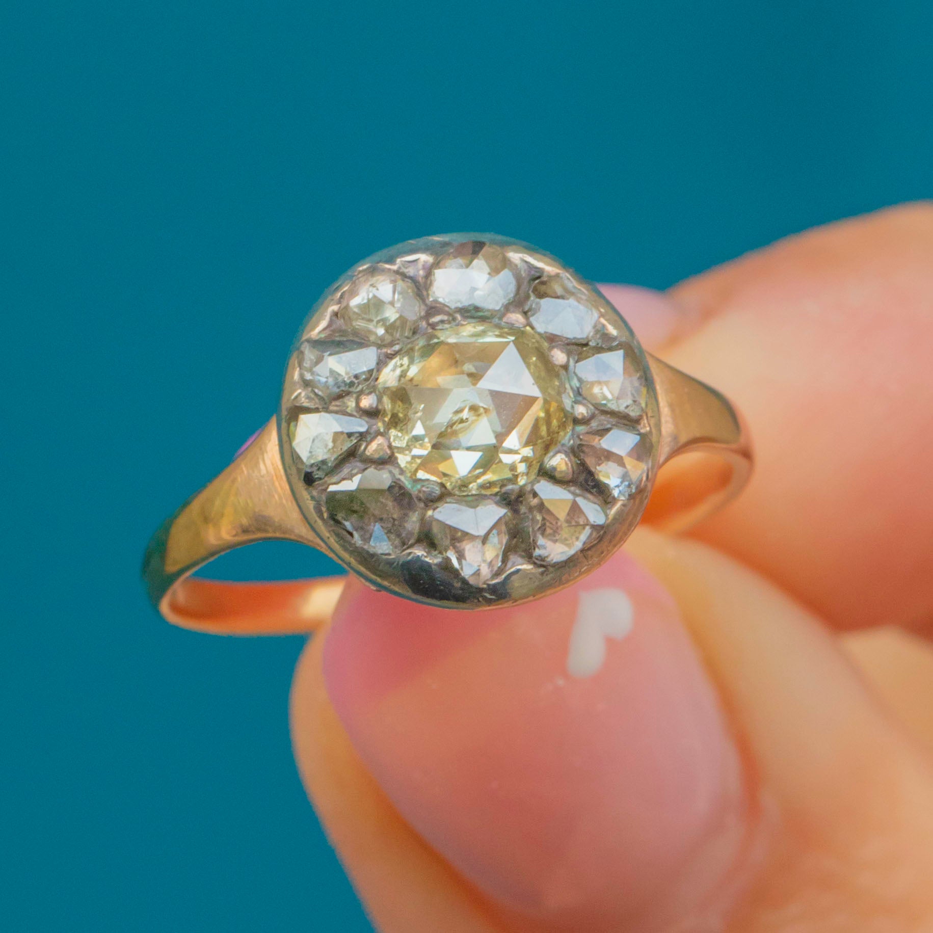 EXCELLENT. This exquisite Georgian Rose-cut Diamond cluster ring is remarkably well-preserved, showcasing its timeless beauty despite its age. The dazzling Rose-cut Diamonds gleam with brilliance, illuminating its allure. Though resized over time, with one half crafted in 9ct Gold and the other in 15ct Gold, the integrity of the design remains intact. With the Diamonds delicately set in silver, this enchanting piece exudes charm and elegance. Embrace the magic of this captivating ring and revel in its enduring enchantment!