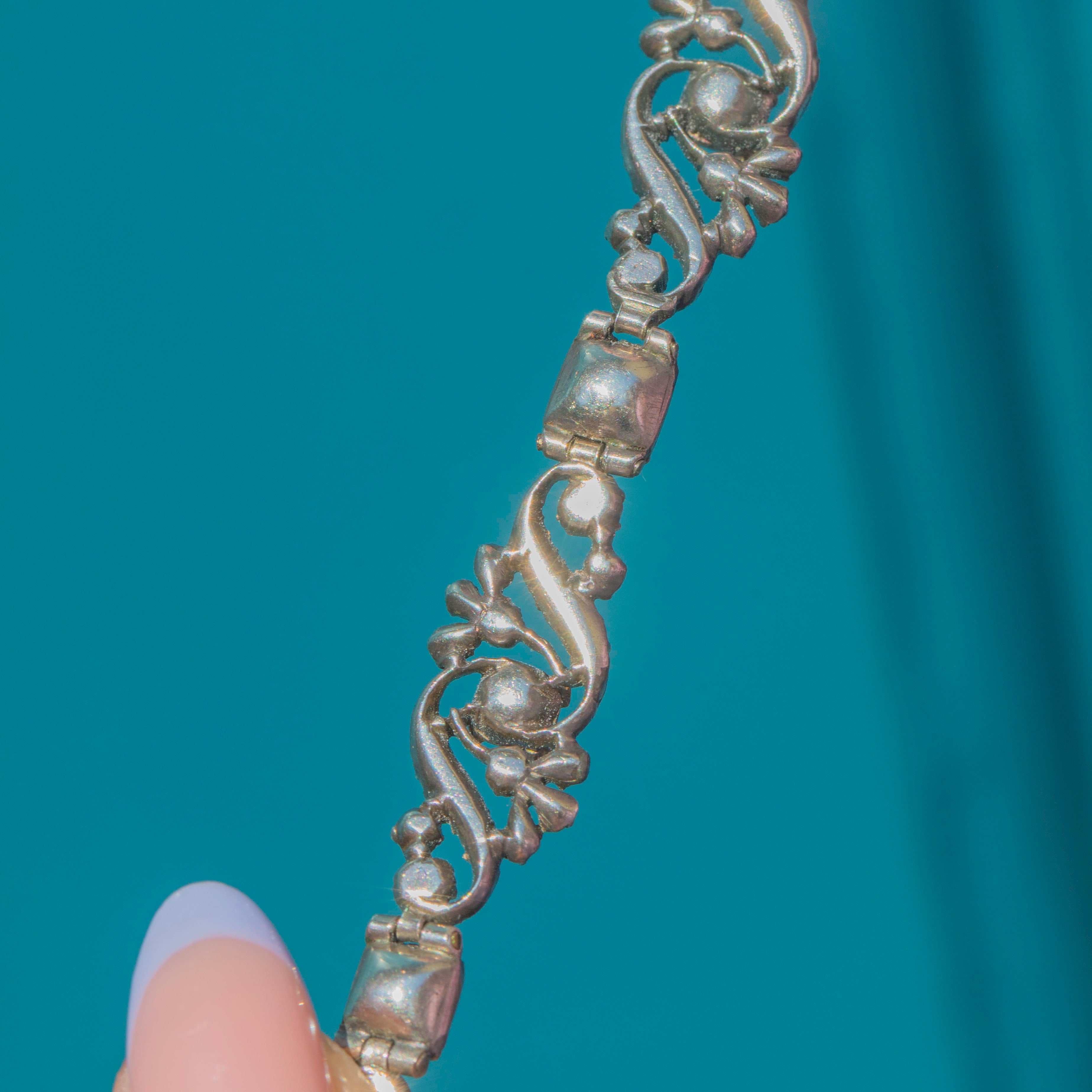 Crafted from glossy Silver, this antique bracelet presents a total of eleven gorgeous square Emeralds, each set within warm 9ct Gold settings. Each Emerald is flanked by a myriad of rose-cut Diamonds, giving this antique bracelet a decadent allure and sophisticated finish. Her settings are floral in design, in quintessential Georgian style, with the swirling acanthus leaves adorning your wrist delicately.