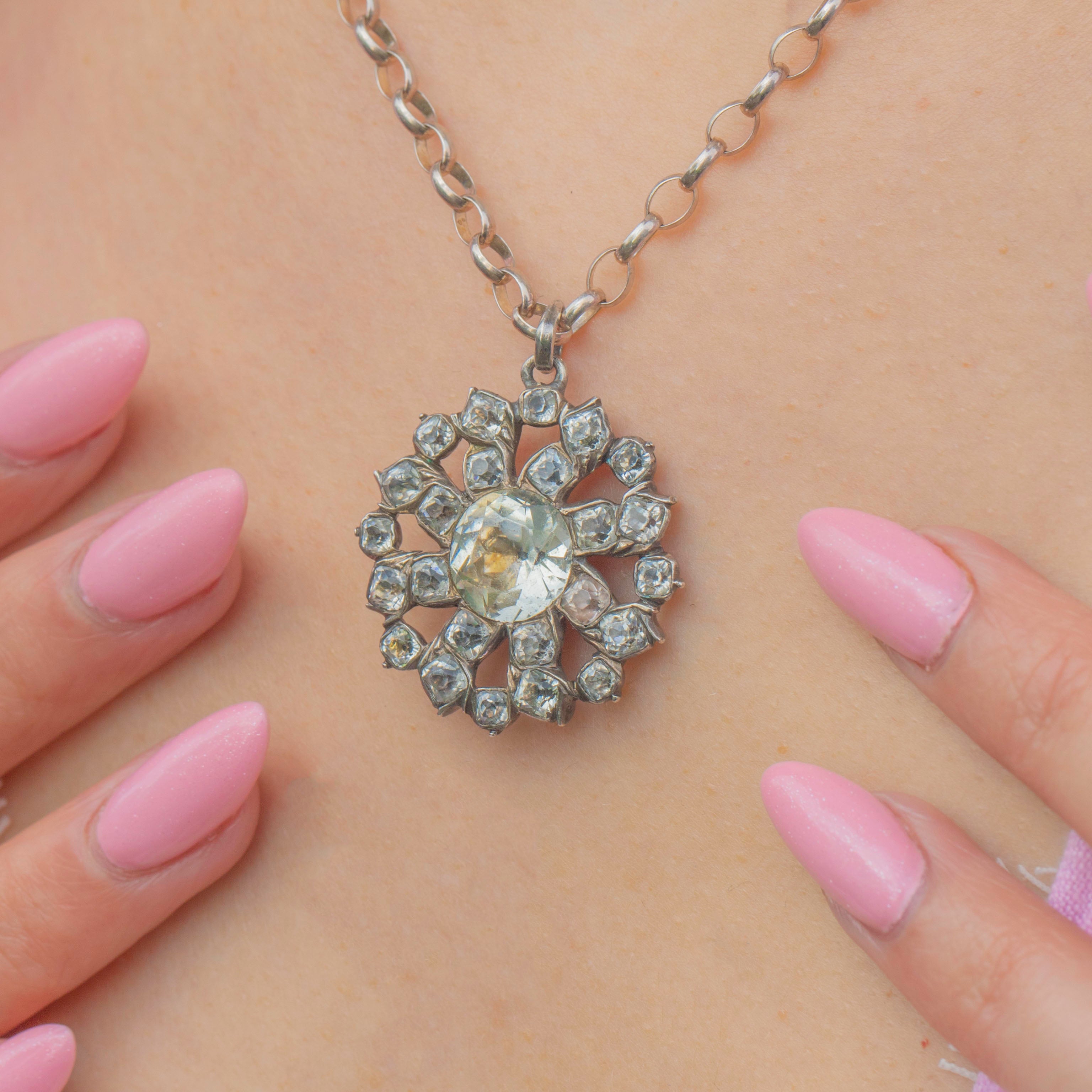 VERY GOOD: This Georgian Silver Black Dot Paste cluster pendant is in very good condition. The Paste have been wonderfully preserved, with their crisp facets and bright foils free from surface wear. The Silver shows some wear, commensurate with age, but this is mostly on the back so won't be visible while the pendant is worn. The Silver has accrued an admirable patina, adding to the pendant's antique charm. This piece is a true Georgian treasure and will make a standout addition to your collection!