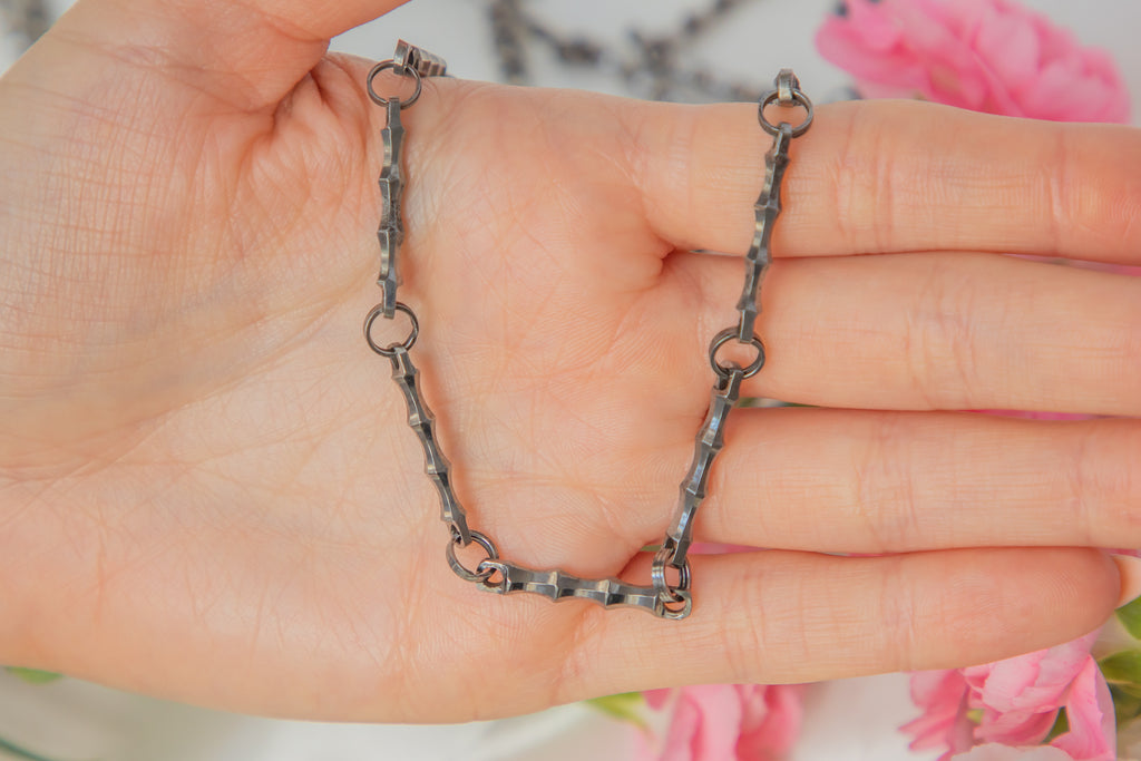 With a stunning gunmetal tone, this exquisite piece of antique jewellery will add a touch of punk and Gothic glamour to your jewellery wardrobe. The faceted links catch the light perfectly, making her radiance and beauty shine without interruption.