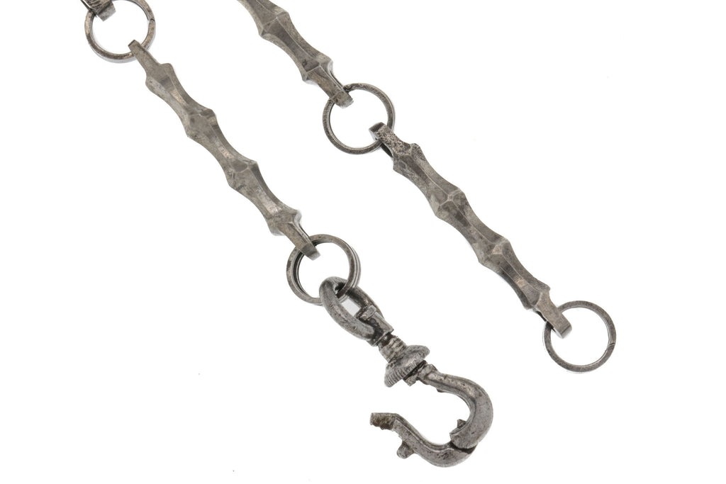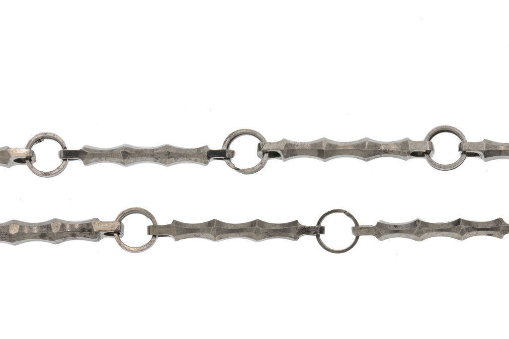 Every inch of her design is unique and incredibly hard to come by nowadays. Composed of a link style we have never seen before, akin to bamboo, each Steel link is joined by super rare sliced steel split ring connectors, and with 54.5 inches of her, you can soak up her antique beauty wrapped around multiple times.