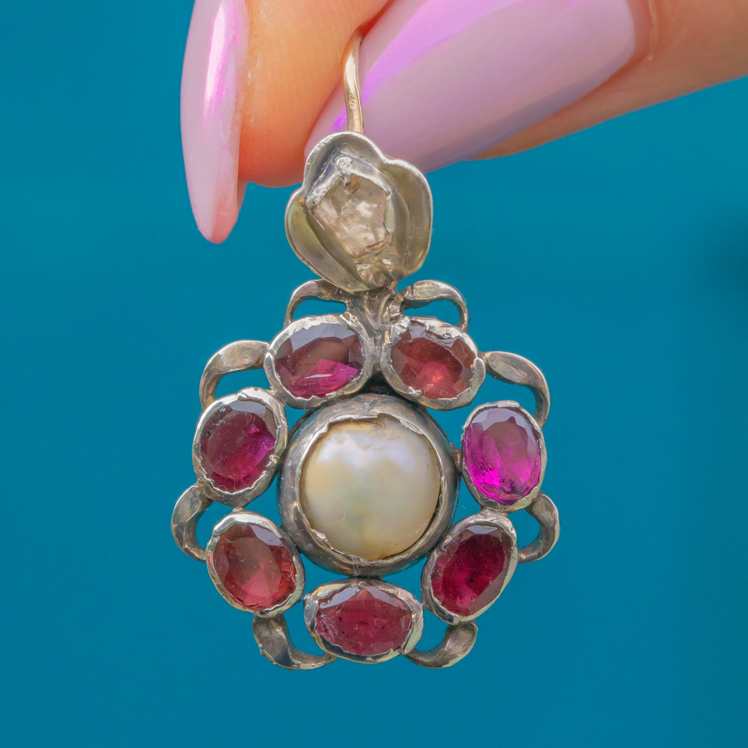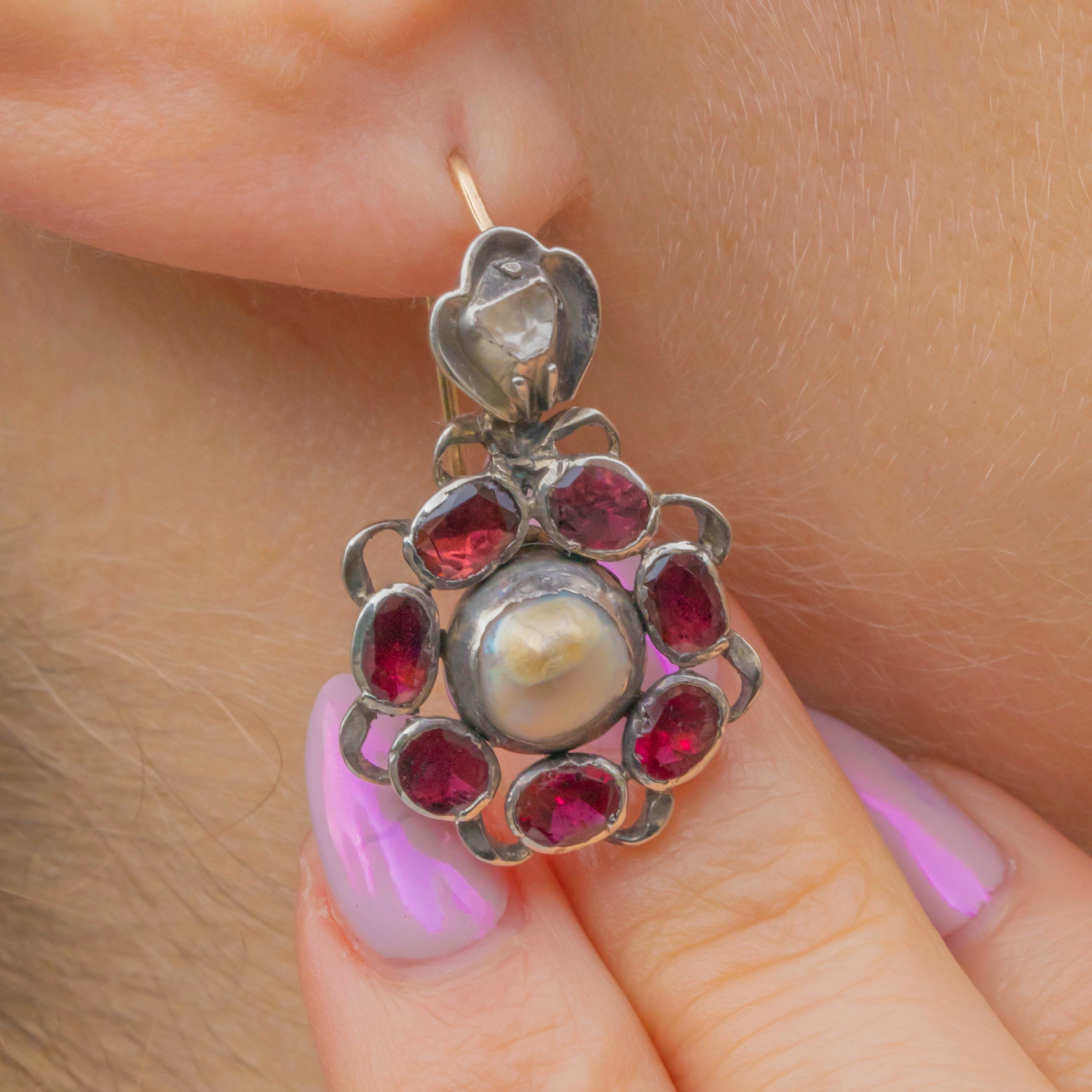 MATERIALS: Tests as Silver, 15ct Gold Hooks, Garnet, Rose-Cut Diamond (0.35ct), Natural Pearl.