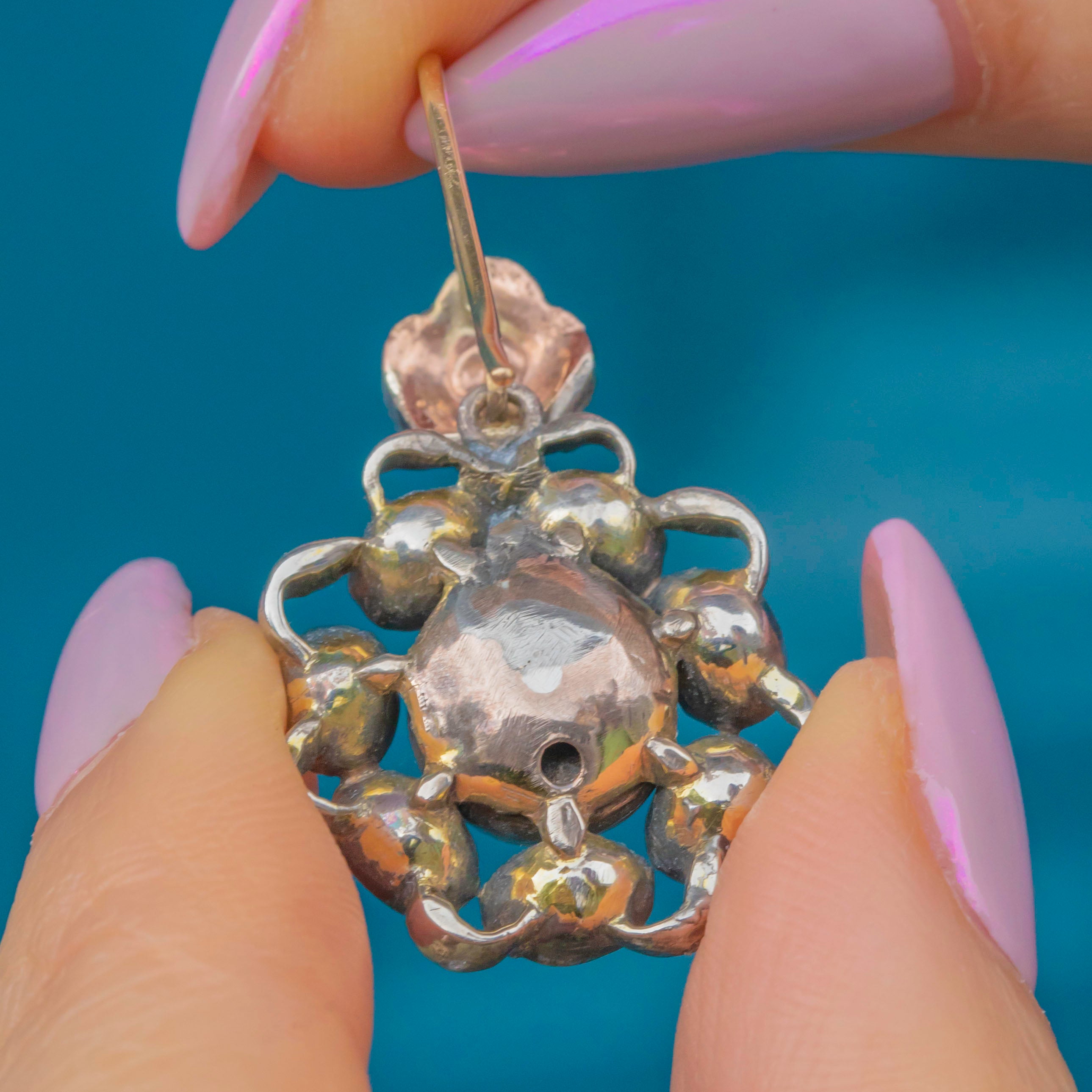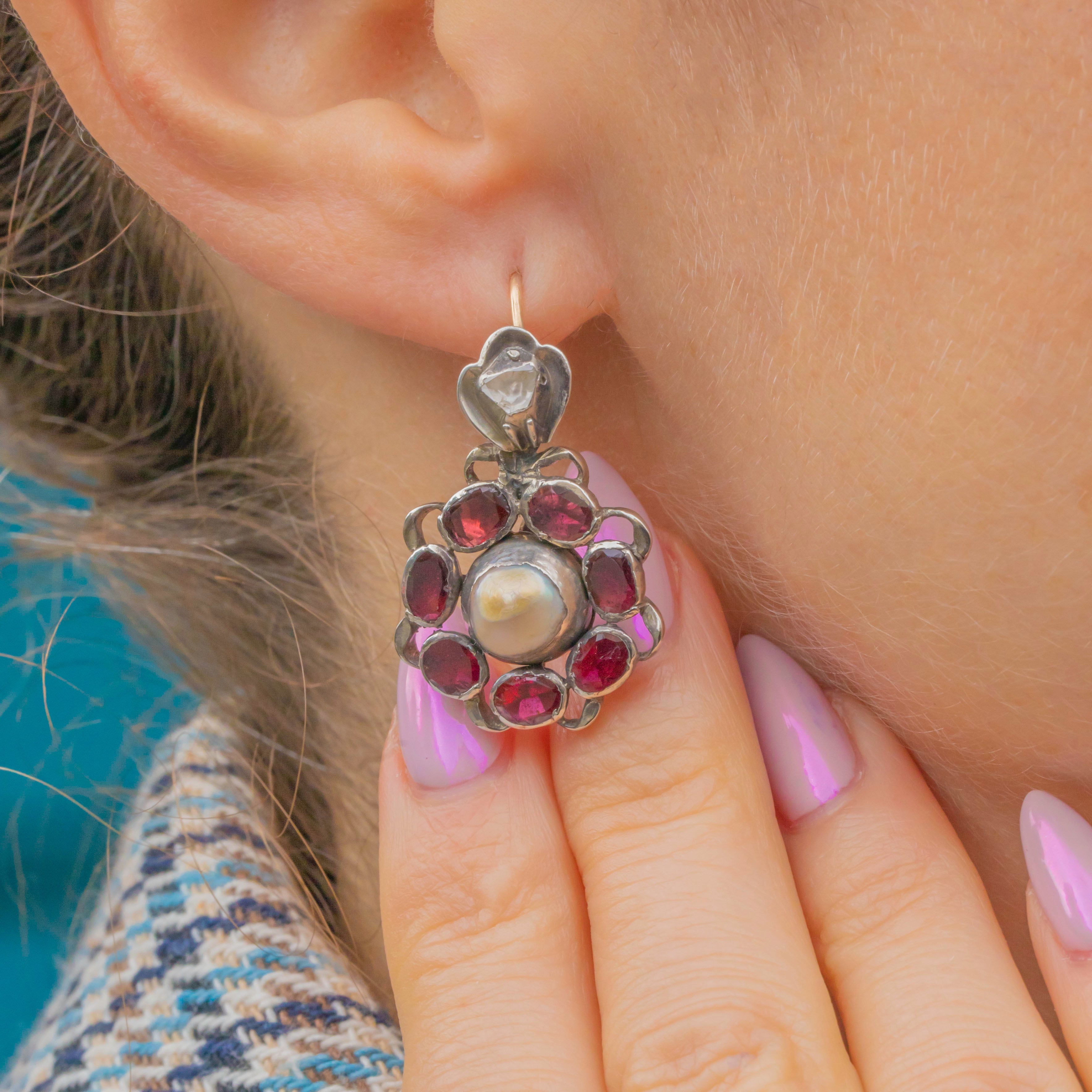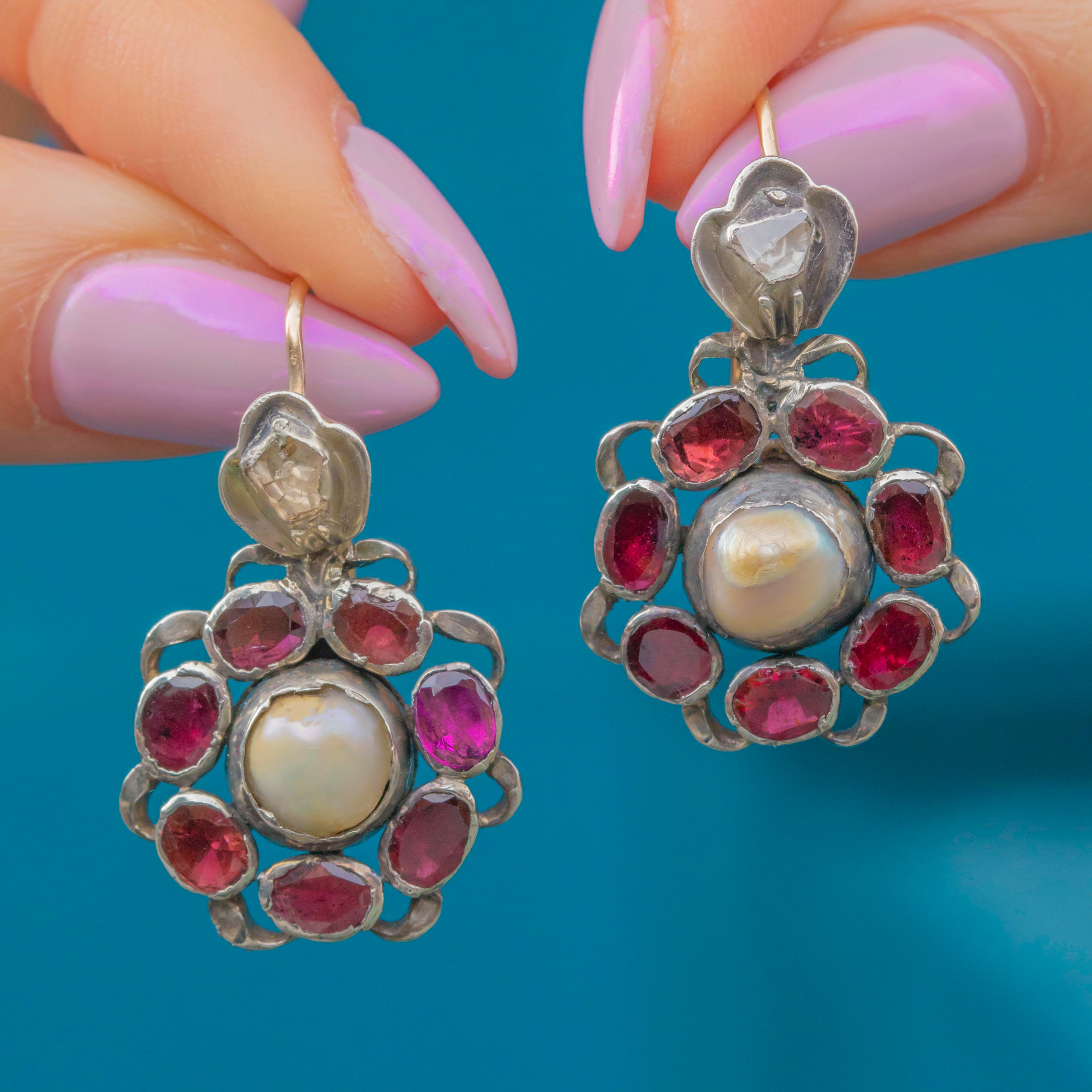 GOOD: The Pearls show visible wear and age, and the Silver displays surface wear consistent with their 18th-century origin. The Garnets and Diamonds are secure and retain strong colour and sparkle. A very rare and characterful pair of Georgian Iberian earrings.