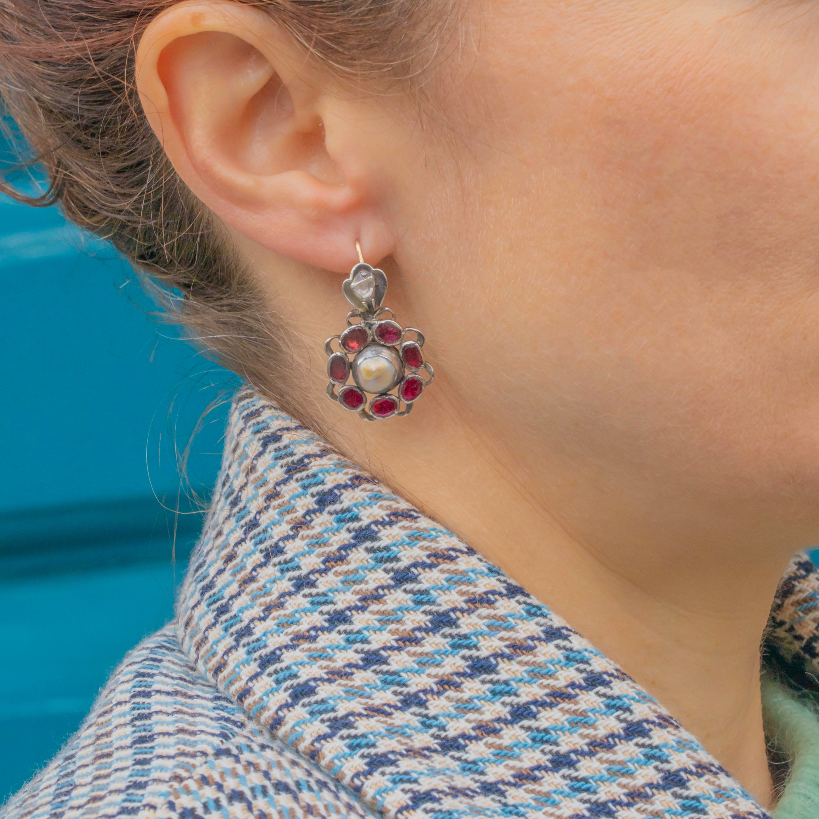 Iberian Flat-Cut Garnet Rose-Cut Diamond, Pearl Drop Earrings c.1780