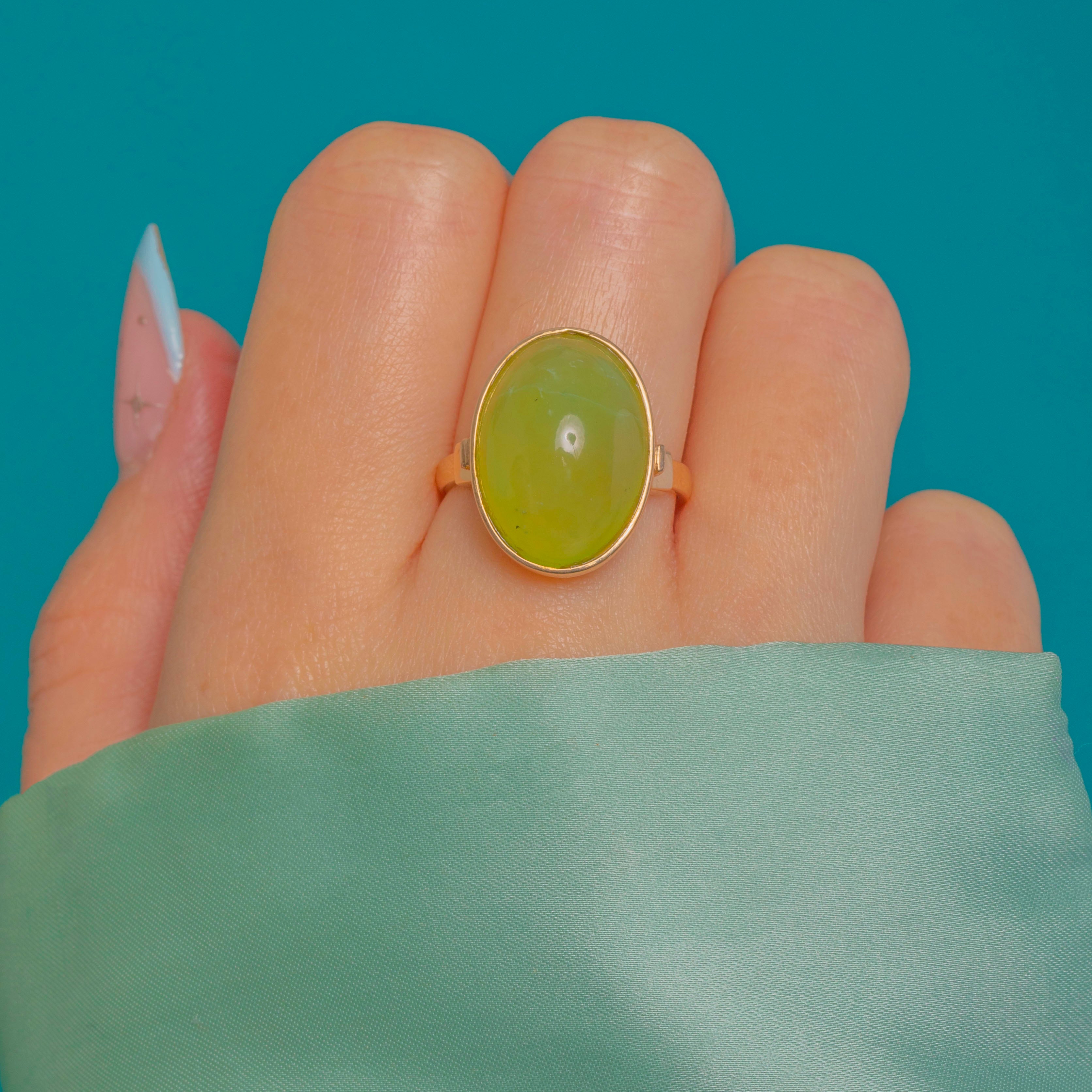 Confident and sculptural, this Vintage Chalcedony ring showcases a luscious apple-green oval cabochon set in rich 14ct Gold. The smooth rubover bezel frames the glossy dome beautifully, allowing the stone’s fresh, translucent glow to take centre stage.