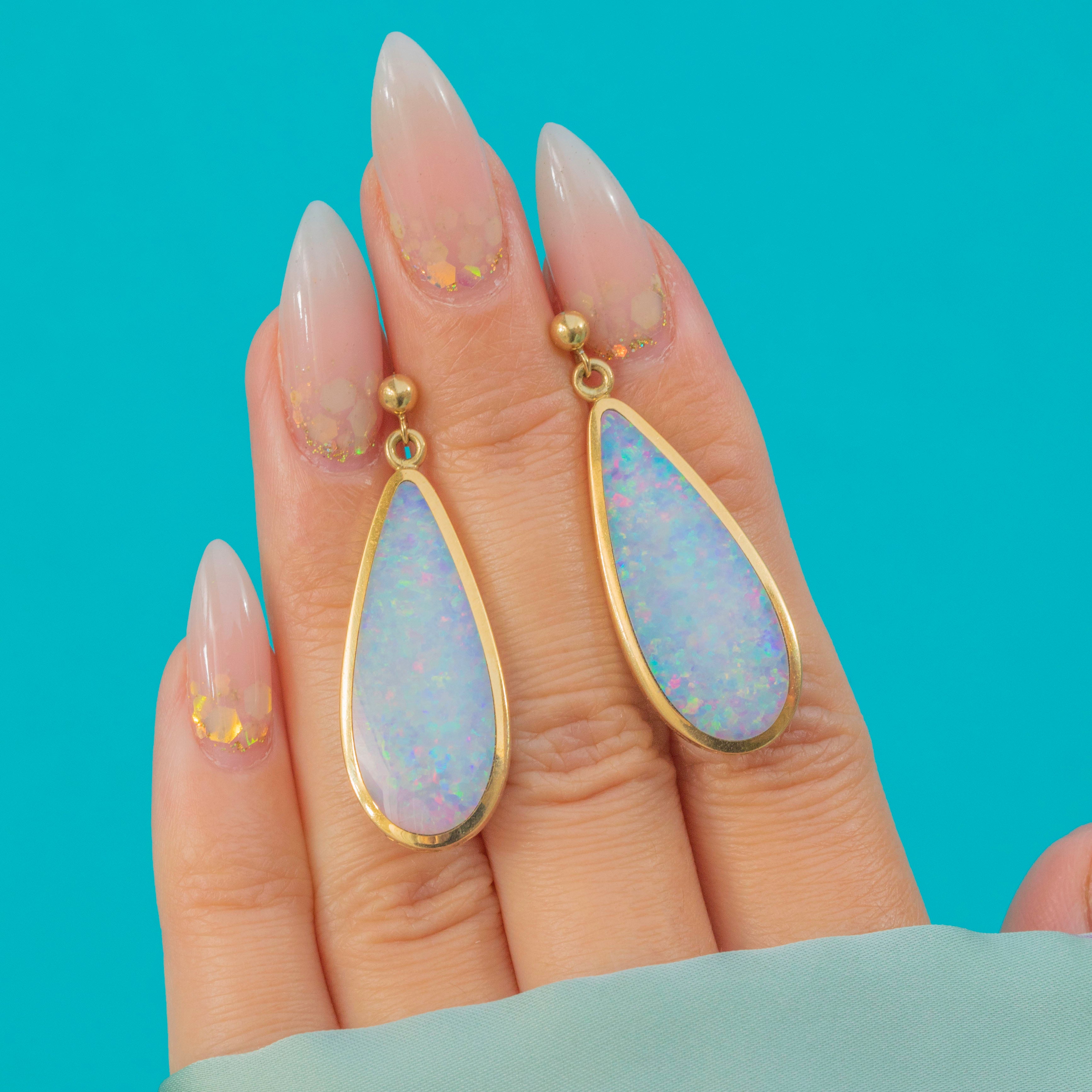 A stunning pair of vintage 18ct Gold teardrop Opal earrings, set with fiery natural solid Opals weighing an impressive 10cts in total. The Opals display a mesmerising play of colour, flashing with vibrant hues of green, orange, blue and pink as they catch the light. Each teardrop stone is mounted in smooth 18ct Gold rubover settings and suspended from matching Opal studs for a striking yet elegant drop.
