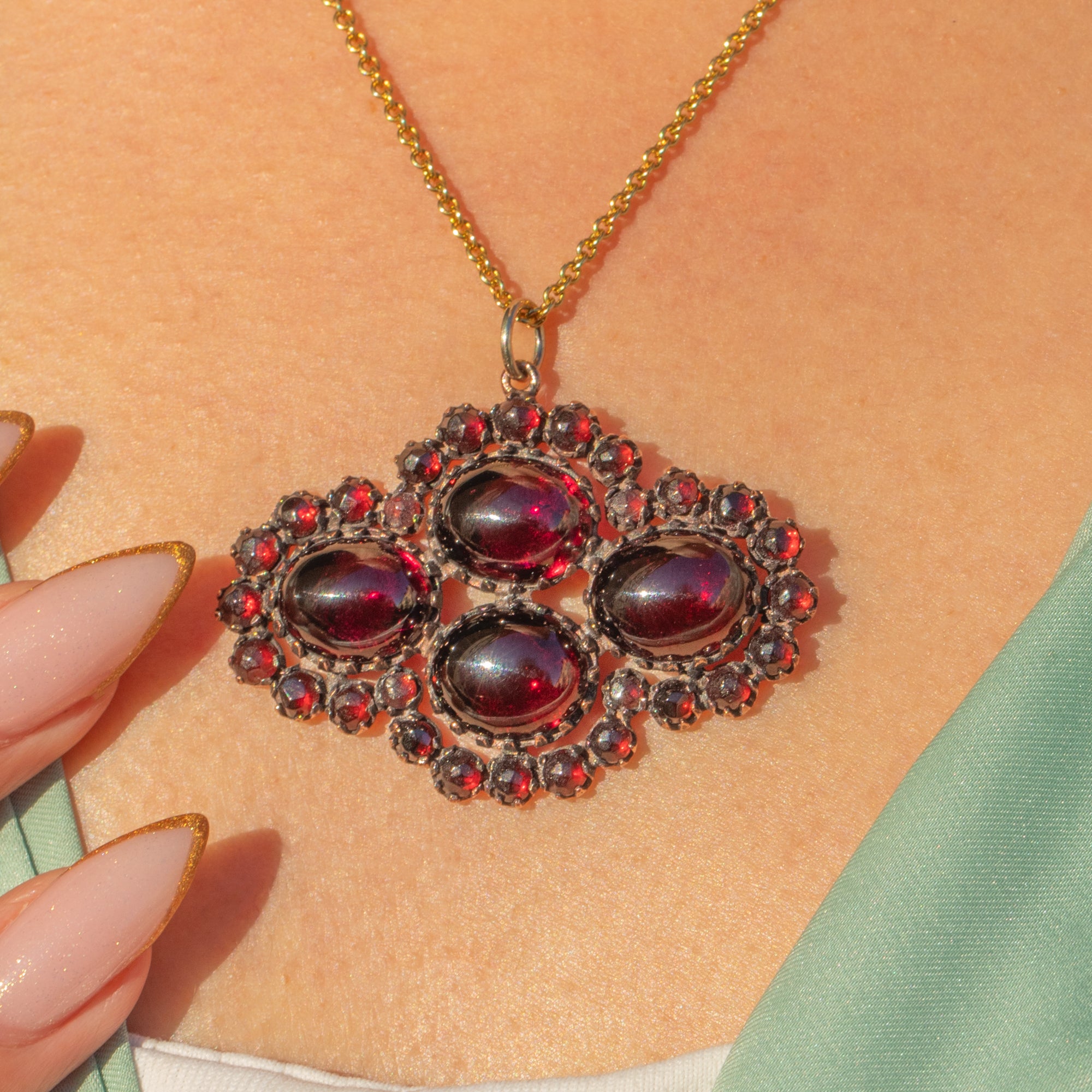 This Victorian Garnet pendant is a striking piece with rich colour and impressive presence. Crafted in Gold-toned metal and set with 19.24 carats of glowing red Garnets, it has that opulent, romantic feel so characteristic of late 19th-century jewellery.