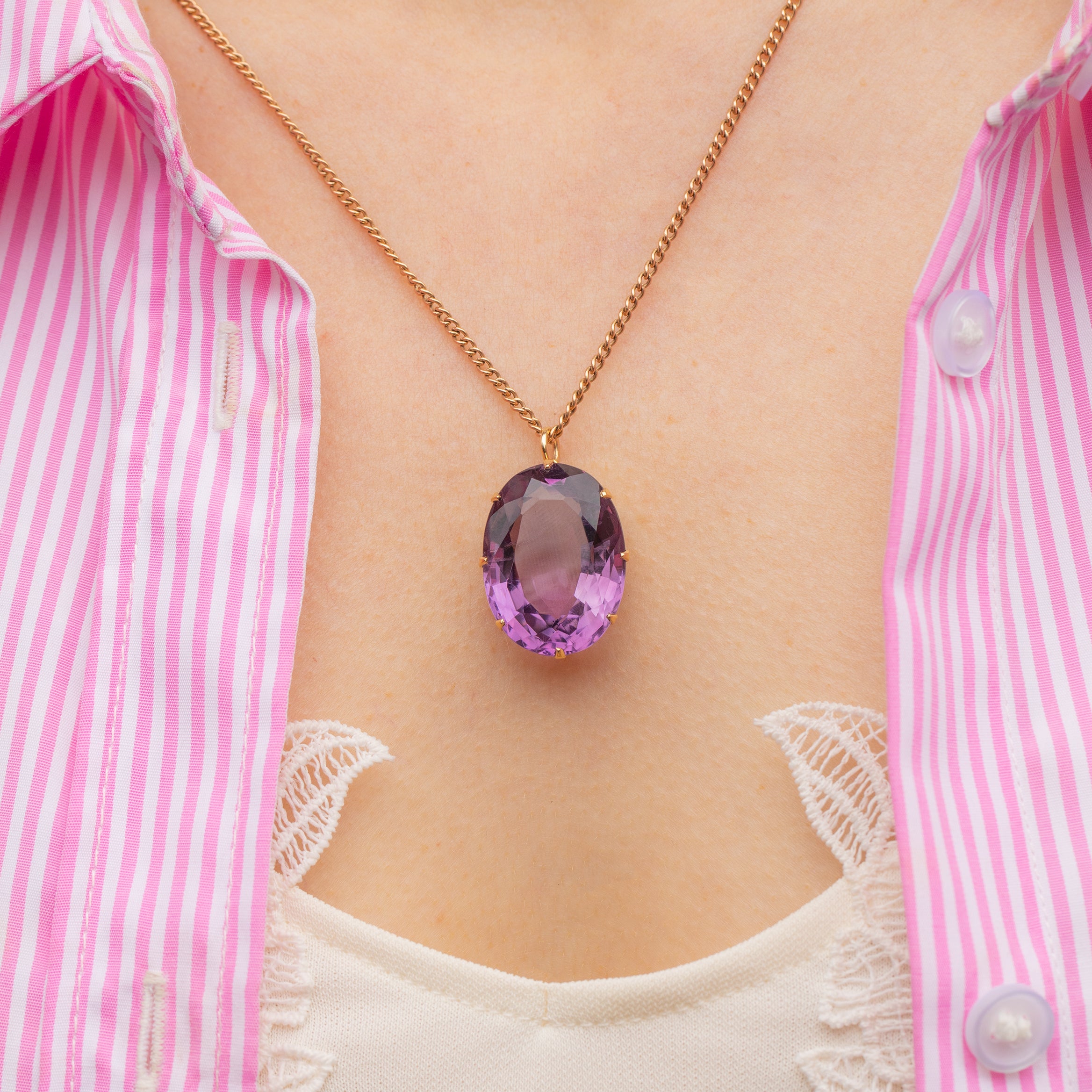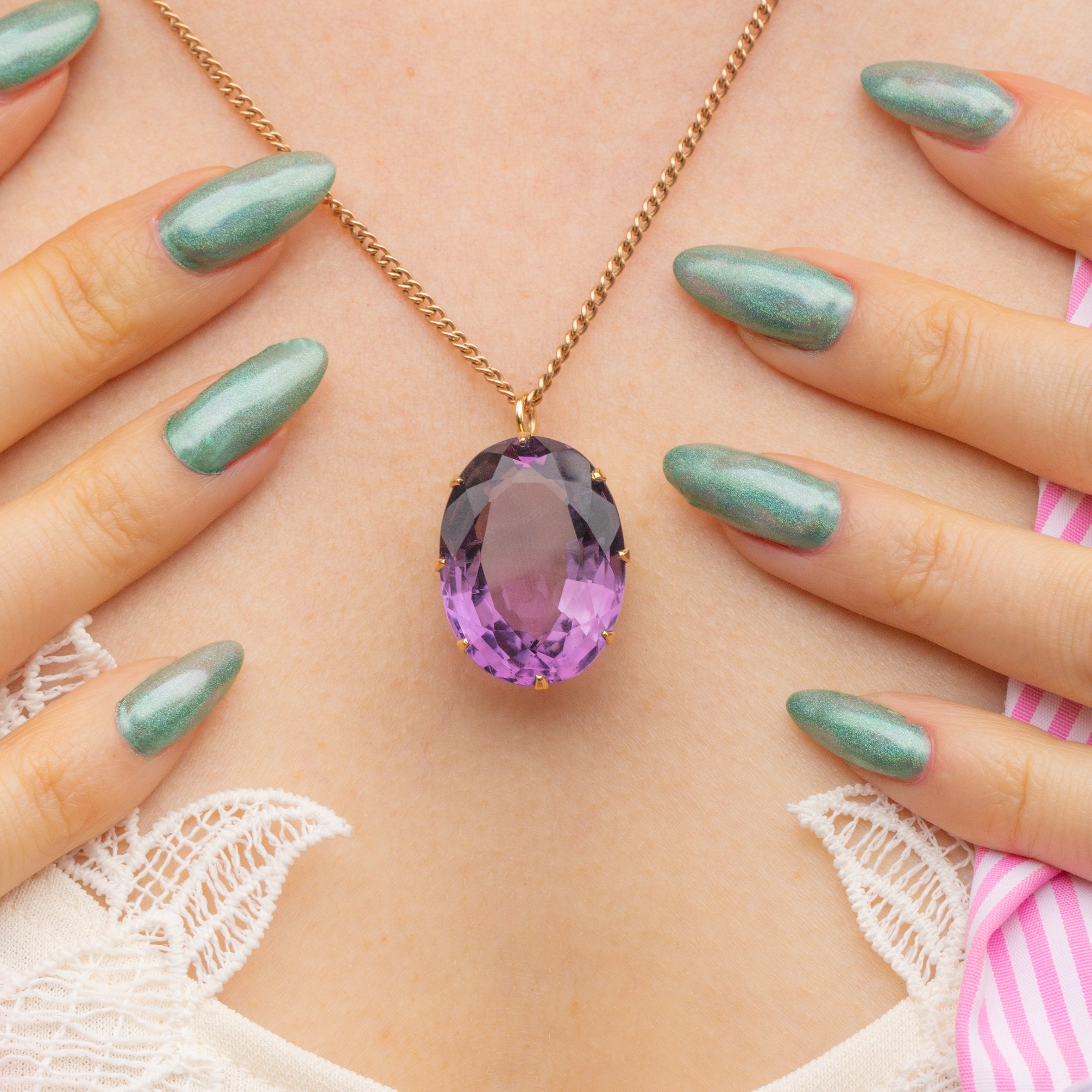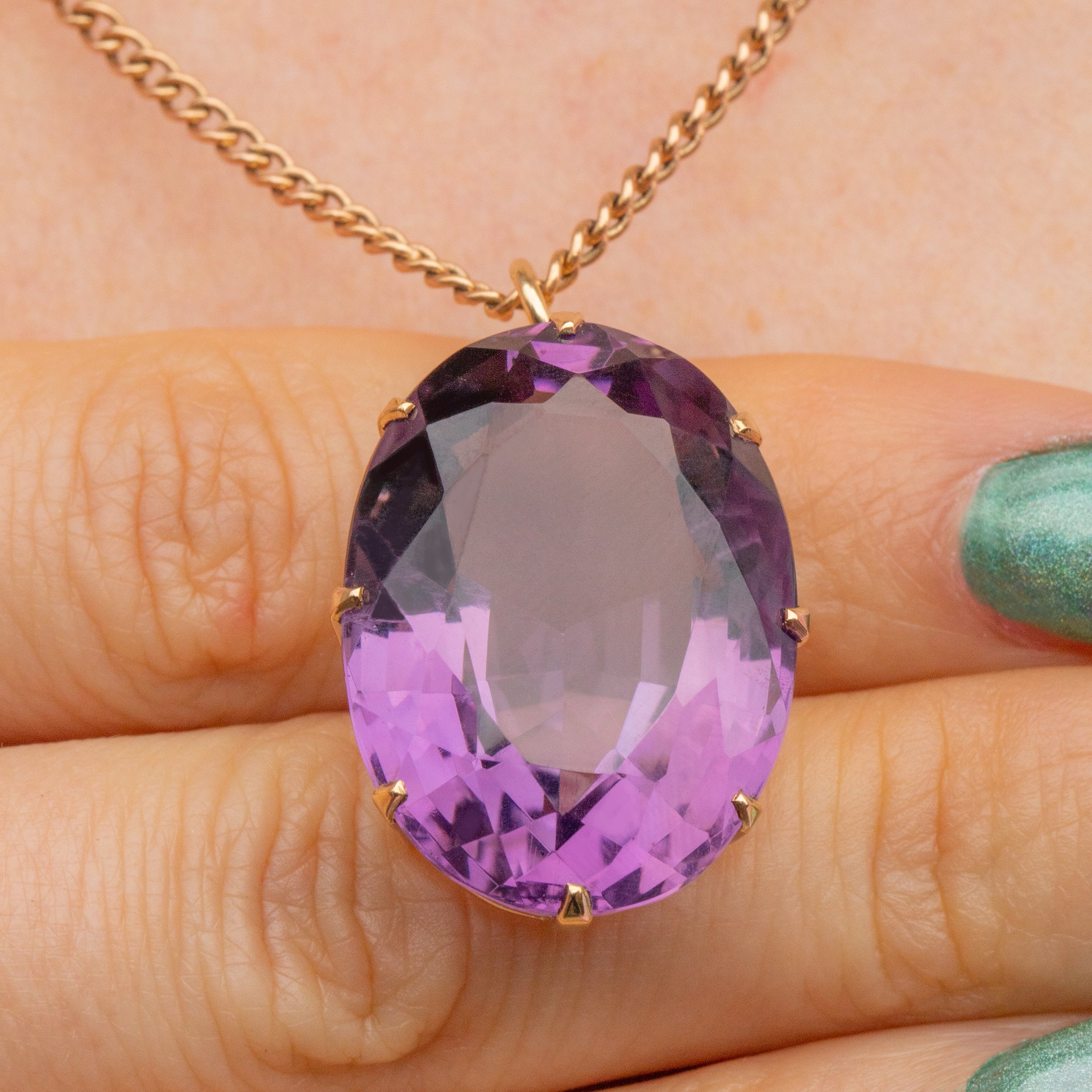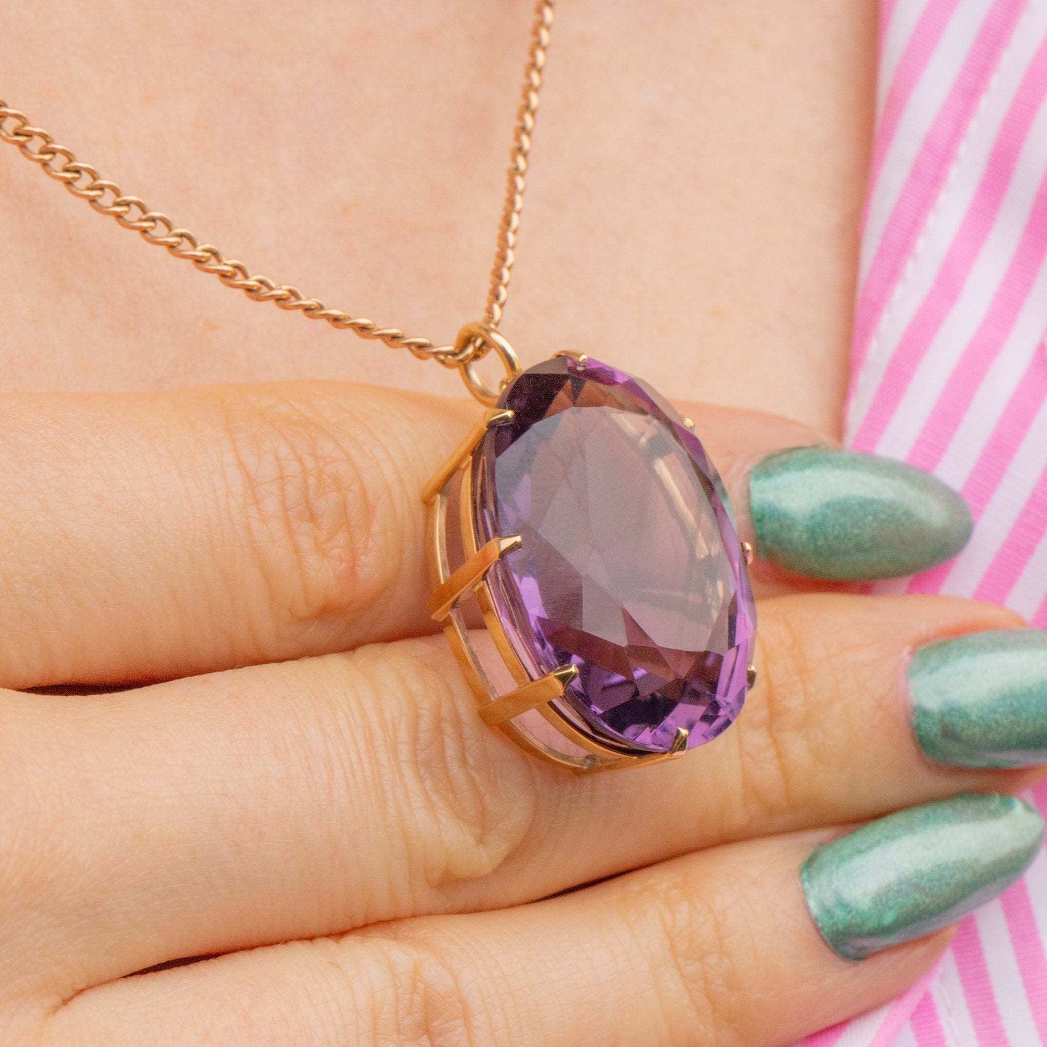 This large 9ct Gold Amethyst pendant is everything your collection needs! Set in 9ct Gold, a 30.00ct oval-cut Amethyst is poised upon a basket setting that allows light to stream through from every angle.