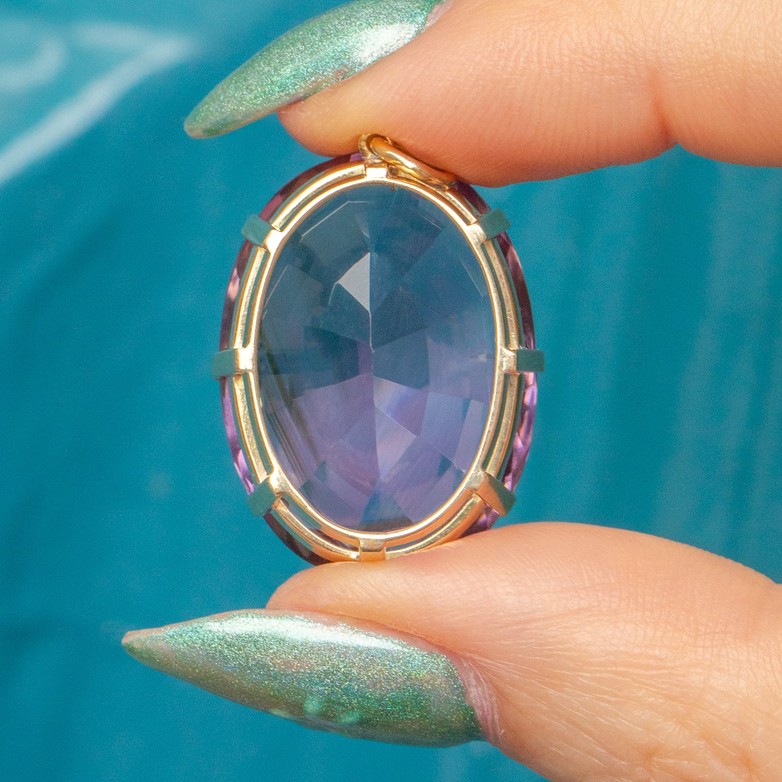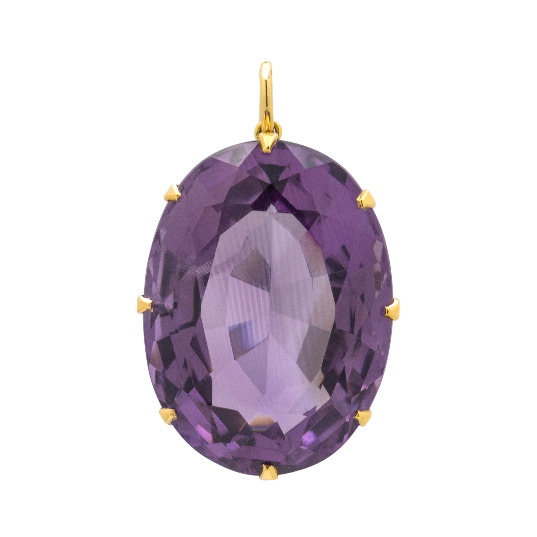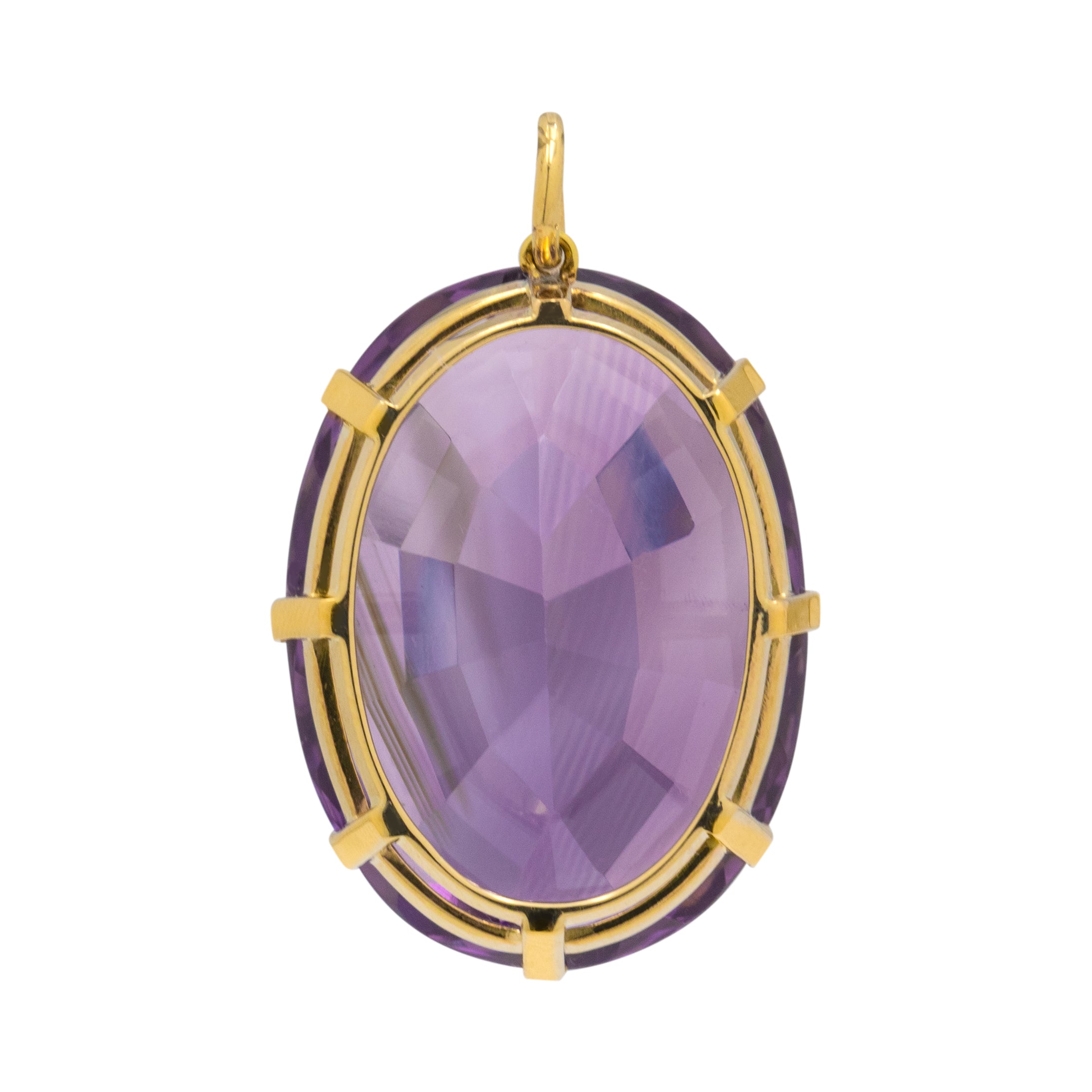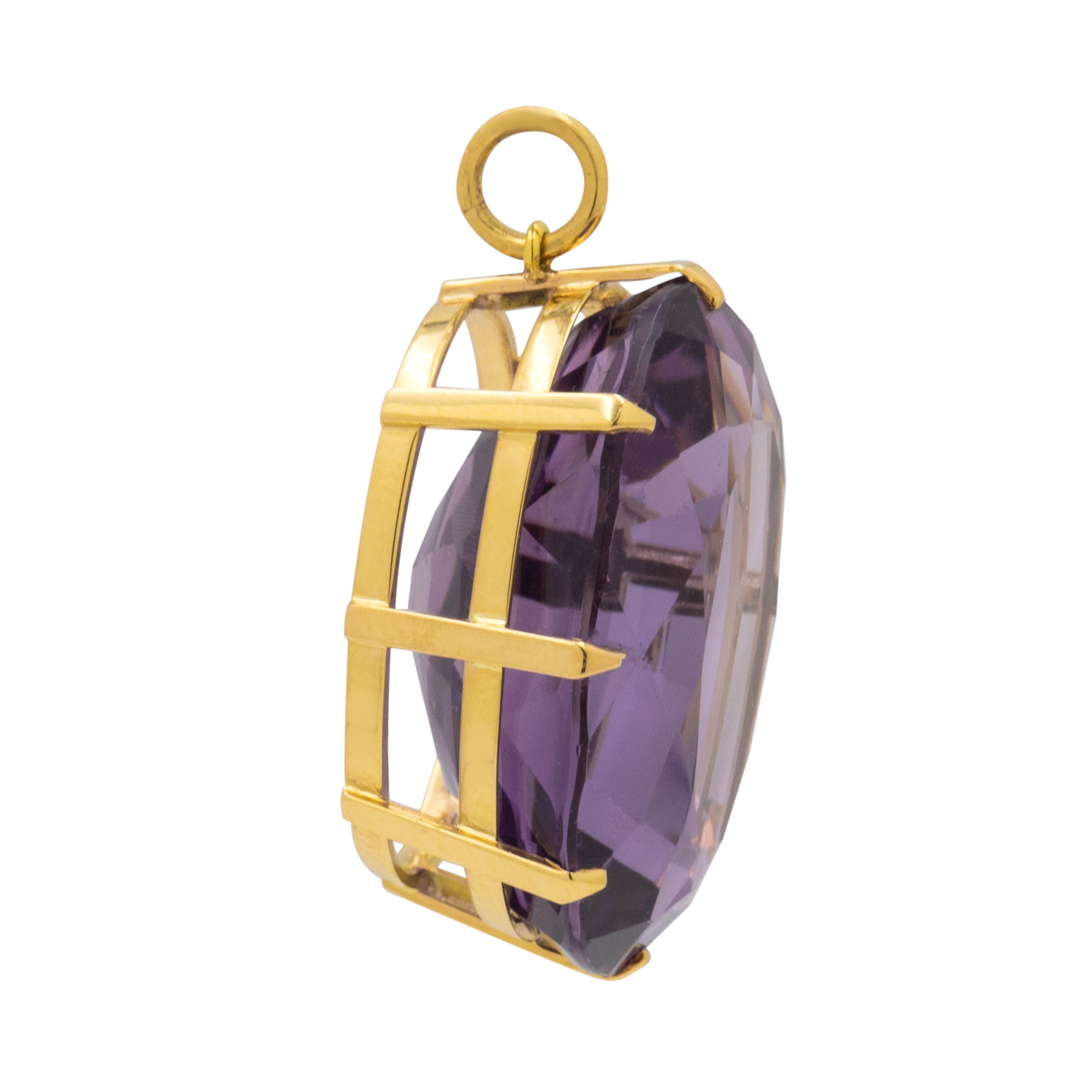 This large 9ct Gold Amethyst pendant is everything your collection needs! Set in 9ct Gold, a 30.00ct oval-cut Amethyst is poised upon a basket setting that allows light to stream through from every angle.