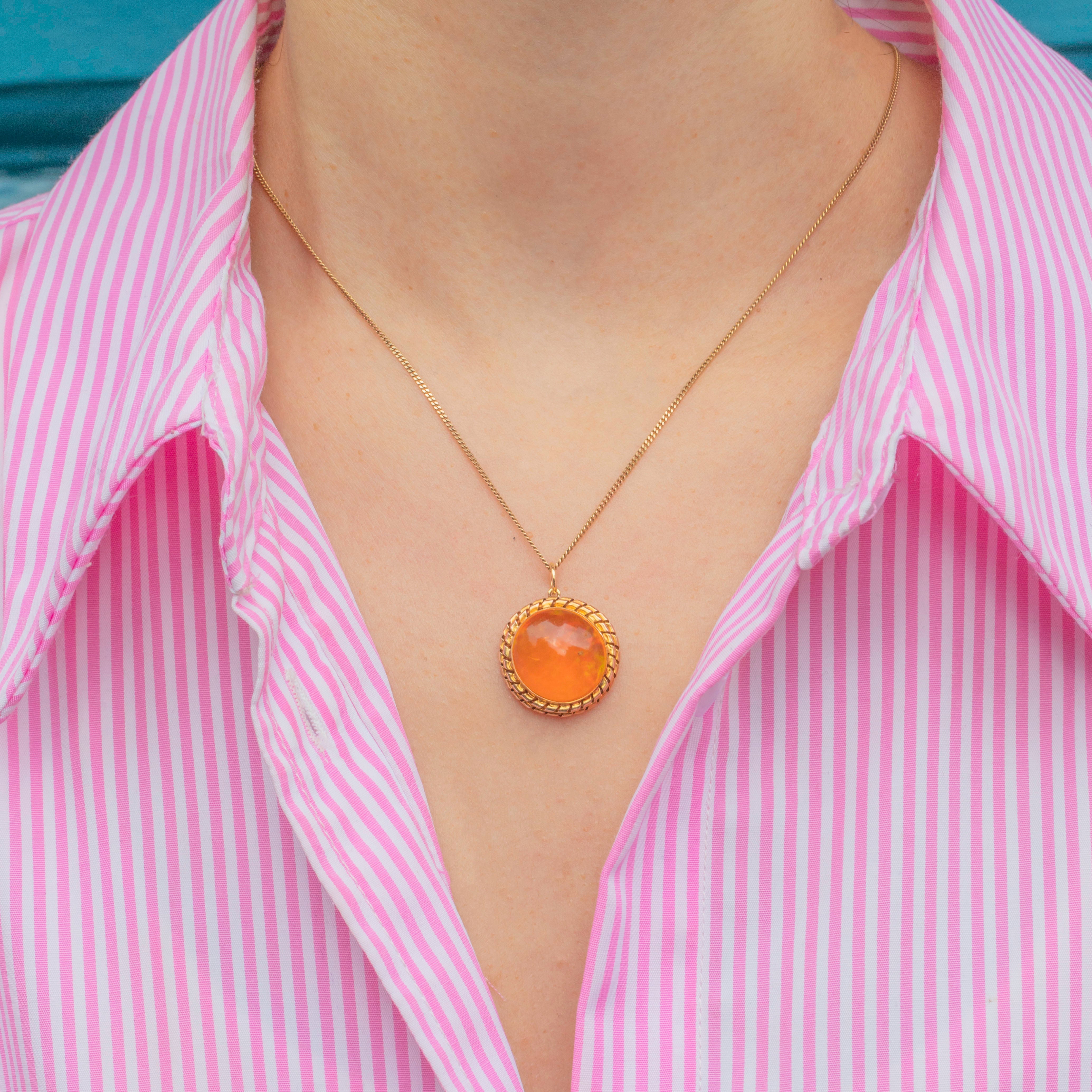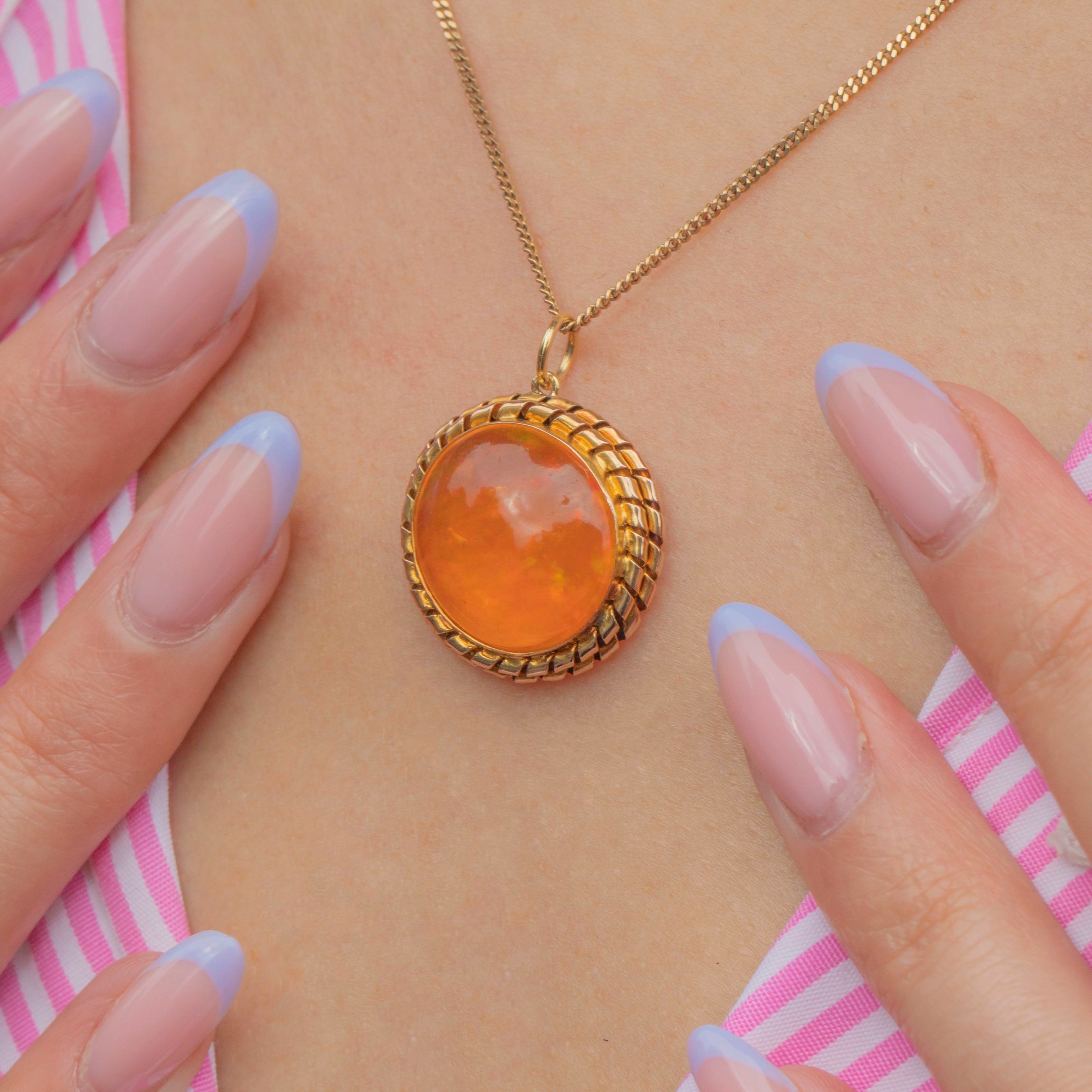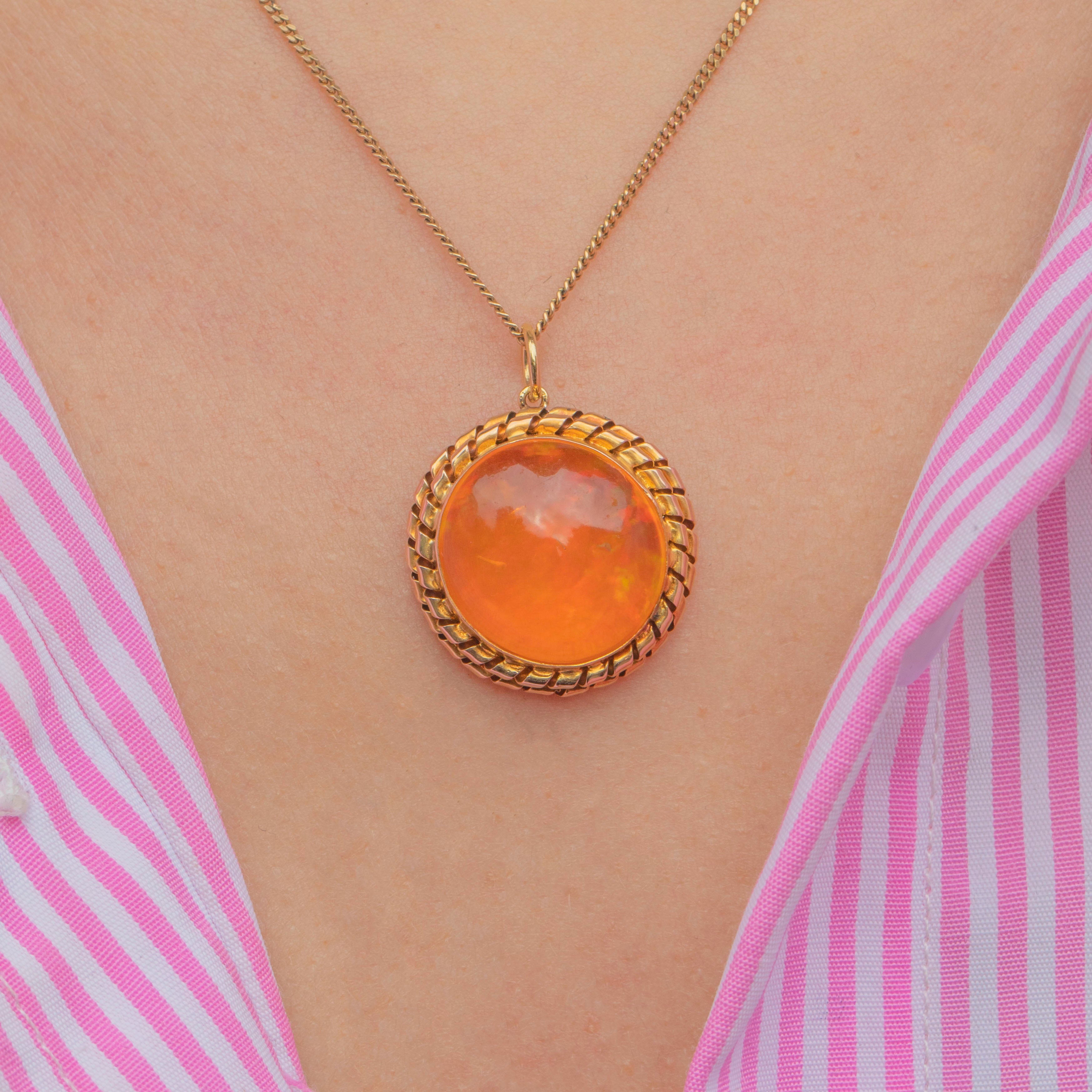 This large antique 18ct Gold Fire Opal pendant will bring a fiery radiance to your repertoire! The natural solid 7.35ct Fire Opal cabochon will instantly enchant you, with its swirling ornage hues revealing a luminous green flash as she moves in the light.
