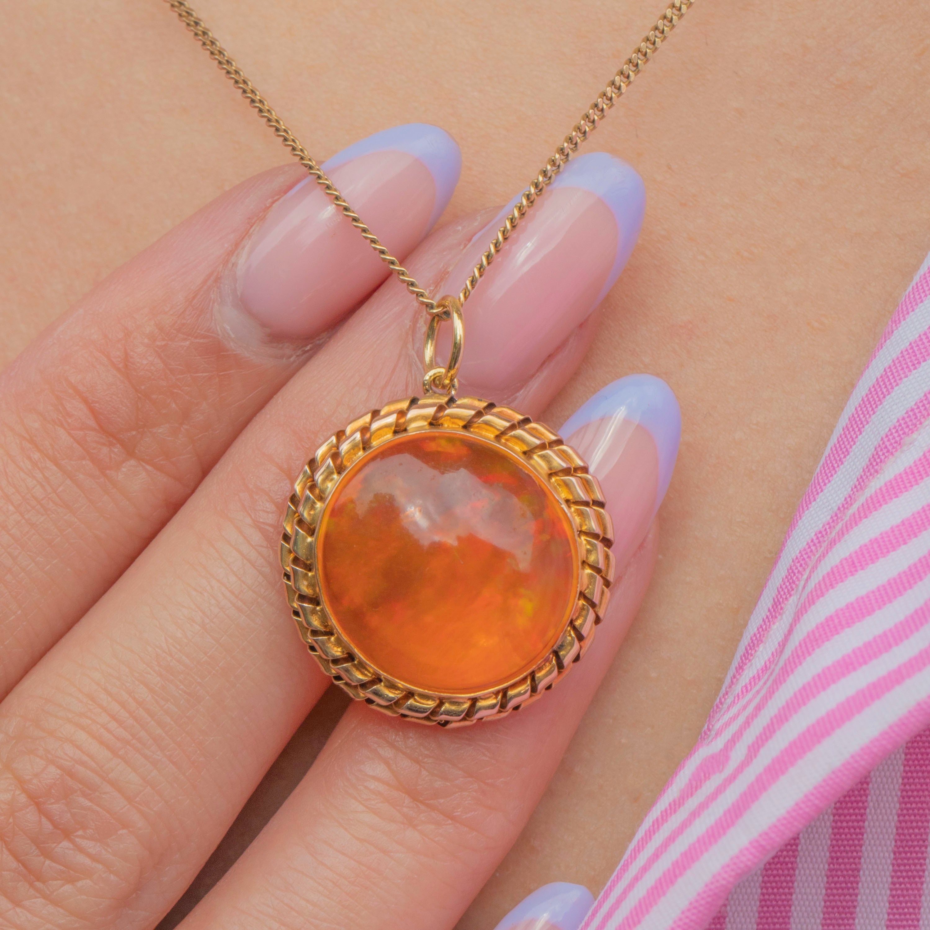 VERY GOOD: This large antique 18ct Gold Fire Opal pendant is in very good condition. The Opal has a magnificent vibrancy and a sought-after flash. The Opal is smooth for the most part, with only a couple of small fleabites noticeable under close inspection. The Opal is secure within its bezel setting, and the Gold coils have held their form well. The Gold has an even saturation throughout, and the back of the pendant is perfectly smooth, sitting comfortably against the chest.