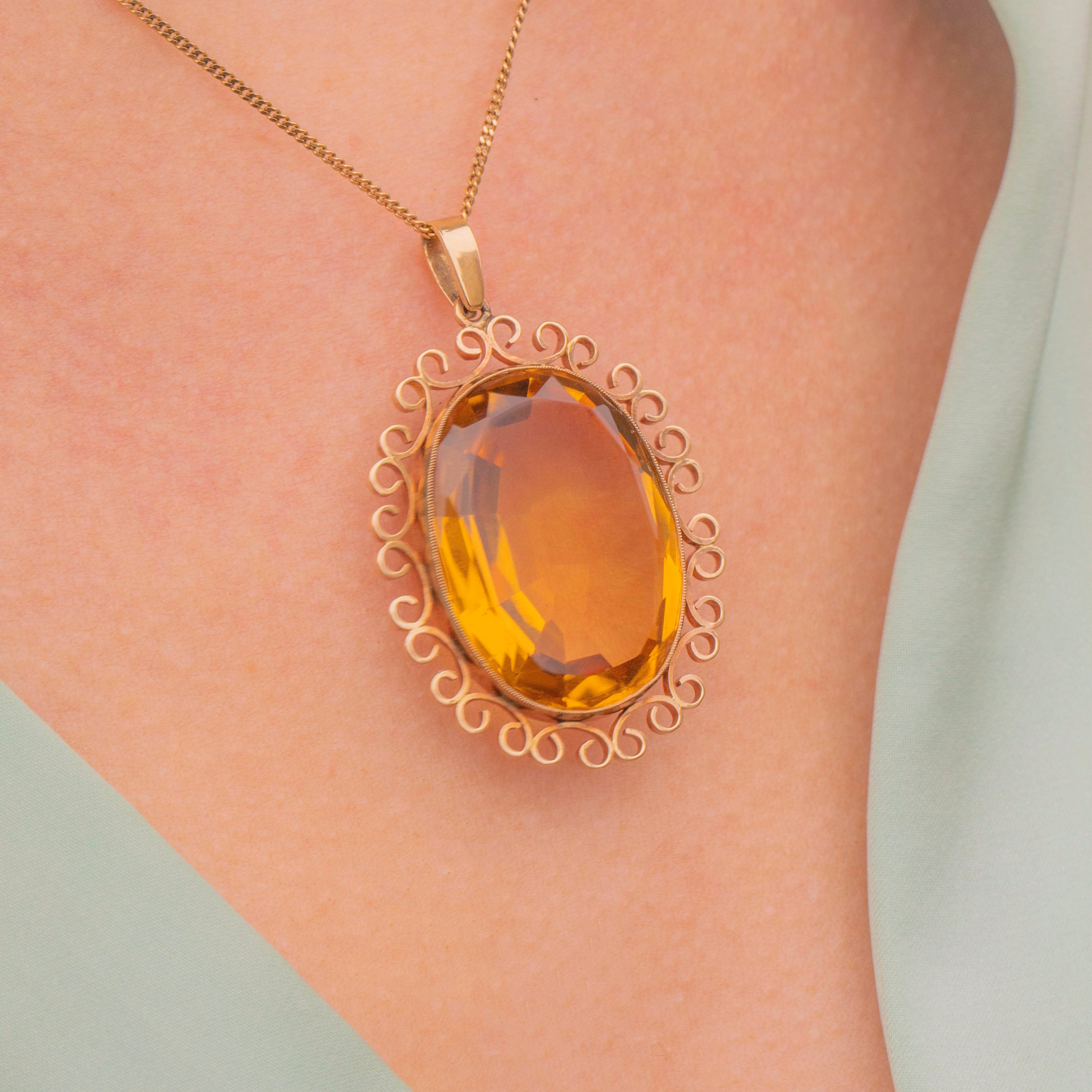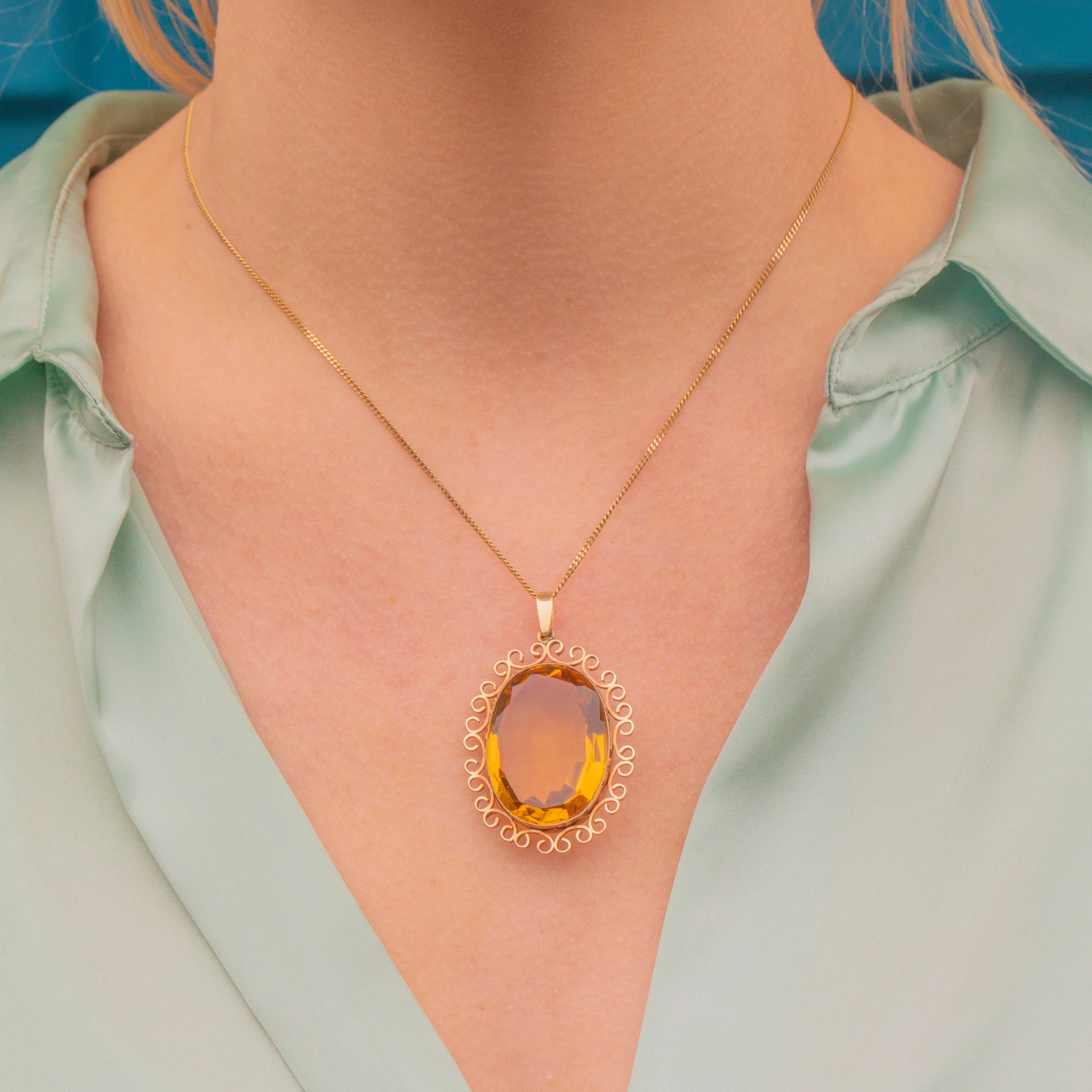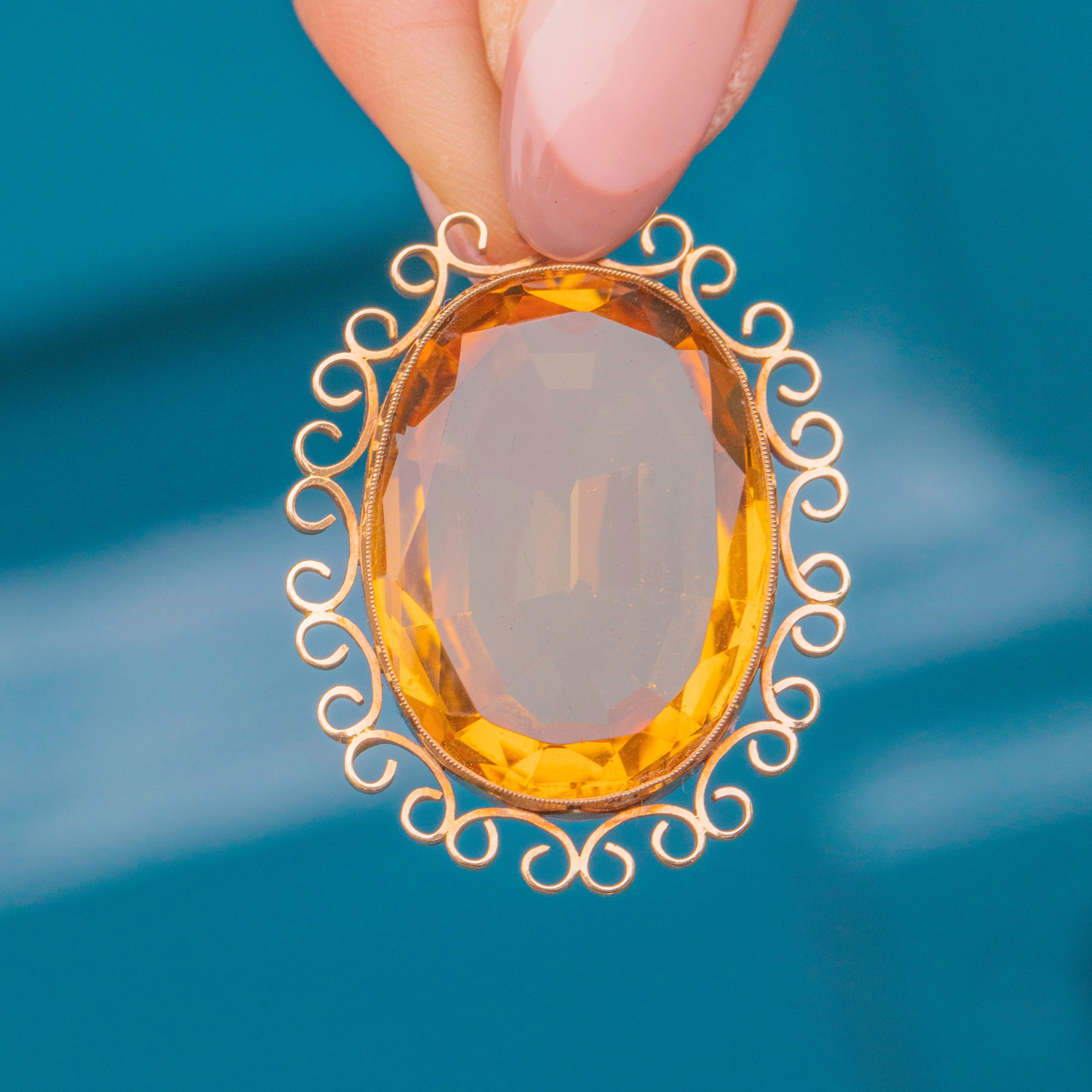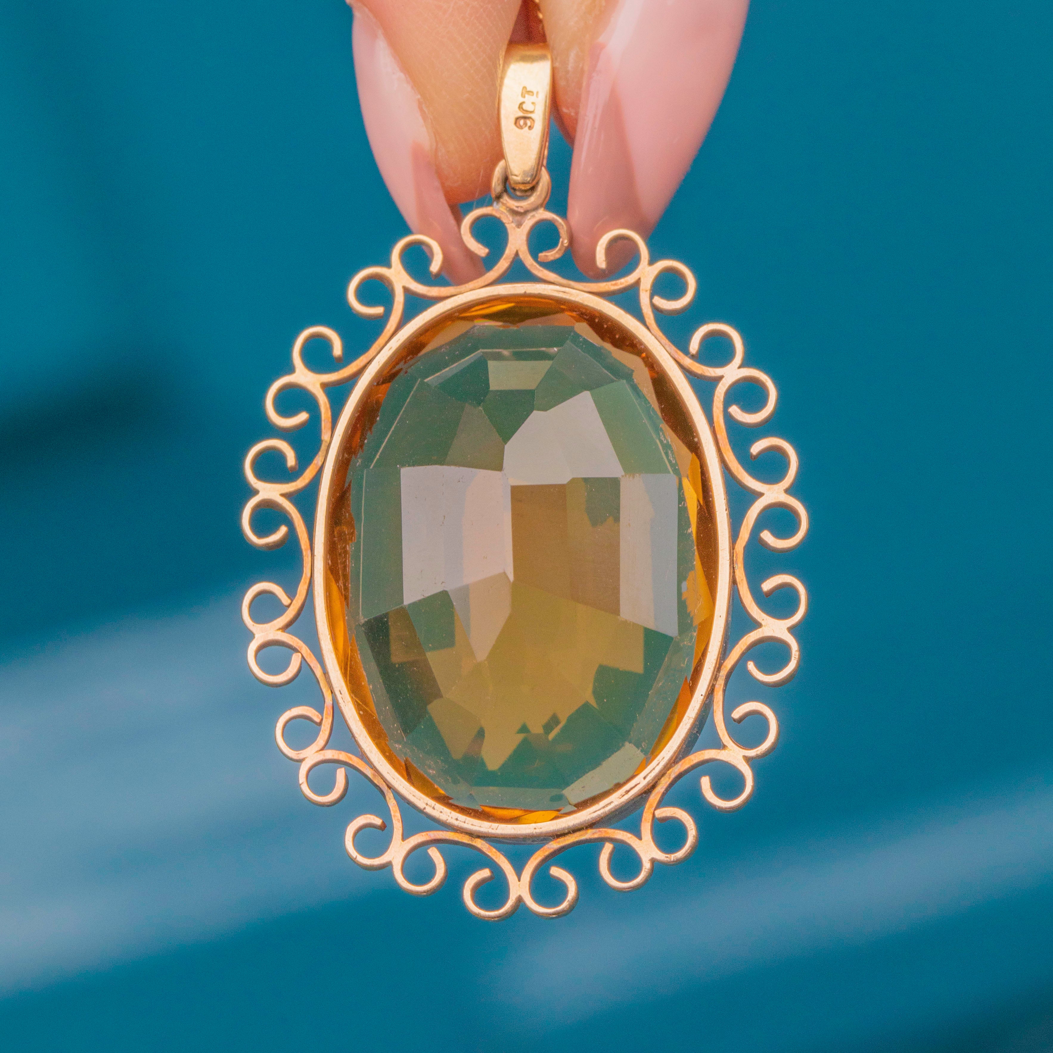 A zesty antique 9ct Gold Citrine pendant to add to your collection! Set in buttery 9ct Gold, sweet lemon hues seep out of the crisp facets of this large oval Citrine, boasting a whopping 25.82ct!