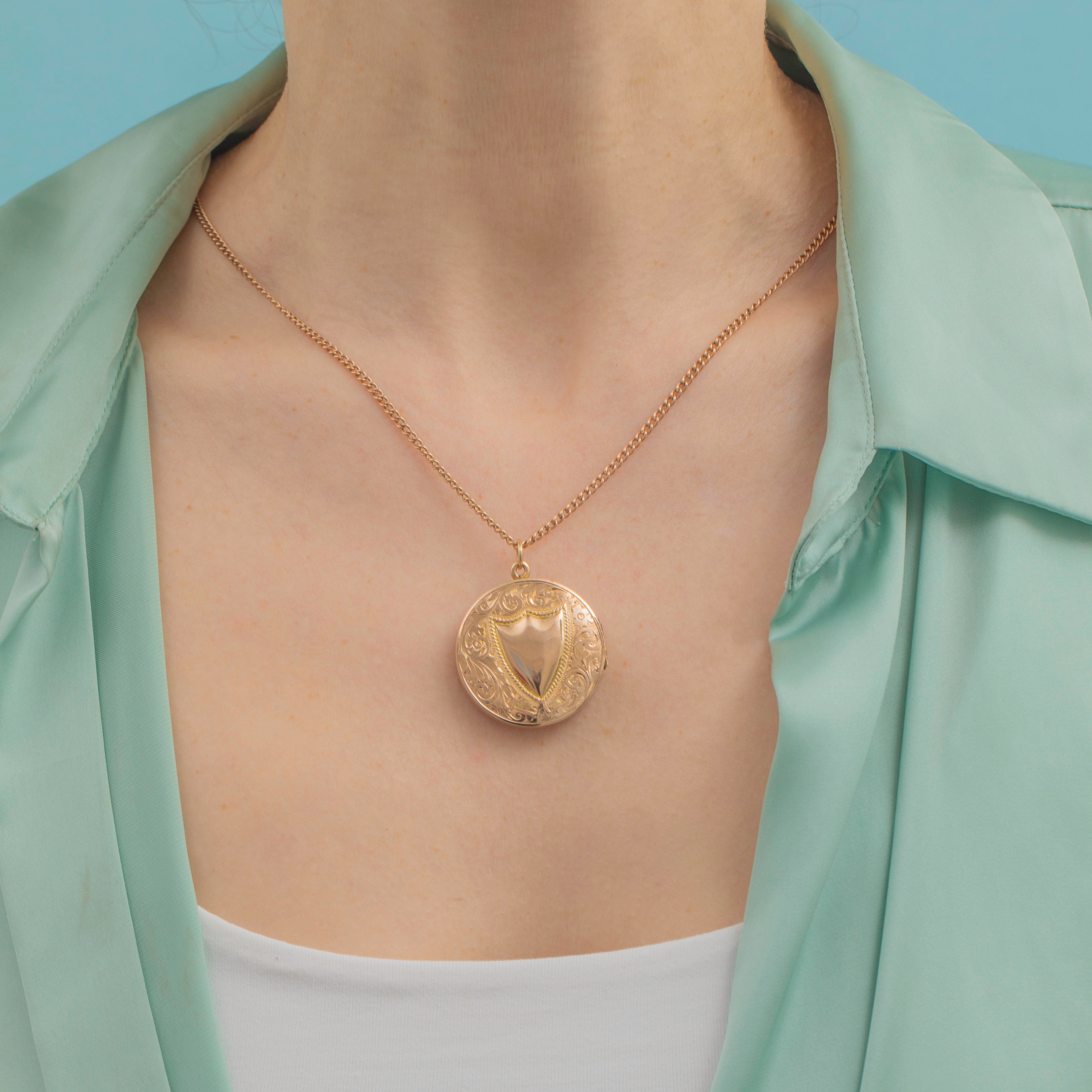 This exceptional large antique 9ct Gold engraved round locket will instantly add some Victorian luxury to your outfit! Both sides of the locket have bold shield motifs, to which you could add a personal engraving if you wish, and open to reveal a space for a cherished photograph to be placed.