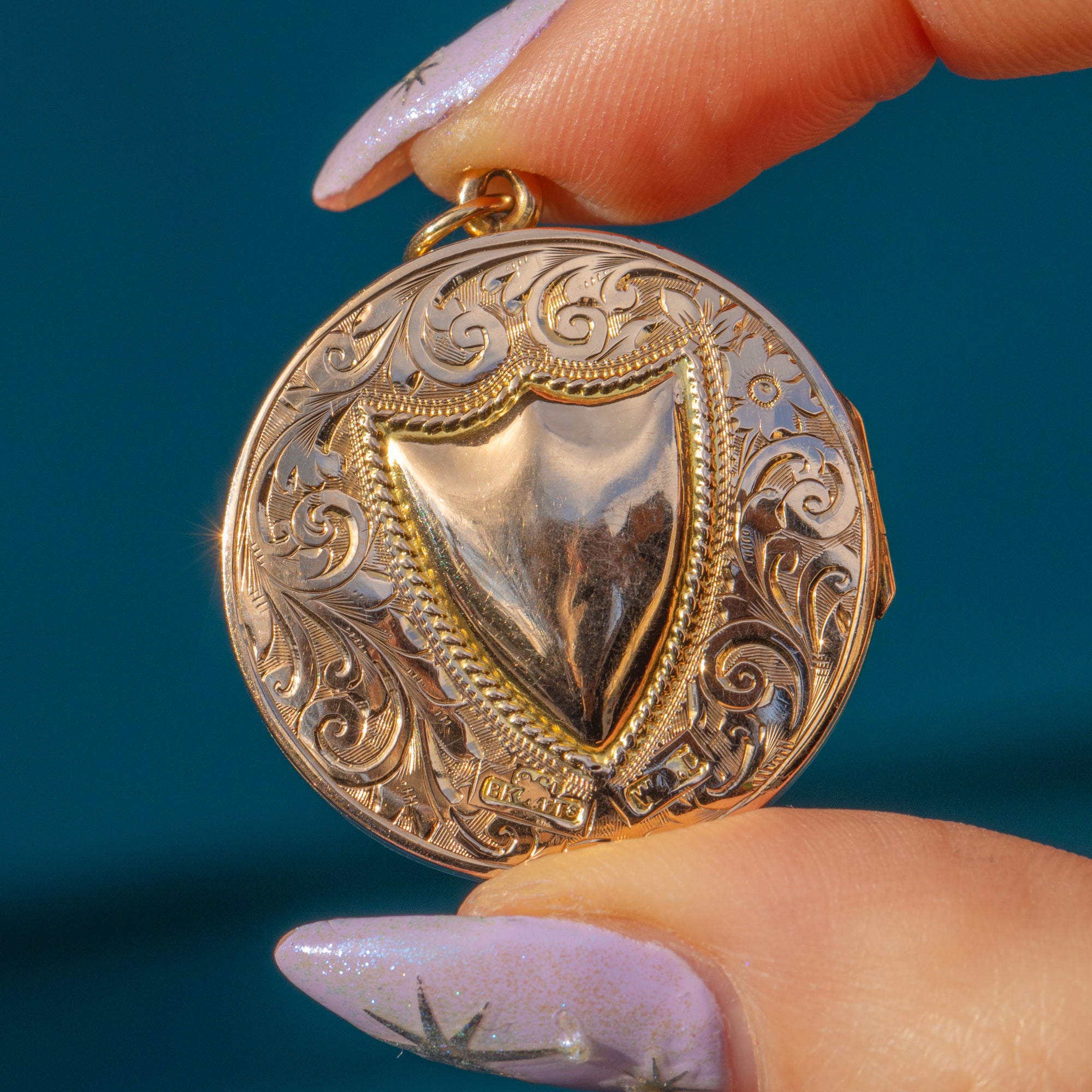 Large Antique 9ct Gold Engraved Round Locket, Shield Motif