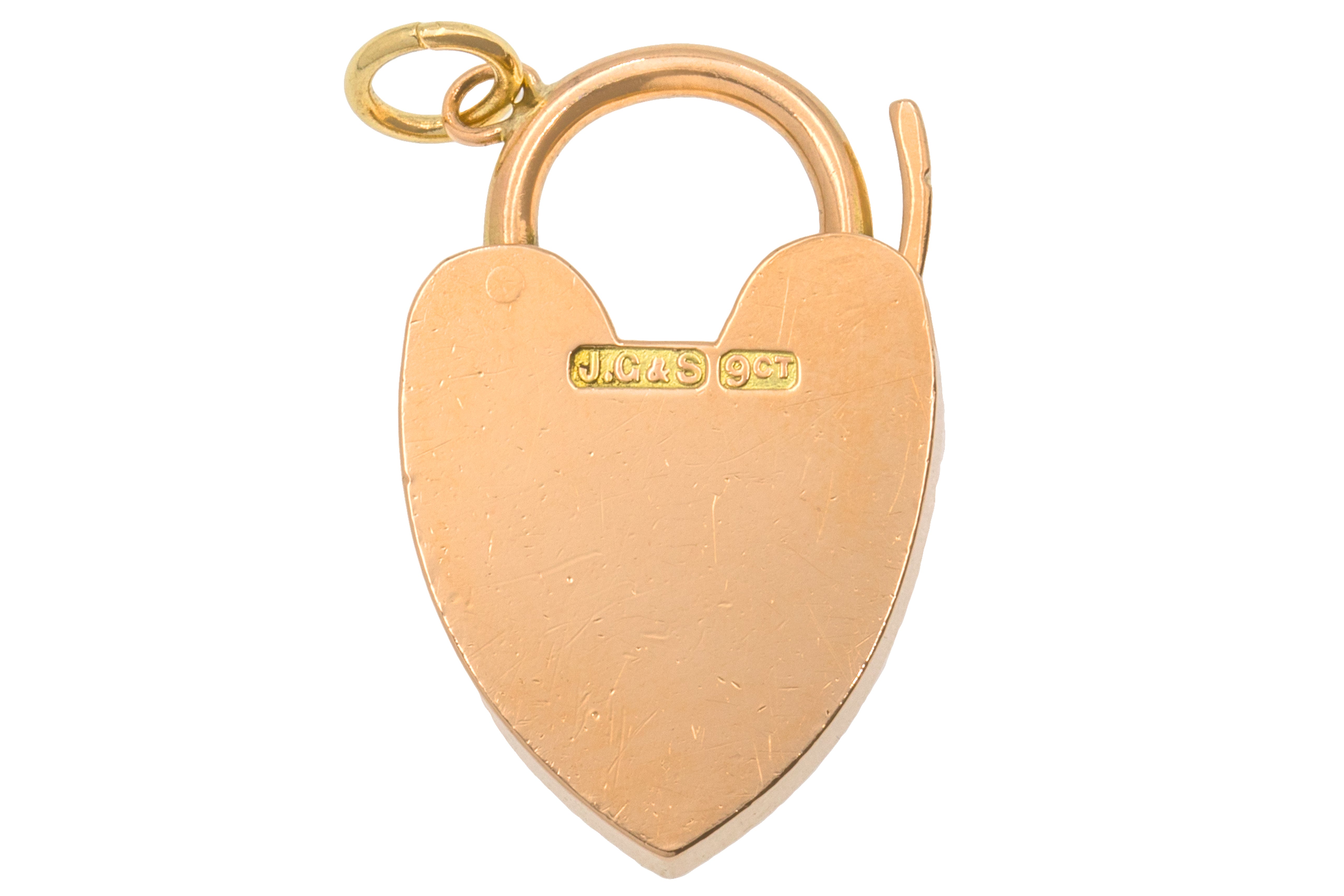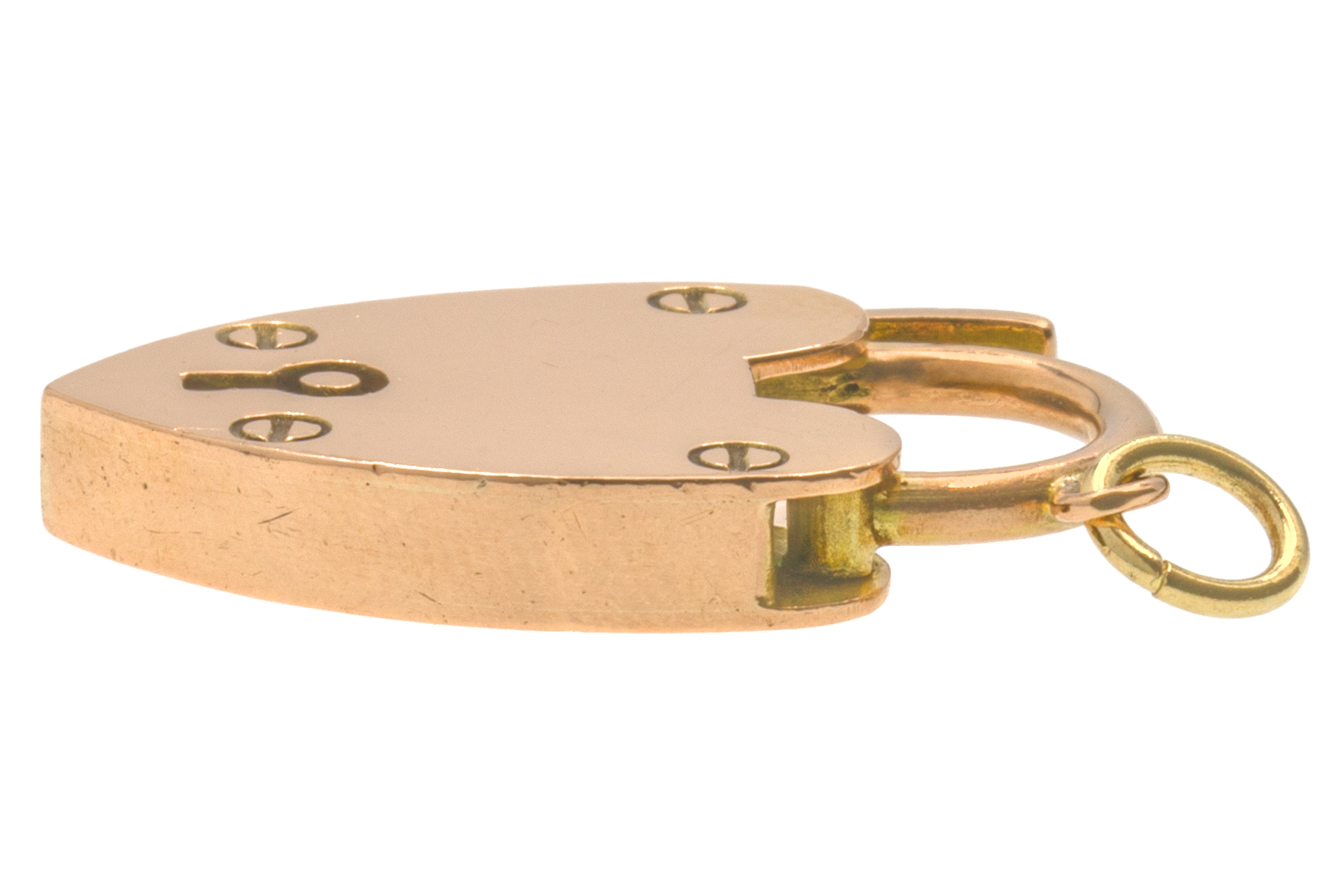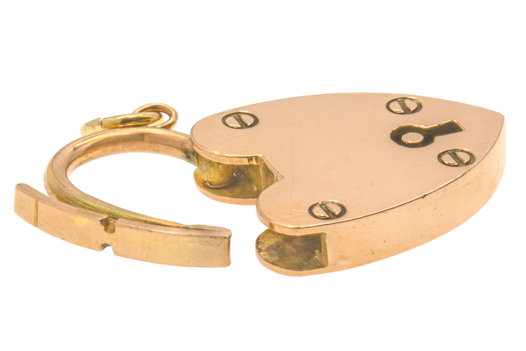 GOOD TO VERY GOOD. This large antique 9ct Gold heart padlock pendant is in very good condition overall. The padlock mechanism works perfectly, and there is a little jump ring so you can wear it with a chain. There are some surface scratches to both the back and front of the piece, but this is a sign of how much she has been adored through the decades.