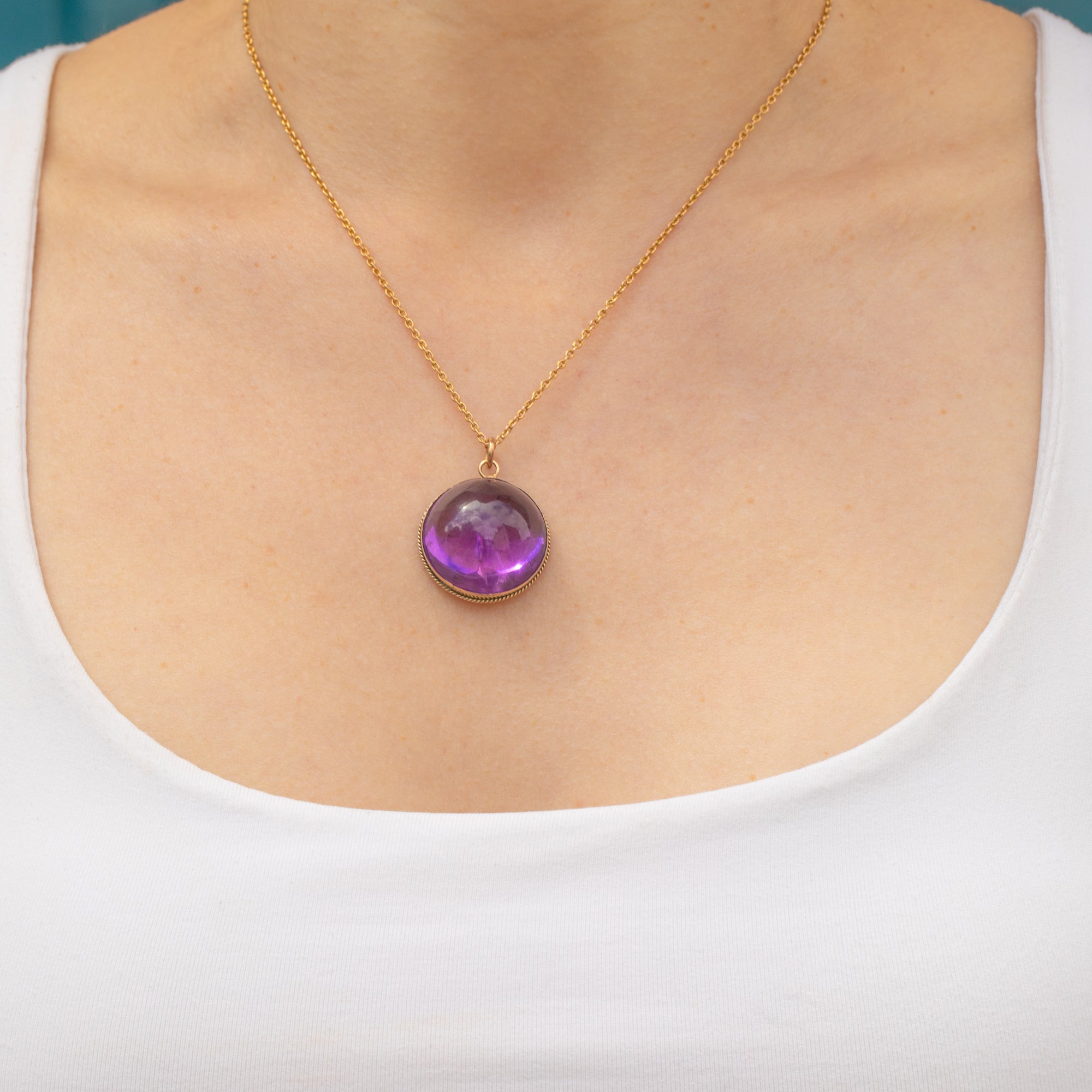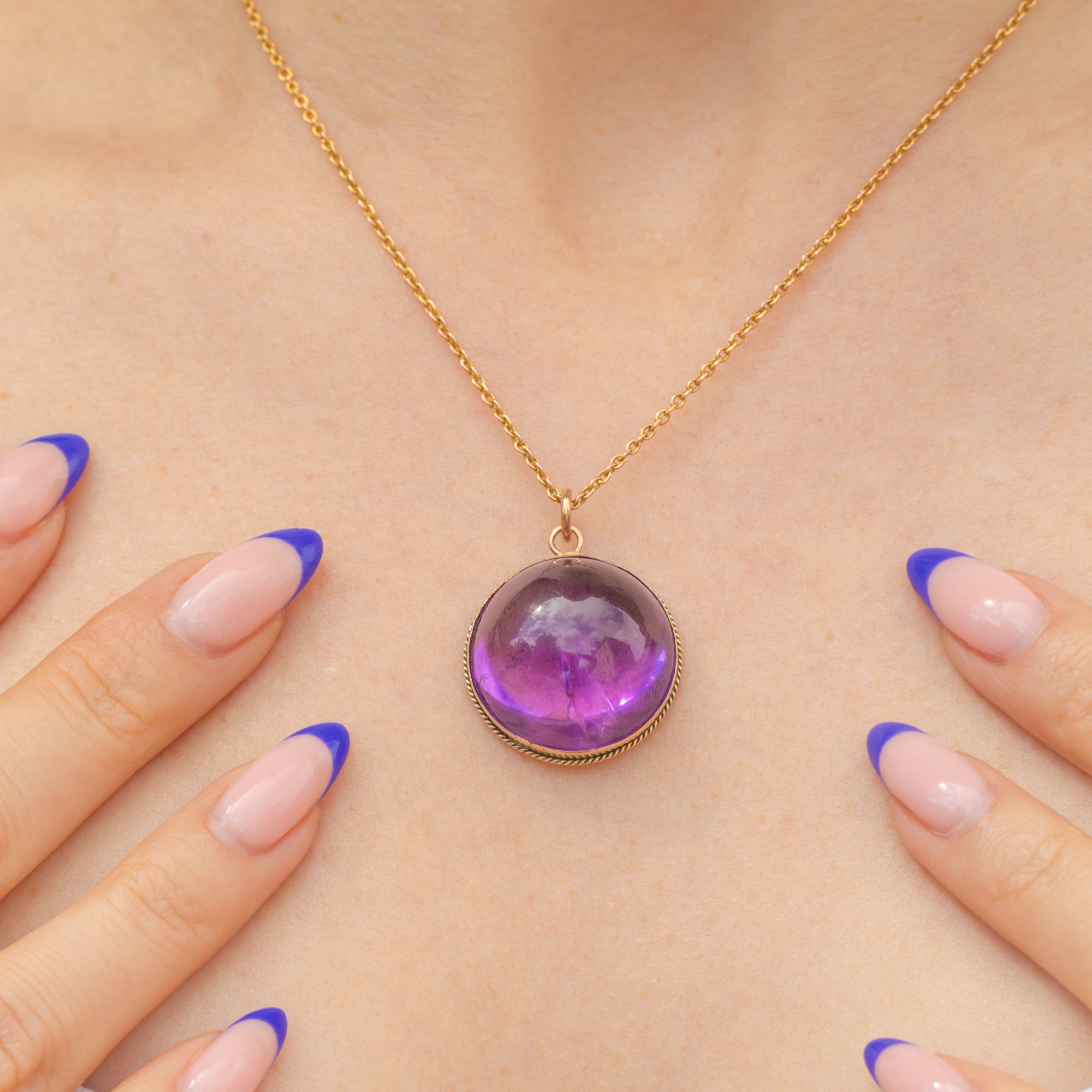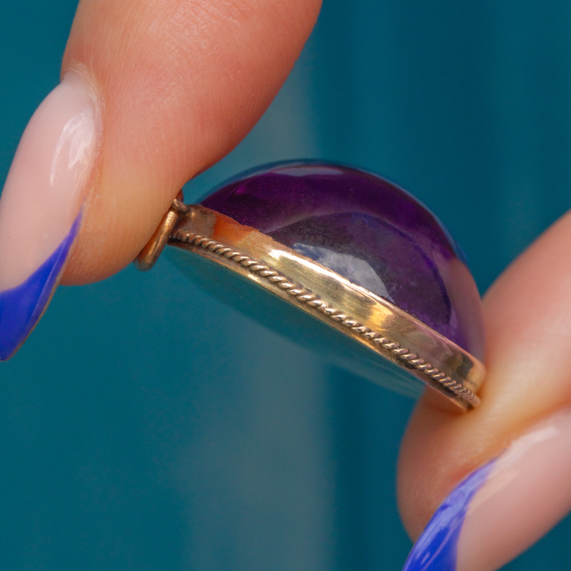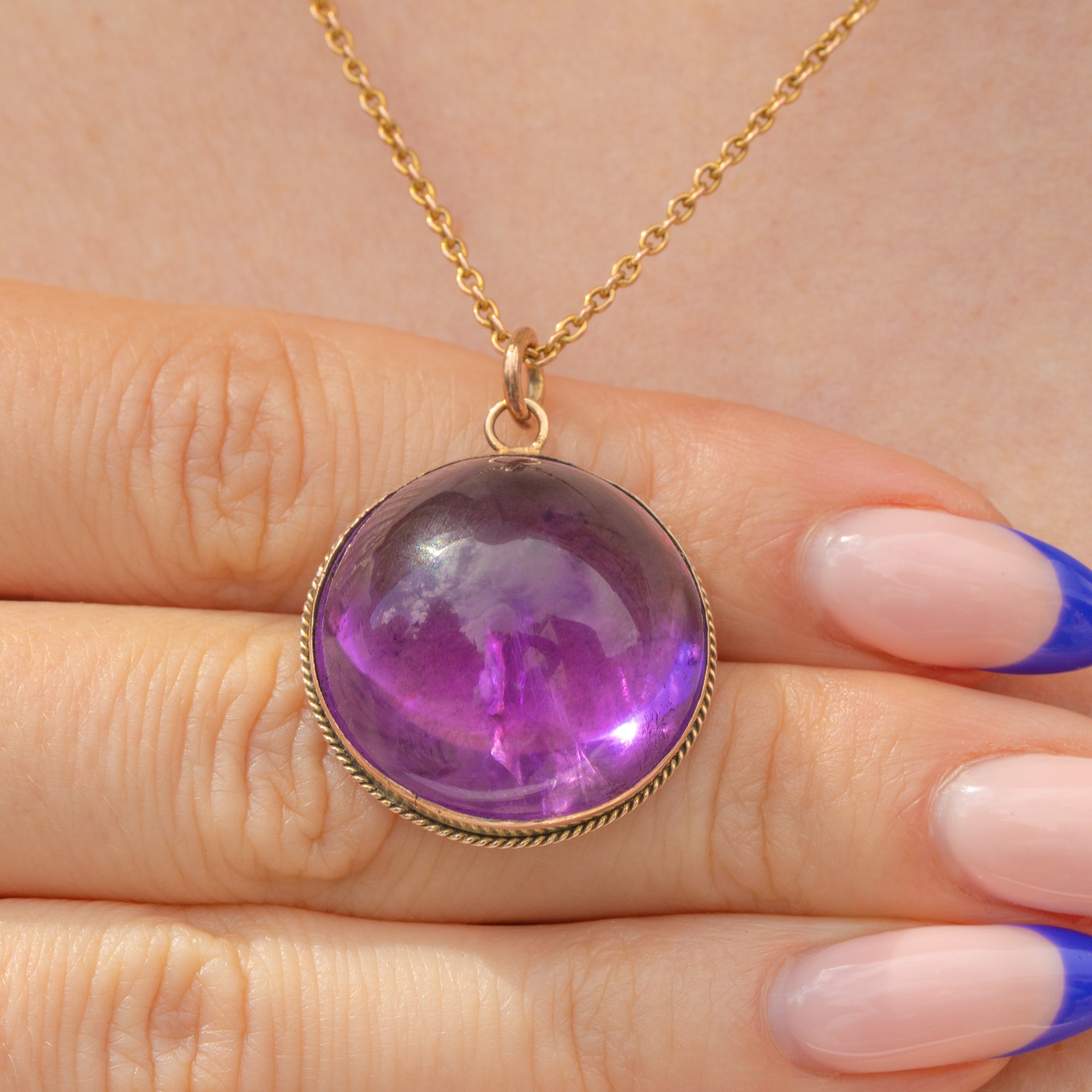 If you're a lover of Amethysts, this large Victorian 9ct Gold Amethyst cabochon pendant will definitely tickle your fancy! An unmissable 34.50ct Amethyst cabochon, akin to a mystical orb, takes centre stage embraced by a 9ct Gold bezel setting.