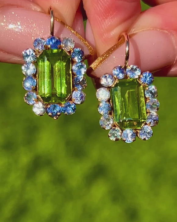 Circa 1890, these vivid Victorian cluster earrings are all about colour, with juicy green emerald-cut Peridots and framed by a halo of bright blue Sapphires.