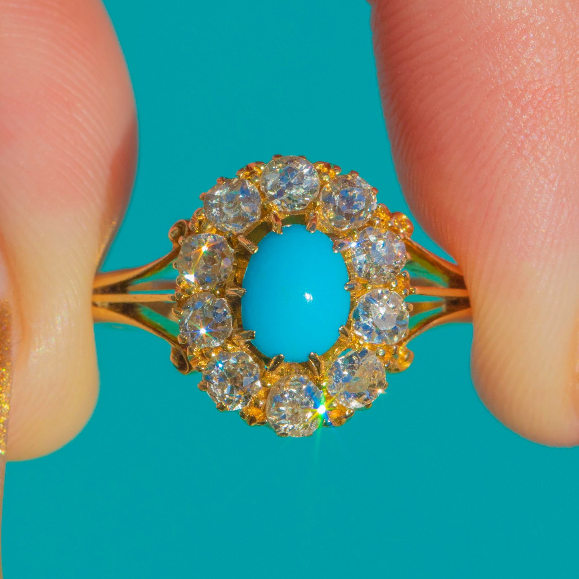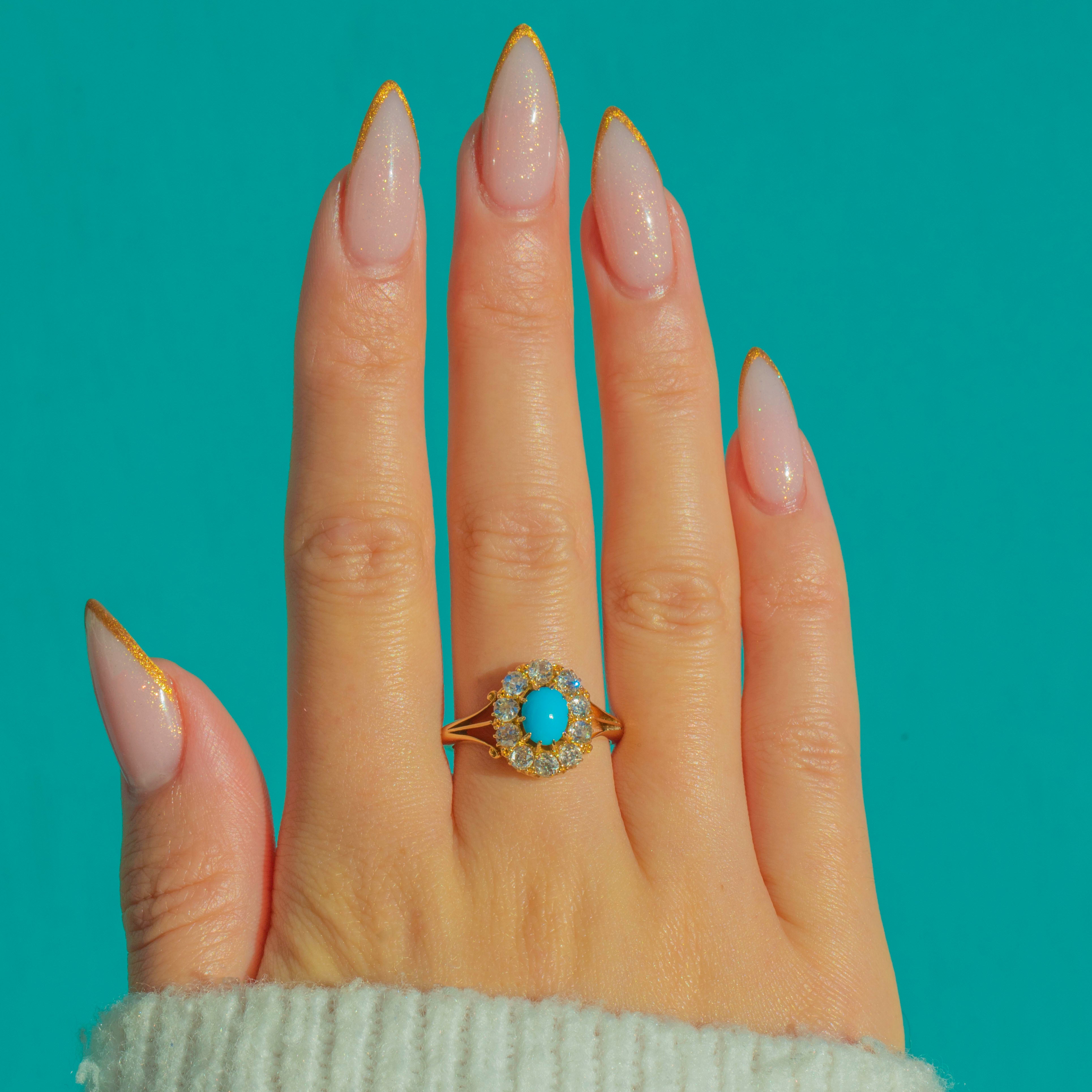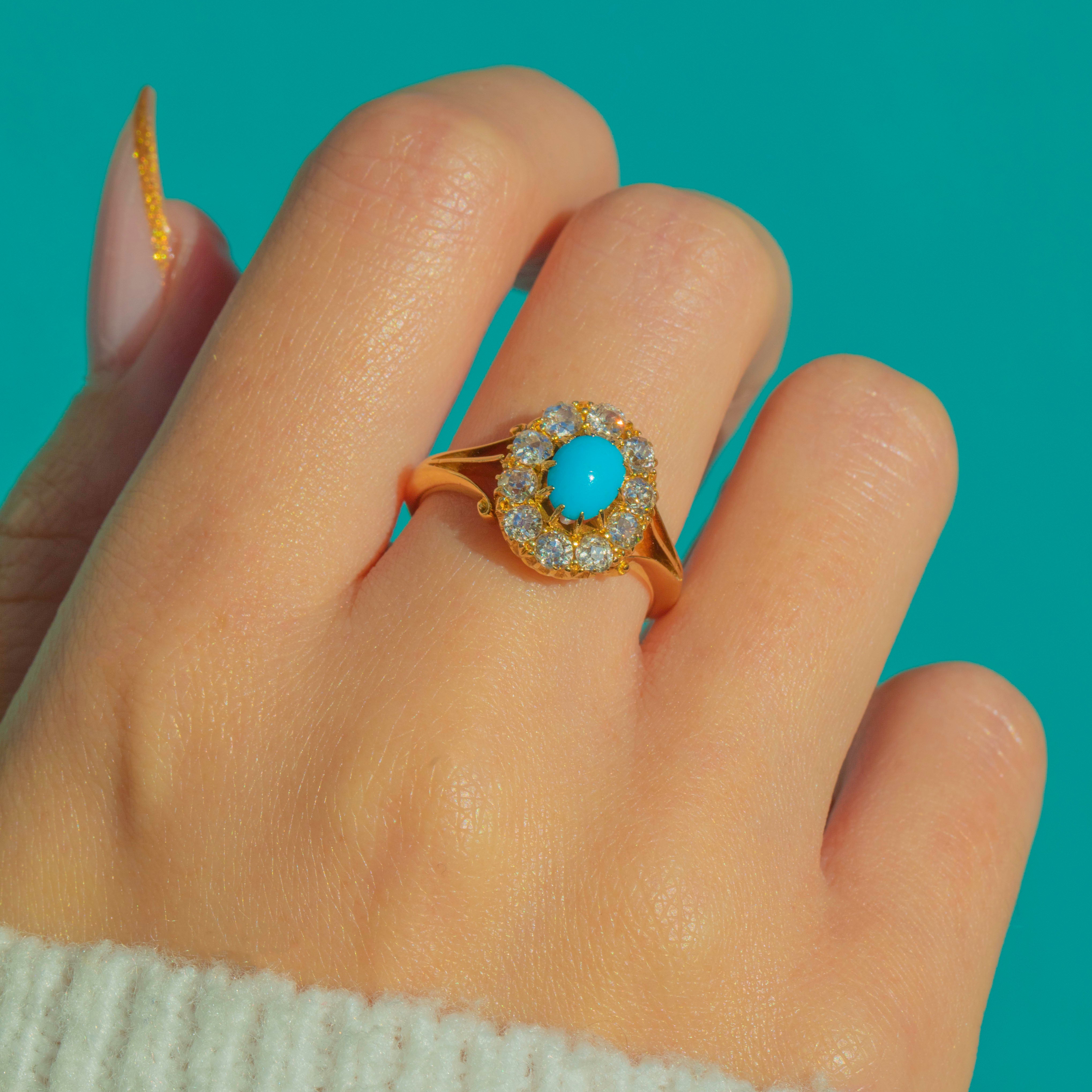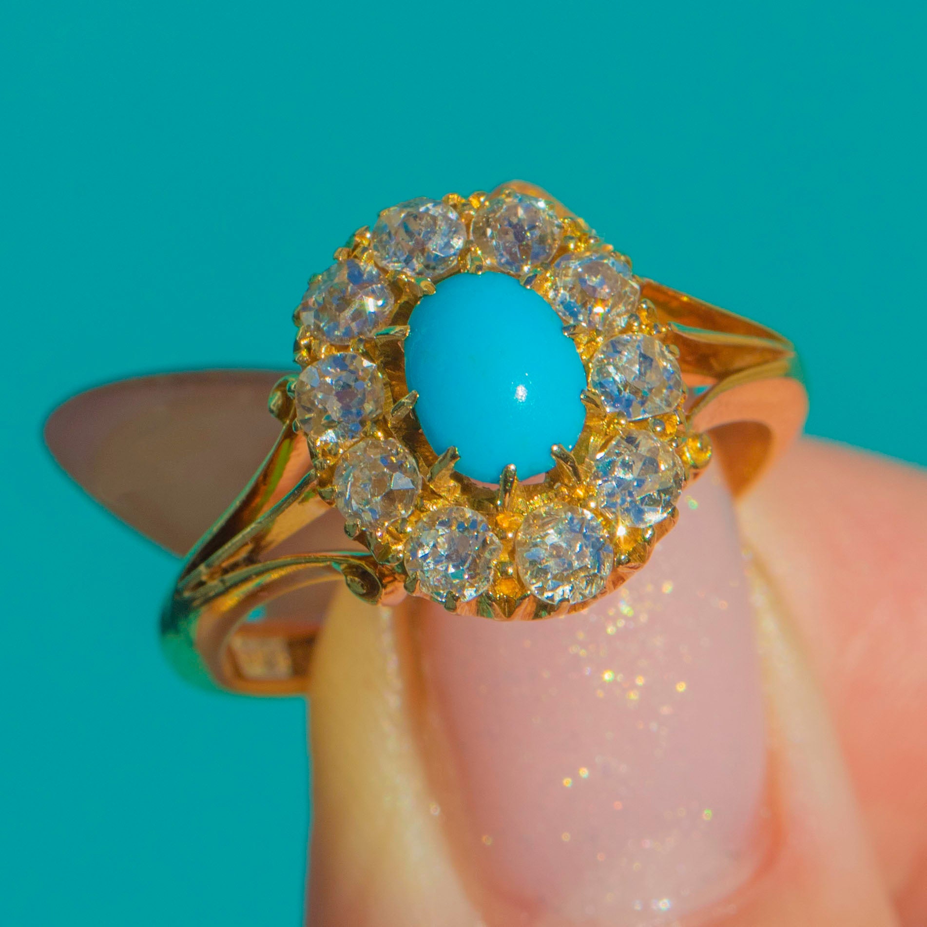 Radiant colour meets antique sparkle in this Late Victorian cluster ring. A vivid sky-blue Turquoise is framed by a halo of bright Diamonds, all set in rich 18ct Gold. The sculpted split shoulders and decorative open gallery lend delicate detail while keeping the focus on that glorious pop of blue.