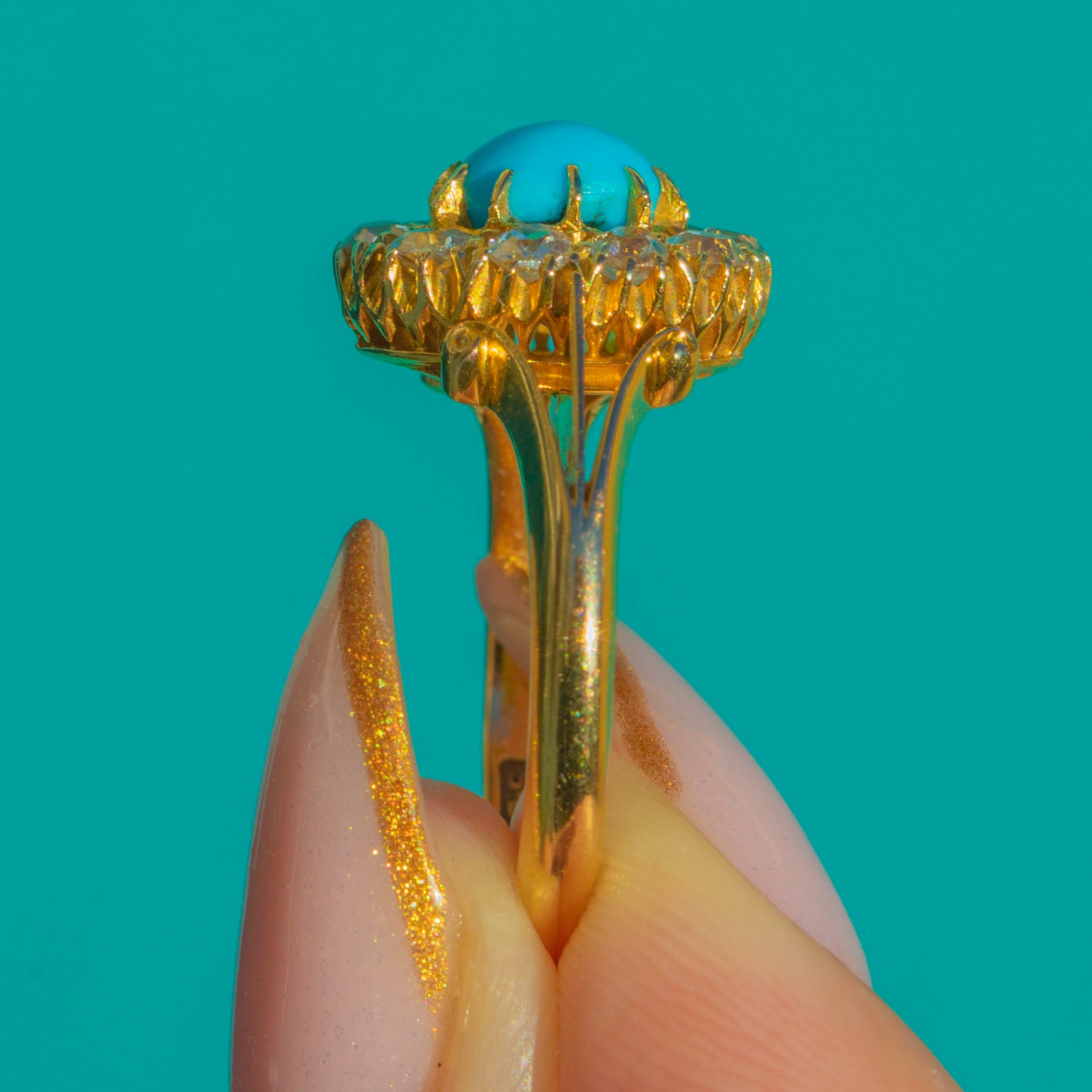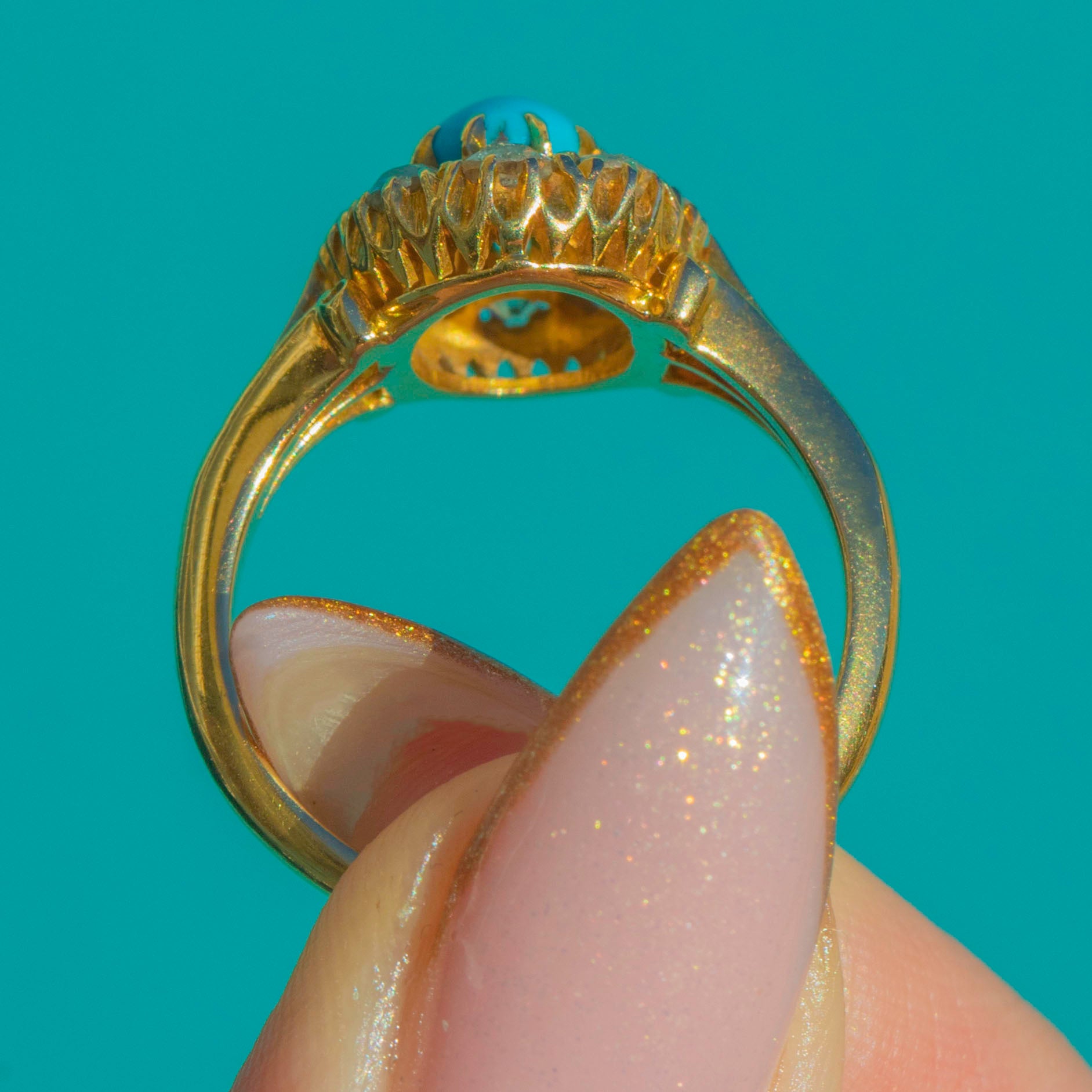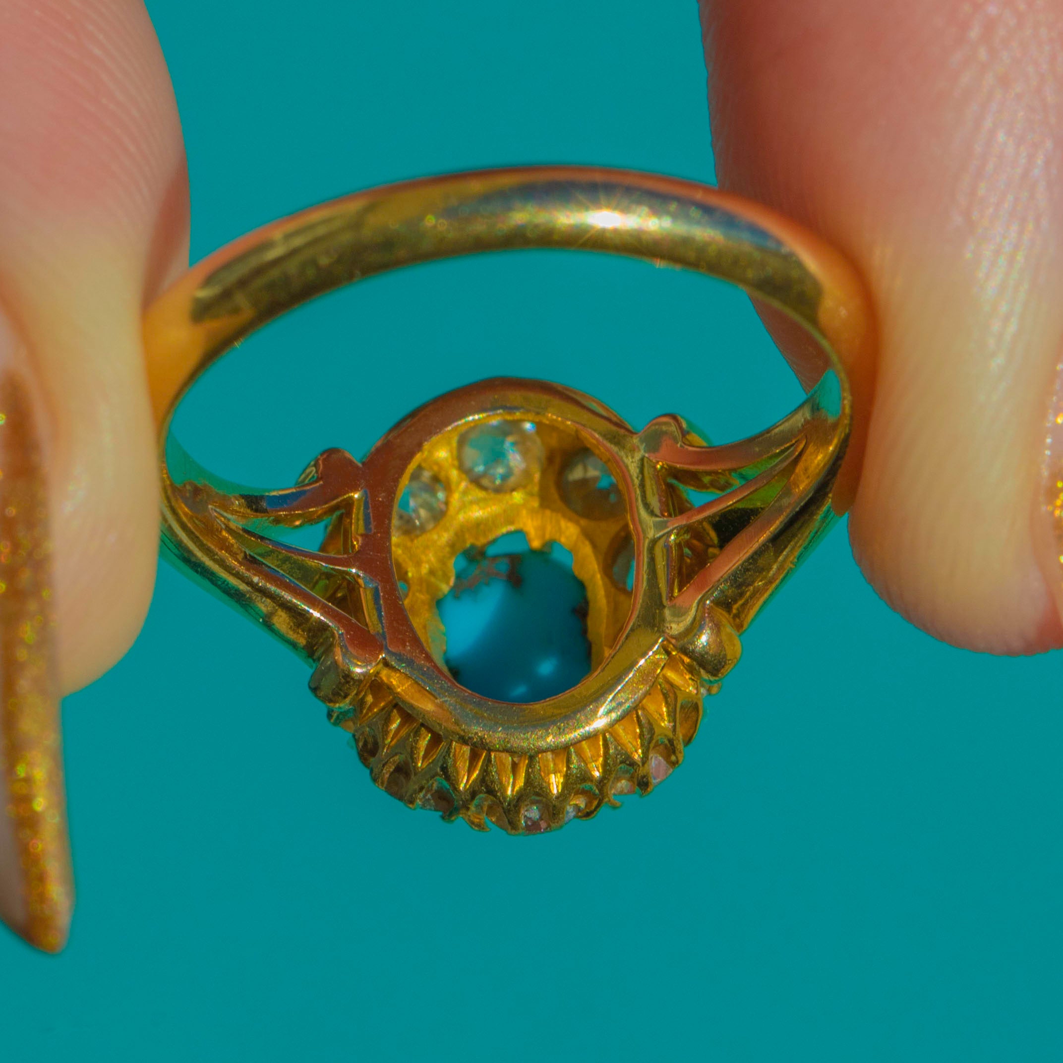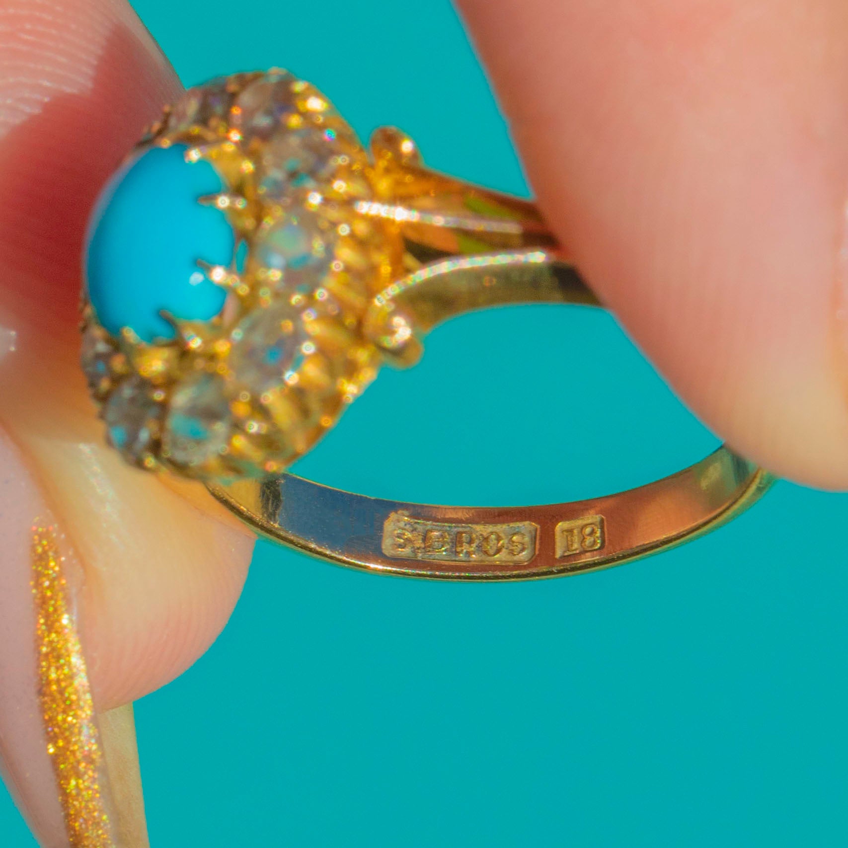 Radiant colour meets antique sparkle in this Late Victorian cluster ring. A vivid sky-blue Turquoise is framed by a halo of bright Diamonds, all set in rich 18ct Gold. The sculpted split shoulders and decorative open gallery lend delicate detail while keeping the focus on that glorious pop of blue.