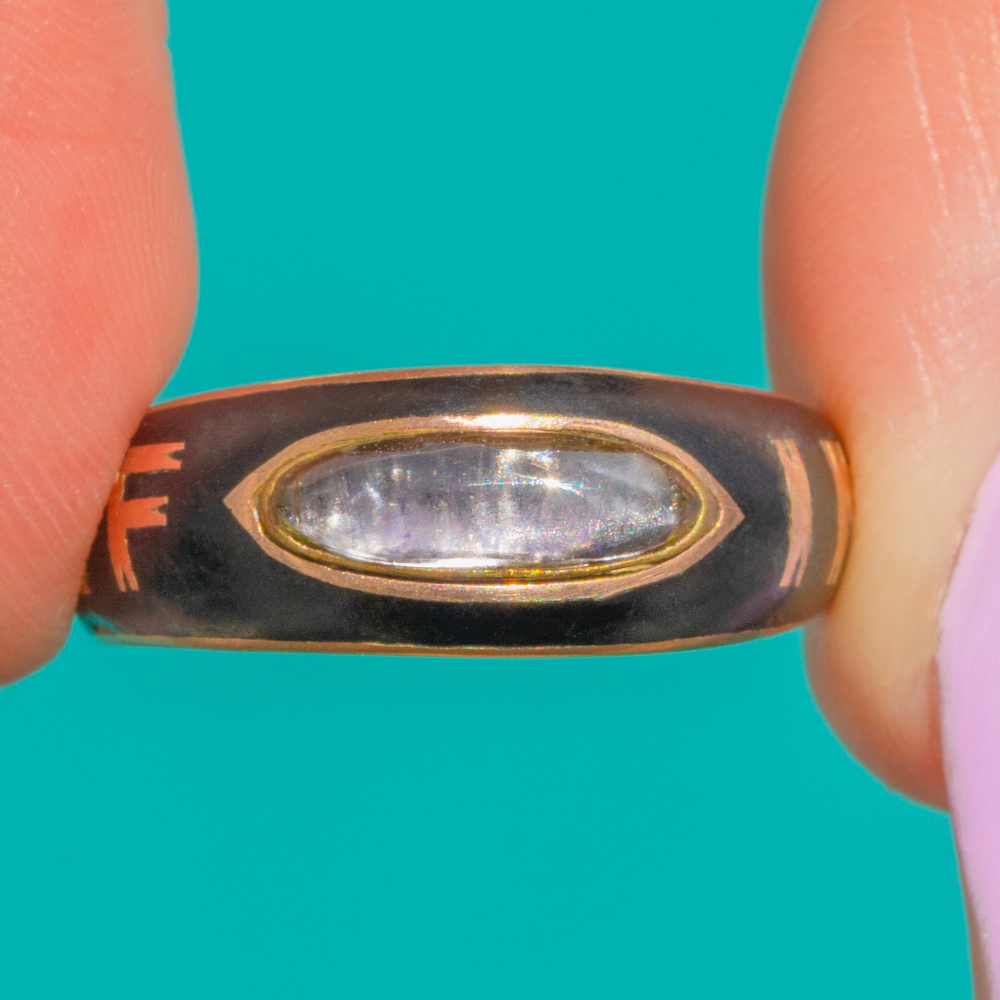 EXCELLENT: Well cared for with minimal wear commensurate with age. The foiled Amethyst and black Enamel present beautifully, and the setting and band are secure. A superb example of a Victorian mourning ring with clear hallmarks and a graceful finish.