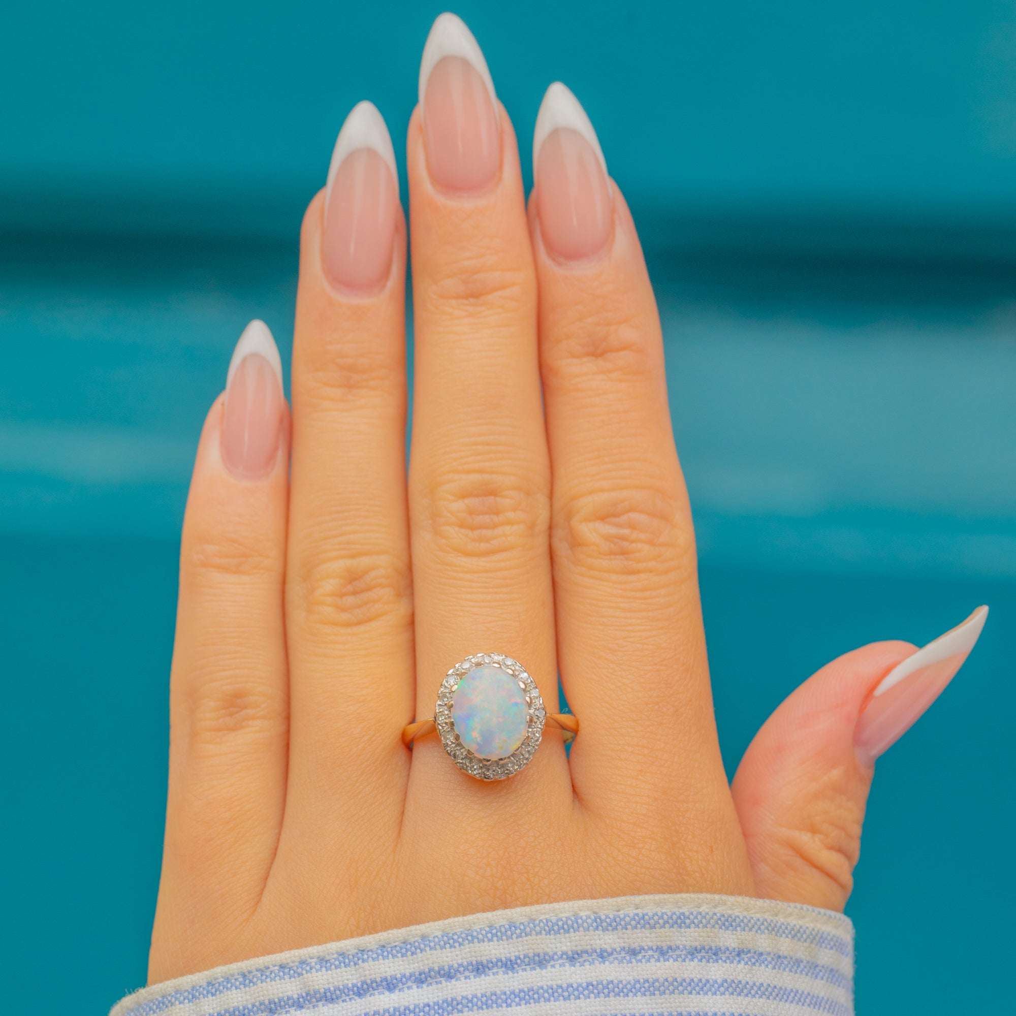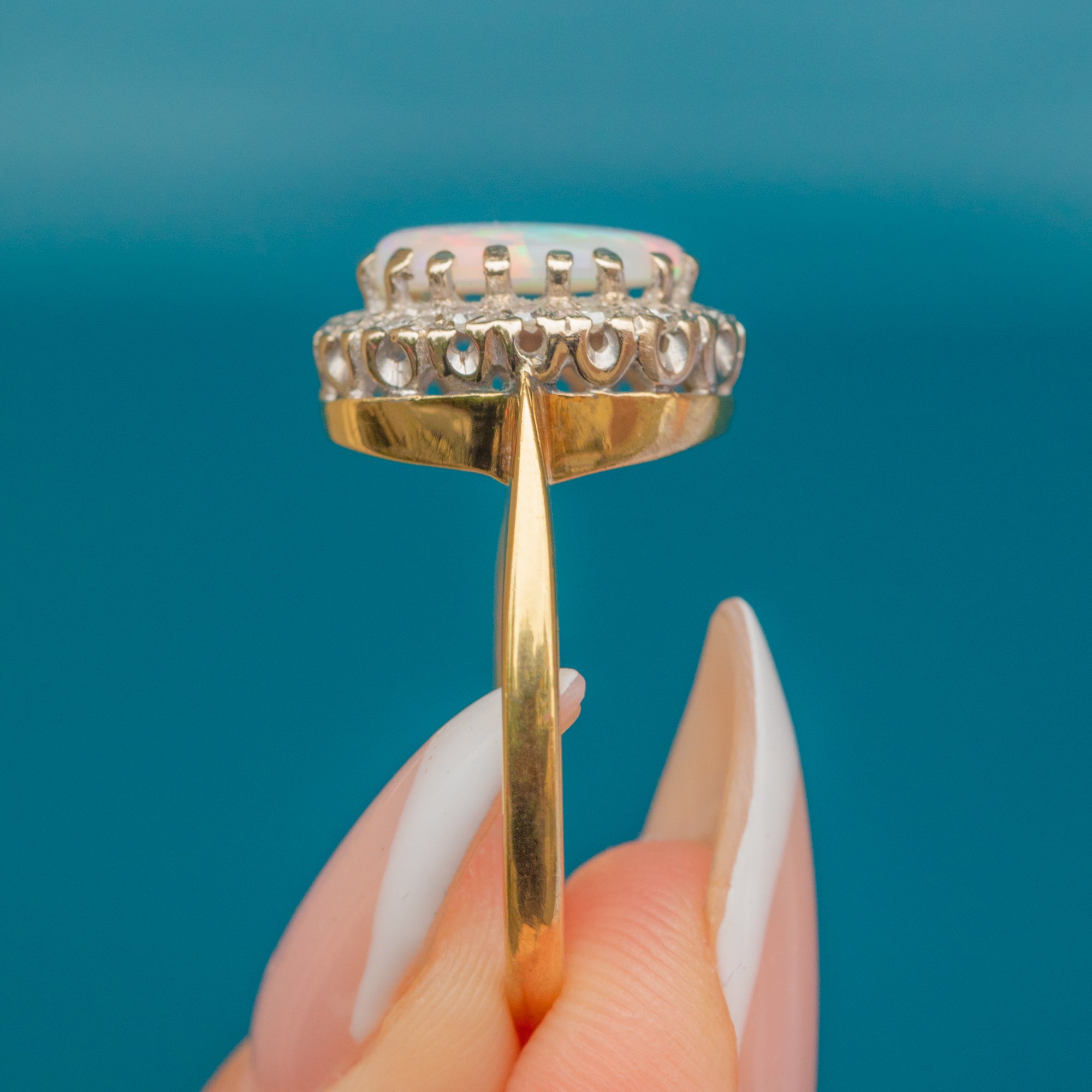 This Mid-Century Vintage ring is crafted in 18ct Gold and showcases a mesmerising cabochon Opal, glowing with flashes of pastel pink, green and blue. Surrounding the Opal is a delicate halo of twinkling Diamonds, lending both brightness and elegance to the design. A timeless cluster style that will look striking adorning your hand.