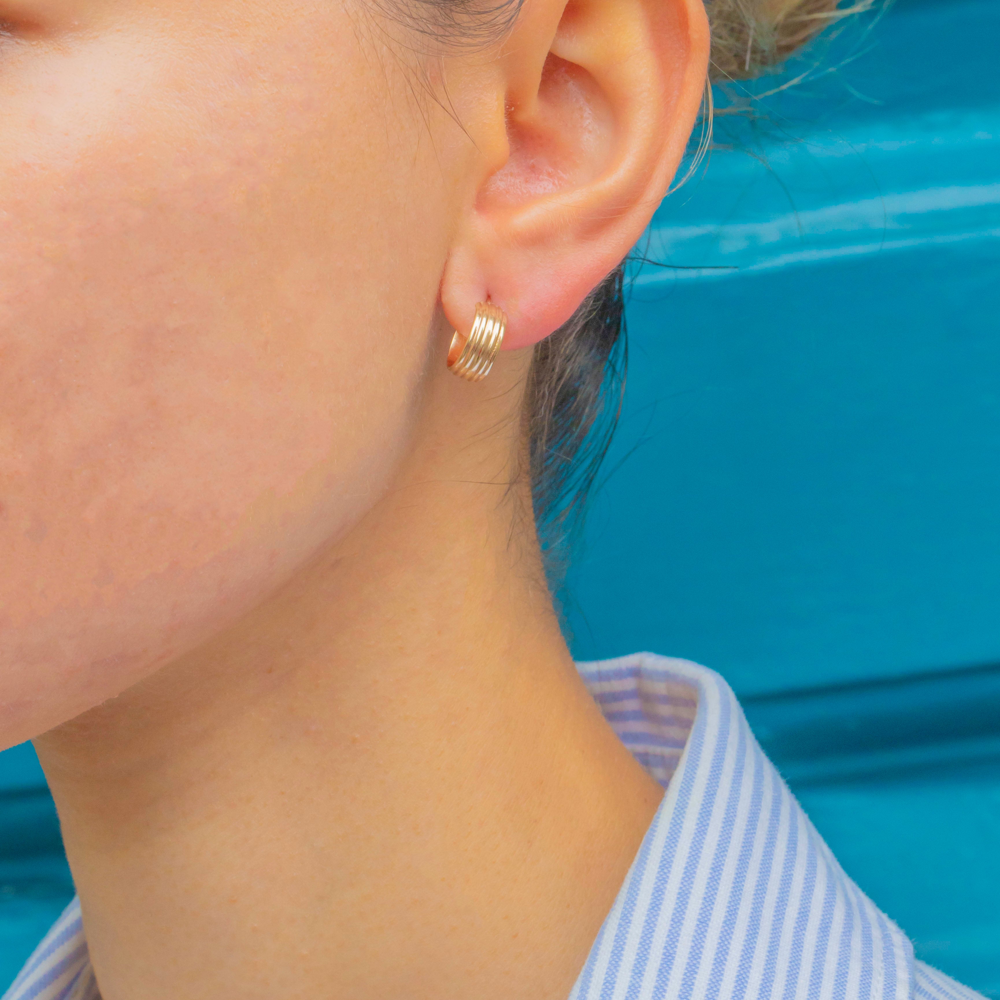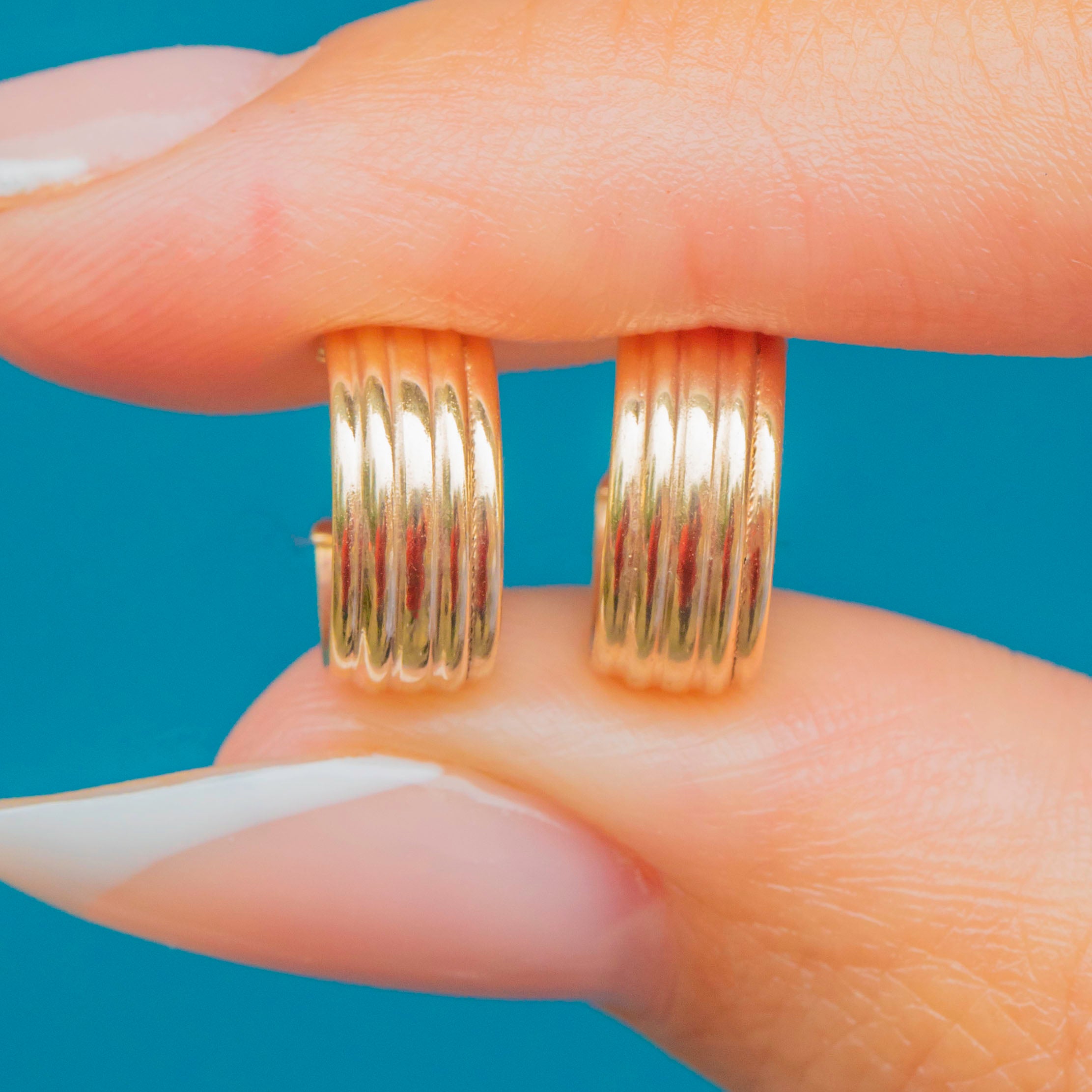 These stylish Mid-Century hoop earrings are crafted in 9ct Gold, bringing a warm and timeless elegance to your jewellery collection. Their bold ribbed design gives them a striking texture, while their petite proportions make them versatile for both everyday wear and more formal occasions. A true vintage treasure, these earrings embody the sleek minimalism of the mid-20th century.