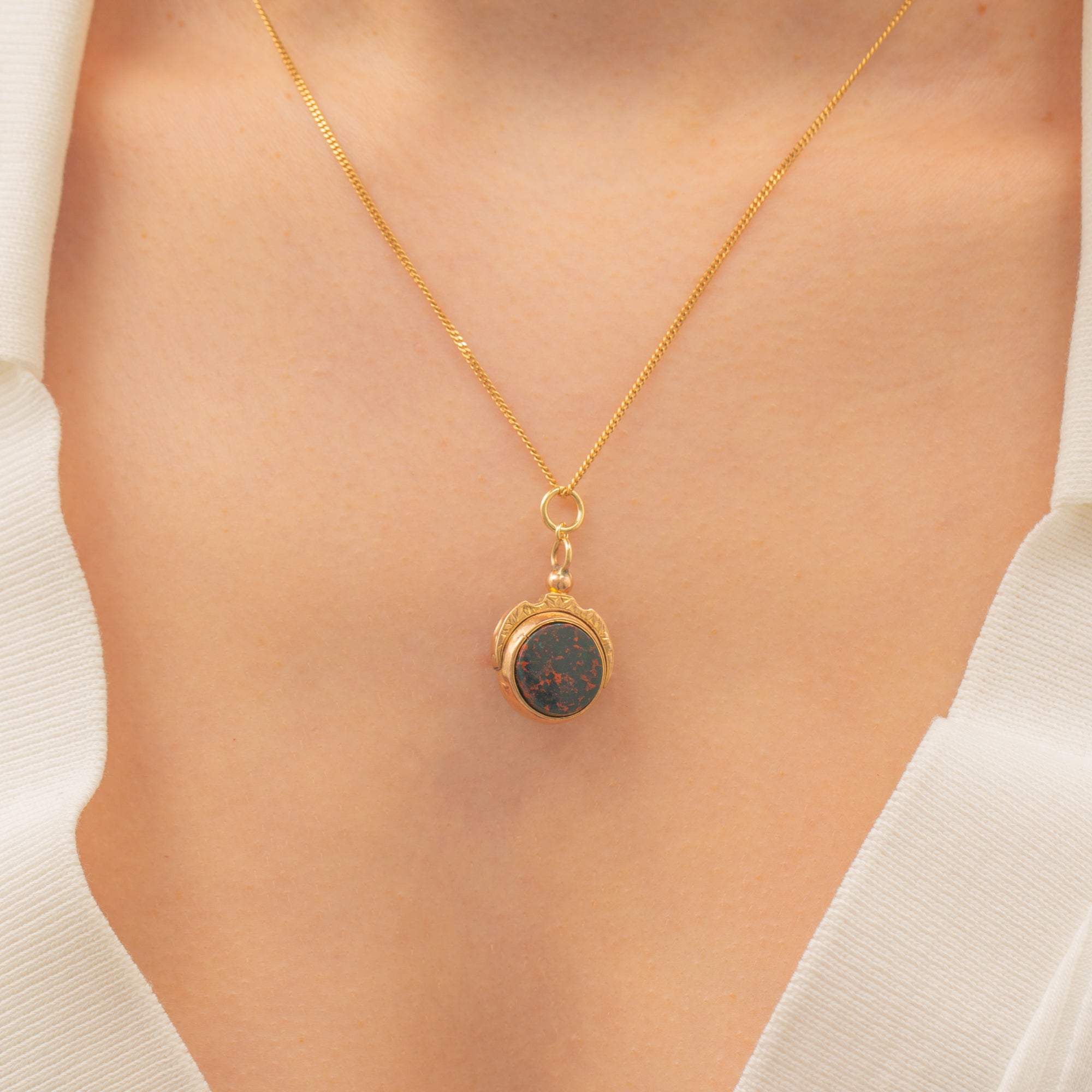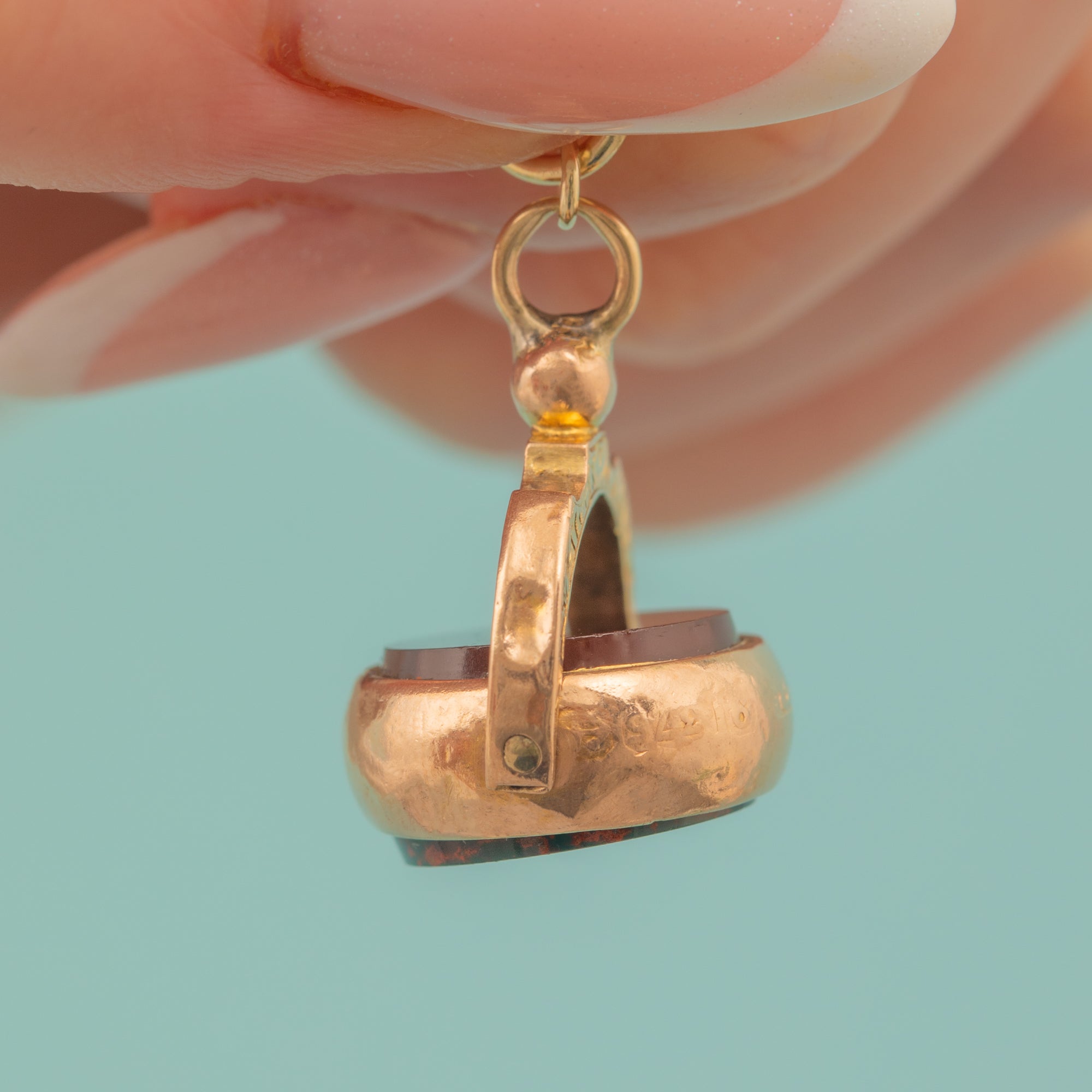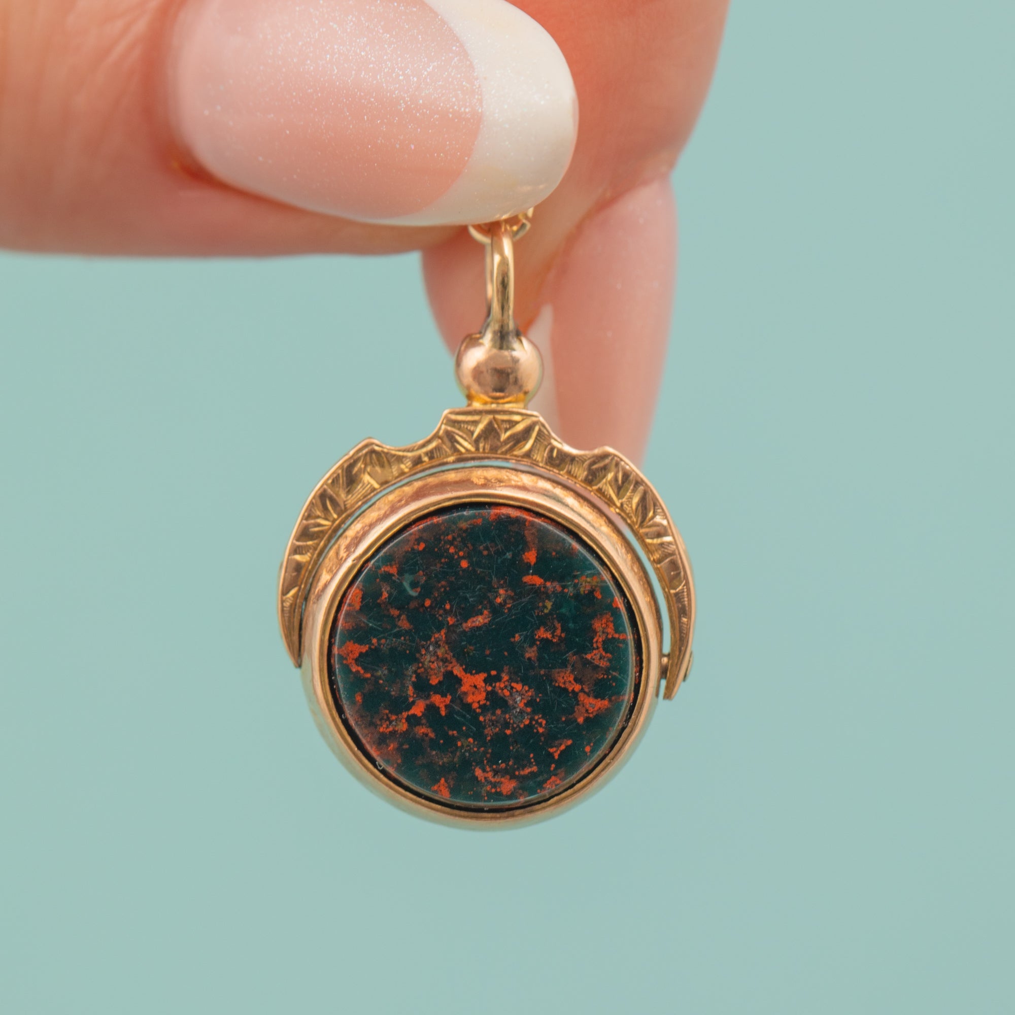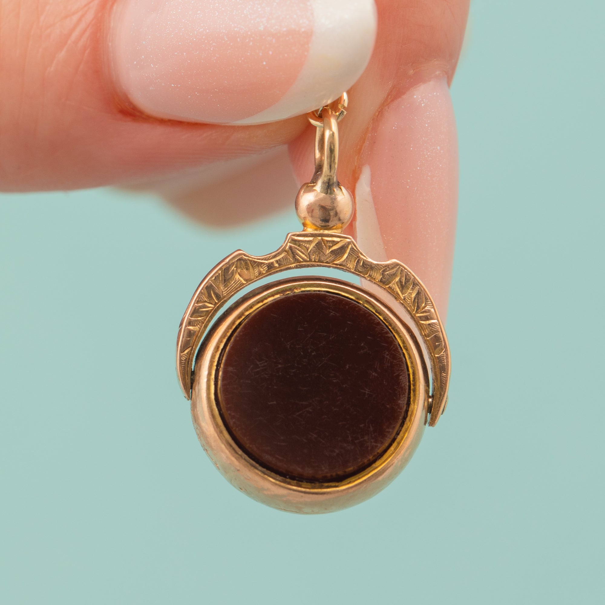 This fob pendant spins to reveal a Carnelian on one side and a Bloodstone on the other, each with a rich saturated hue. They are set within buttery 9ct Gold settings, complete with an ornately engraved bale in quintessential Victorian style.