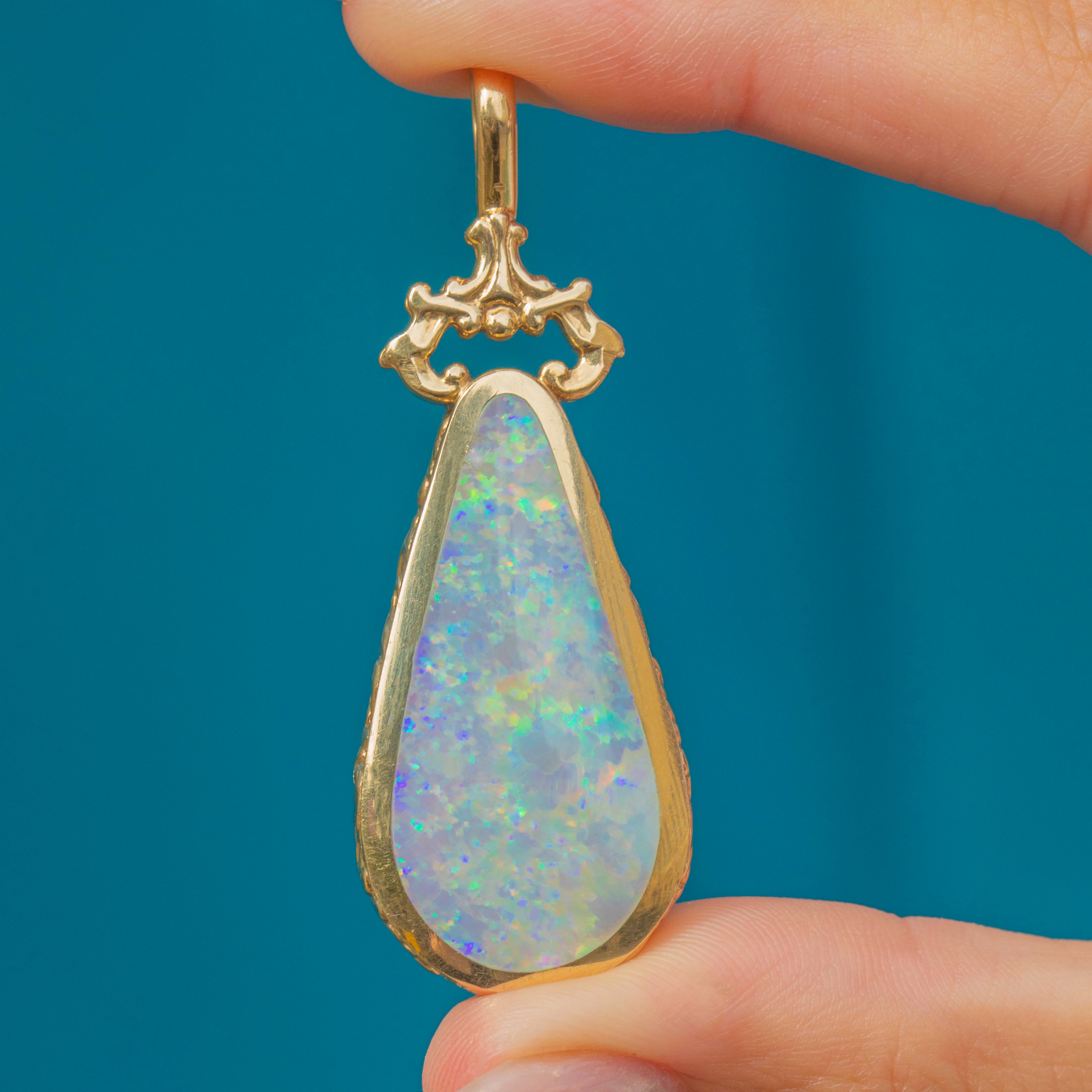 EXCELLENT: The stones are in superb condition with no chips or scratches, showing bright Opal fire and strong Lapis colour. The engraved Gold border is crisp, and the hallmarks are clear and legible. A very well-cared-for pendant.